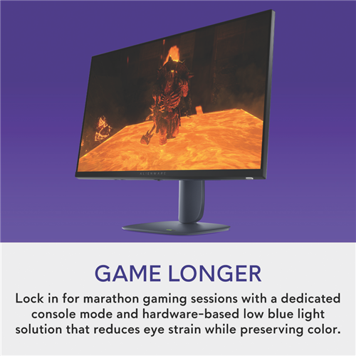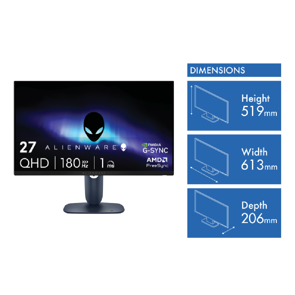 Experience gaming like never before with this Alienware 27 QHD Gaming Monitor. The Fast IPS screen delivers stunning 2560 x 1440 resolution with a lightning-quick 180Hz refresh rate through DisplayPort (or 144Hz via HDMI) giving you the competitive edge. Response times as fast as 1ms in Extreme Mode mean you'll catch every detail in fast-moving games. With NVIDIA G-SYNC and AMD FreeSync compatibility say goodbye to screen tearing and stuttering. The monitor's 400 nit brightness and 1000:1 contrast ratio create vivid visuals while ComfortView Plus and Low Blue Light features protect your eyes during marathon sessions. Easily adjust the screen with tilt pivot height and swivel options to find your perfect viewing angle. Connectivity is sorted with DisplayPort dual HDMI and USB ports including one with Battery Charging support. Anti-glare coating Picture-in-Picture capability and security features round out this gaming powerhouse. Comes with all cables you need plus a 3-year warranty for peace of mind. Model AW2725DM.