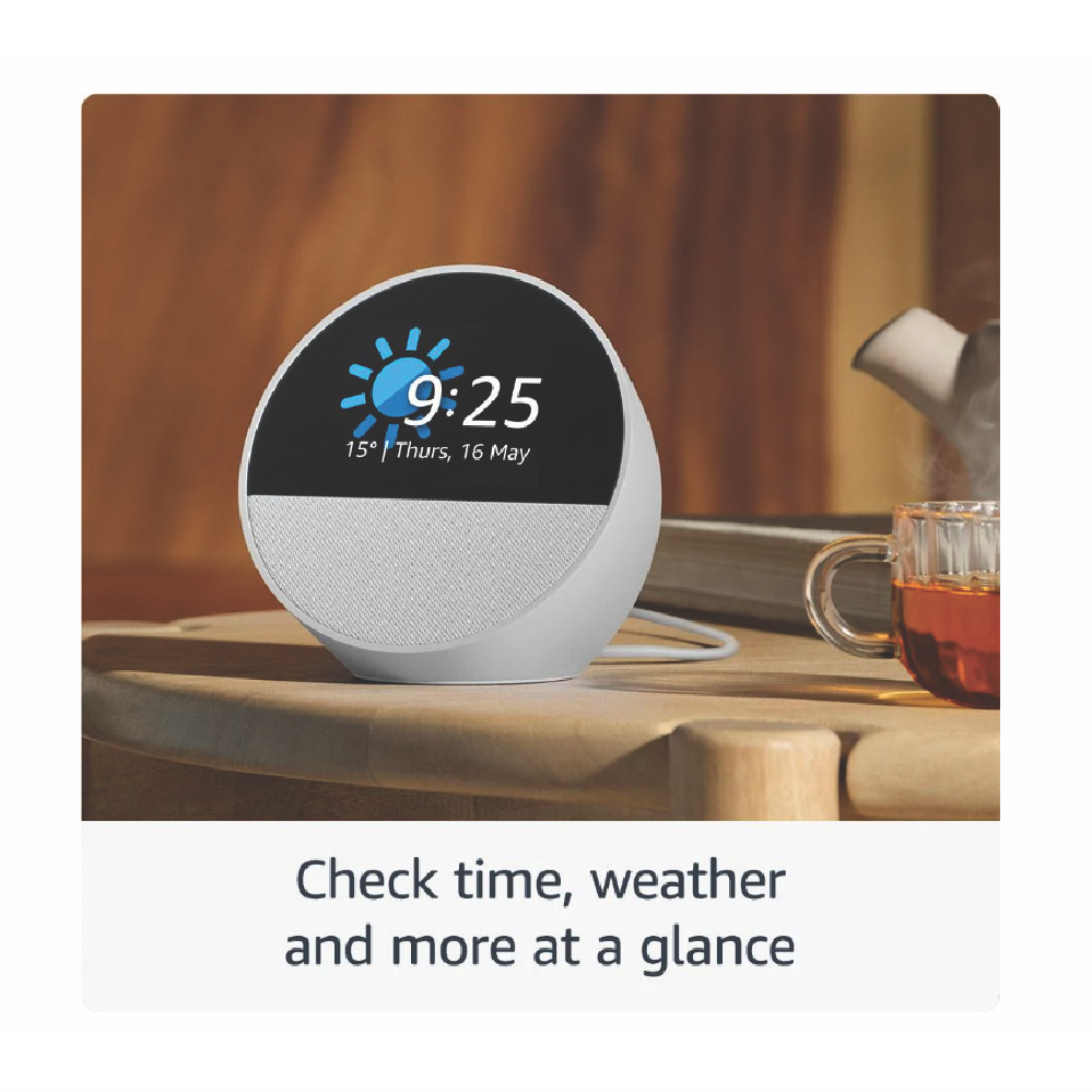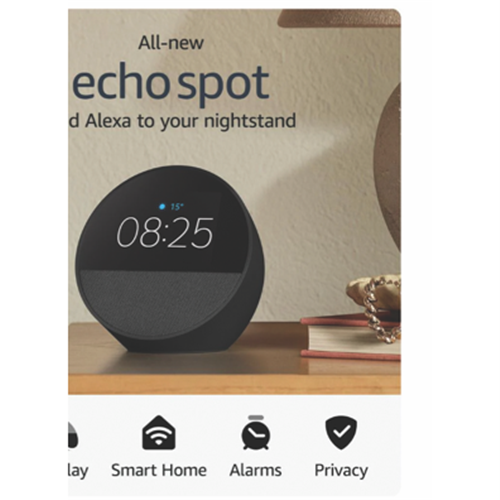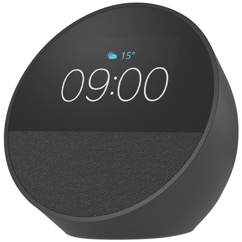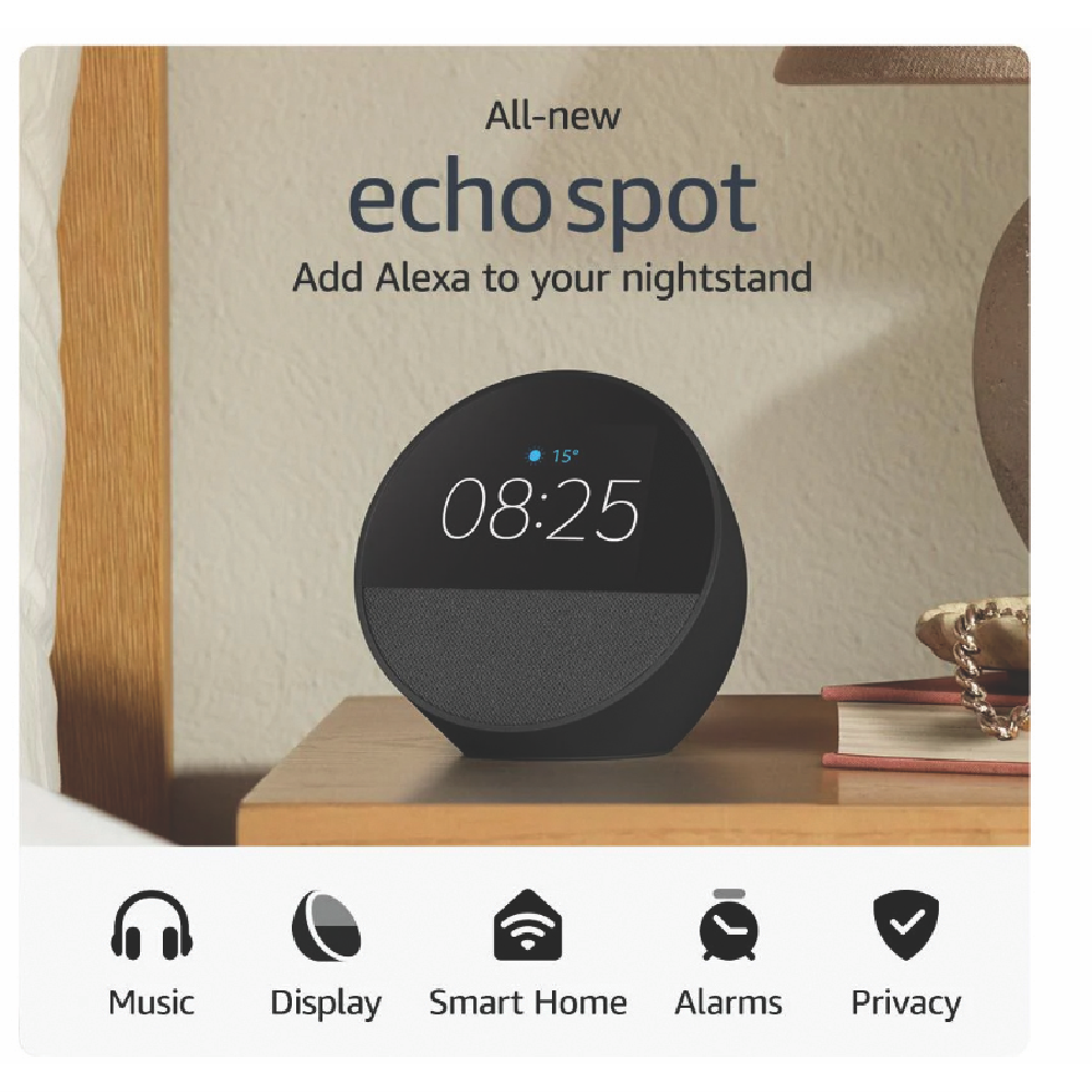 Meet the Amazon Echo Spot in sleek black your compact smart speaker that brings Alexa into any room. This clever little device responds to your voice commands letting you ask questions play music check the weather or control your compatible smart home devices. Part of the popular Amazon Echo family it fits perfectly on a bedside table or desk without taking up much space. The Echo Spot comes with a full 1-year manufacturer's warranty for peace of mind. Model number: B0C2RXN77R.