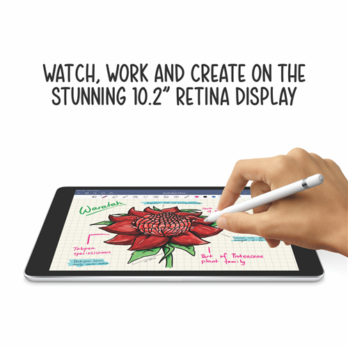 Powerful. Easy to use. Versatile. Designed for all the things you love to do. Work play create learn stay connected and more. All at an incredible price. The A13 Bionic chip delivers faster CPU and graphics performance plus a more powerful Neural Engine(1). And with all-day battery life you can create work play and more(2). The immersive 10.2-inch Retina display is perfect for painting with precision working on a project or watching a movie. Enjoy more engaging video calls with Centre Stage and the 12MP Ultra-Wide front camera. The 8MP back camera captures sharp vivid images and video. Unleash your imagination with Apple Pencil. Create a work of art draw what you see or write down what you hear. Type up your next great book - or the next great book report - with the slim light Smart Keyboard(3). iPadOS is powerful and easy to use straight out of the box. And with over a million apps on the App Store designed just for iPad you'll find the right app for anything you want to do(4). DISCLAIMERS: (1) Performance claims based on comparison with the previous generation. (2) Battery life varies by use and configuration; see apple.com/au/batteries for more information. (3) Accessories sold separately. (4) Apps are available on the App Store. Title availability is subject to change.