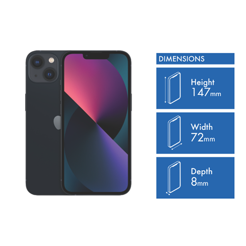 A remarkably bright display in a durable design. Hollywood-worthy video shooting made easy. A lightning-fast chip. And a big boost in battery life you'll notice every day. A more vivid OLED display that's both easier to see in full sunlight and power-efficient. With a durable design that's water and dust resistant(4). Automatically create beautiful depth effects and focus transitions in your videos. Bring a new level of storytelling to the scenes you shoot. A huge upgrade for better photos and videos. More light captured with the Wide camera. Sensor-shift optical image stabilisation. And more detail in dark areas of your photos with the Ultra Wide camera. A big boost in battery life you'll notice every day. That means more time to watch play and do more of what you love. Even on iPhone 13 mini. A15 Bionic powers graphics-intensive games and new camera features like Cinematic mode and Photographic Styles. And it's more efficient helping deliver longer battery life. Everything happens so much faster on 5G(3). It's fast enough for multiplayer gaming and more. And Smart Data mode automatically saves battery power when you don't need all that speed. DISCLAIMERS: )1)Data plan required. 5G is available in selected markets and through selected carriers. Speeds vary based on site conditions and carrier. For details on 5G support contact your carrier and see apple.com/au/iphone/cellular. (2)The display has rounded corners that follow a beautiful curved design and these corners are within a standard rectangle. When measured as a standard rectangular shape the screen is 6.06 inches diagonally. Actual viewable area is less. (3)Battery life varies by use and configuration; see apple.com/au/batteries for more information.(4)iPhone 13 is splash- water- and dust-resistant and was tested under controlled laboratory conditions with a rating of IP68 under IEC standard 60529 (maximum depth of 6 metres for up to 30 minutes). Splash water and dust resistance are not permanent conditions and resistance might decrease as a result of normal wear. Do not attempt to charge a wet iPhone; refer to the user guide for cleaning and drying instructions. Liquid damage is not covered under warranty but you might have rights under consumer law. (5)Some features may not be available in all countries or all areas. (6)Accessories are sold separately.