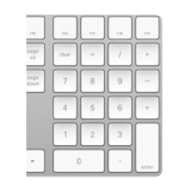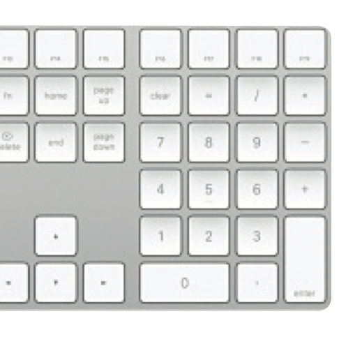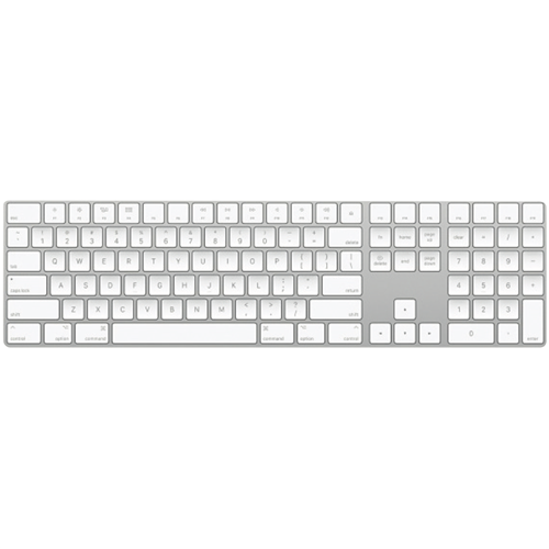Additional Features Magic Keyboard with Numeric Keypad features an extended layout, with document navigation controls for quick scrolling and full-sized arrow keys for gaming