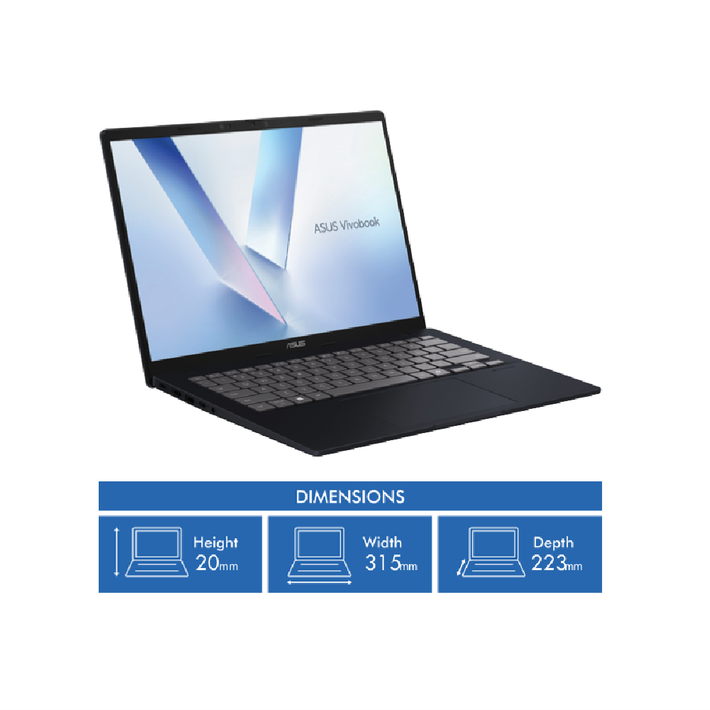 This 14-inch Vivobook laptop gives you the power of Windows 11 and Copilot+ in a portable package that weighs just 1.49kg. The Snapdragon X1 processor works with 16GB of memory to handle everyday tasks smoothly while the 512GB SSD gives you plenty of storage for documents and photos. The anti-glare WUXGA display shows everything clearly with its 1920 x 1200 resolution and the FHD camera with privacy shutter lets you join video calls when needed. Connect your accessories using the two USB-A ports and two USB 4.0 Type-C ports plus HDMI for external displays. With impressive battery life of up to 19.5 hours you can work all day without hunting for power outlets. Finished in Quiet Blue with a slim 19.9mm profile this Wi-Fi 6E laptop is perfect for productivity on the go. Model number: F1407QA-LY068W.