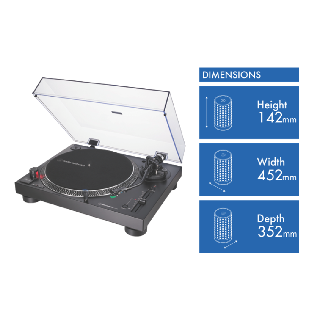 The Audio Technica Professional Direct Drive Turntable ATLP120XUSBBK is a fully manual turntable ready to provide a high fidelity vinyl experience at home. Included is a felt anti slip mat for the top of the anti resonance die cast aluminium platter along with AT's own Dual Magnet phono cartridge. The ATLP120XUSB also makes use of a balanced S-shape tonearm switchable phono preamp with dual outputs plus USB variable pitch control and damped base construction reducing low frequency feedback in playback.