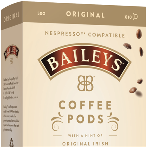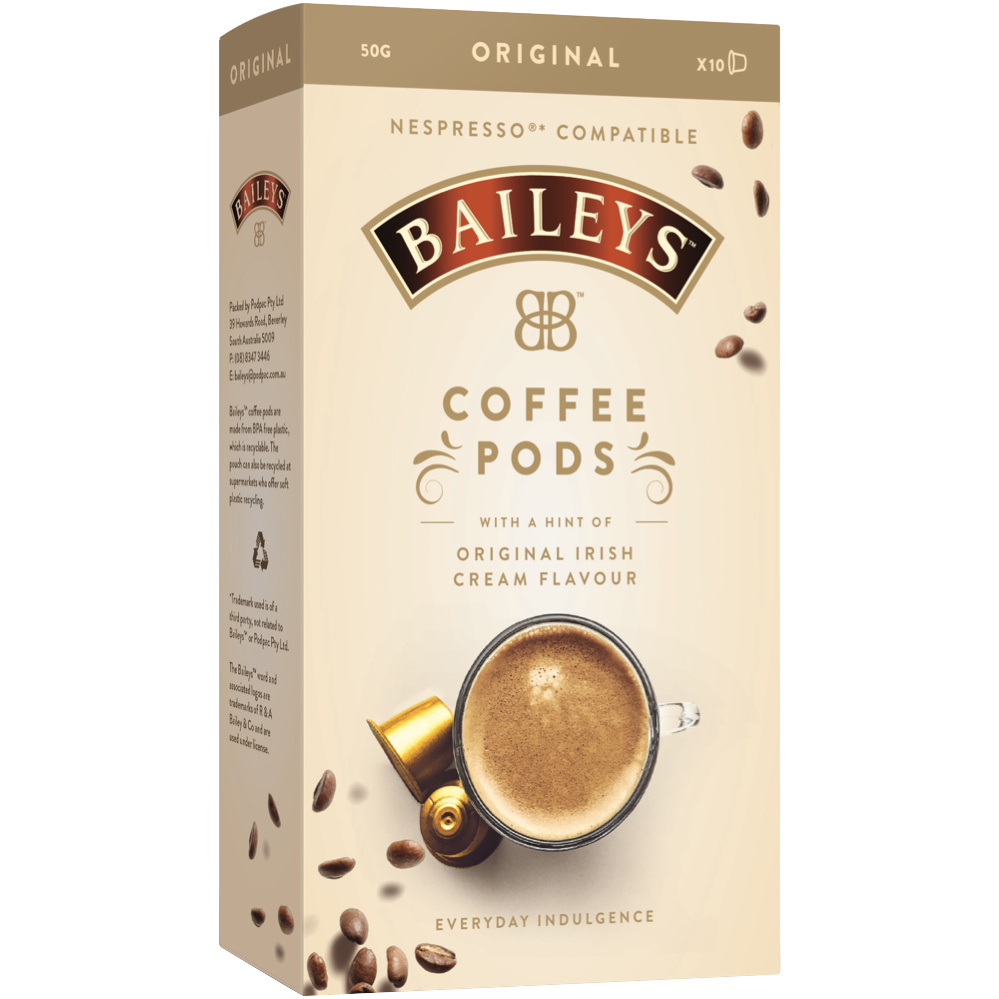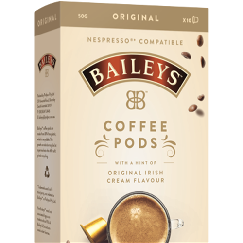 Indulge in a delicious cup of Baileys coffee with these Baileys NC Original Coffee Pods. Each pod contains freshly ground roasted coffee beans infused with the signature Baileys Irish cream flavor and just a hint of alcohol (0.01%) for an everyday treat. Simply pop one of these 10 coffee capsules into your compatible Nespresso machine and enjoy a rich creamy coffee with notes of whiskey and vanilla. The Baileys flavor provides a smooth finish that compliments the full-bodied espresso perfectly. Sip this coffee morning or night for a sweet yet sophisticated pick-me-up. With its rich taste and smooth finish this Baileys coffee is sure to become your new go-to pod. Experience the blend of coffeehouse flavor and Irish cream liqueur that only Baileys can deliver. The manufacturer's part number for this product is 200526. Check out these amazing coffee pods today for a unique coffee experience.