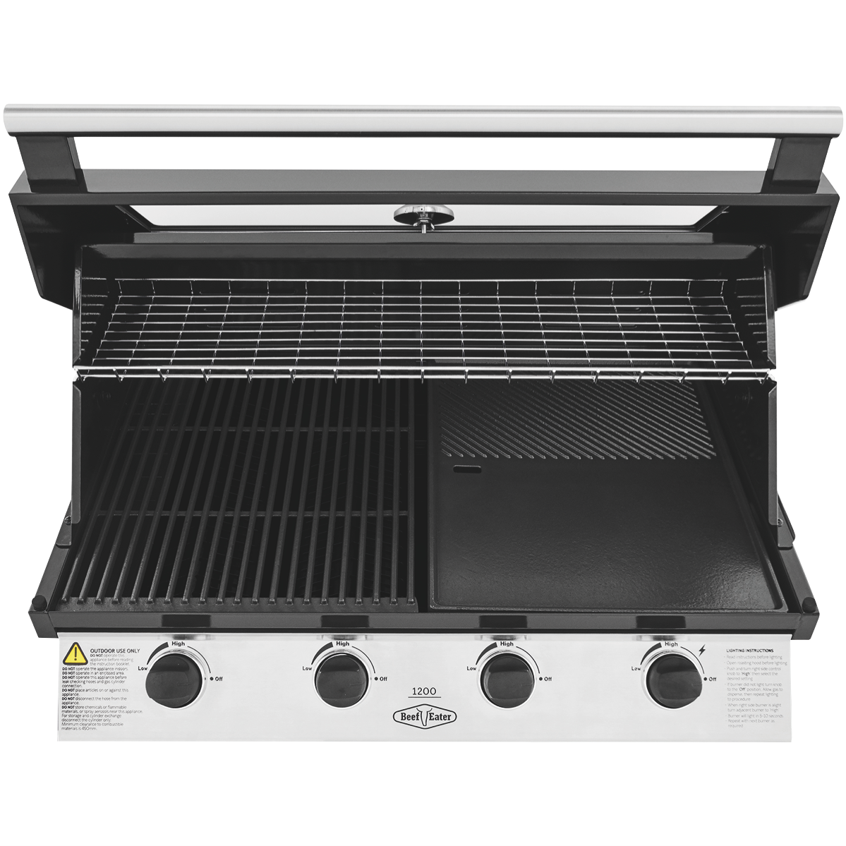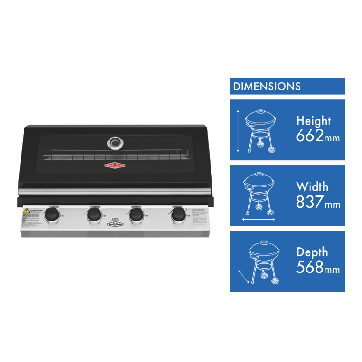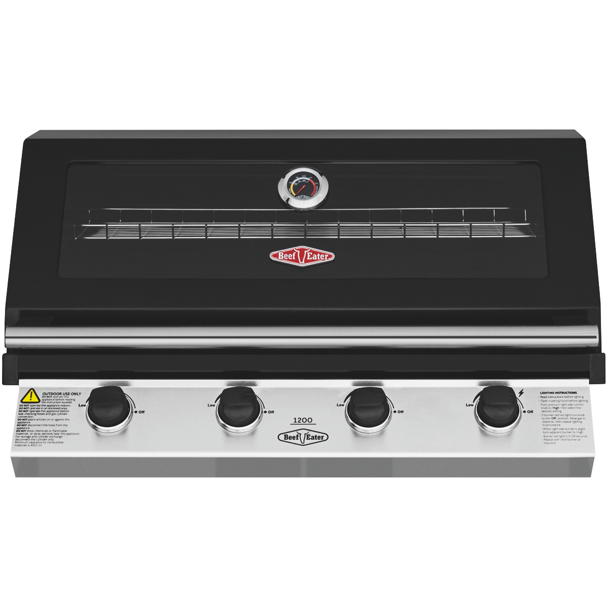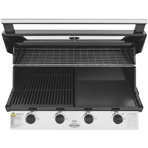 Cook up in style with the BeefEater 1200 Series Stainless Steel 4 Burner Built-in LPG BBQ with Cast Iron Burners & Grills. Sear and seal quickly with cast iron 15 megajoule burners. Evenly grill and bake with the rust resistant cast iron cooktop. Keep an eye with the large viewing window and built-in temperature gauge to ensure the lid stays closed and roasts retain their moistness. It has a warming tray that rolls away when not in use and quartz one press start for simple ignition first time every time. The flame tamer prevents drippings from hitting the exposed fire minimising burning. Built in oil channels assist in keeping the whole setup clean and minimising scrubbing after the delicious barbeque.