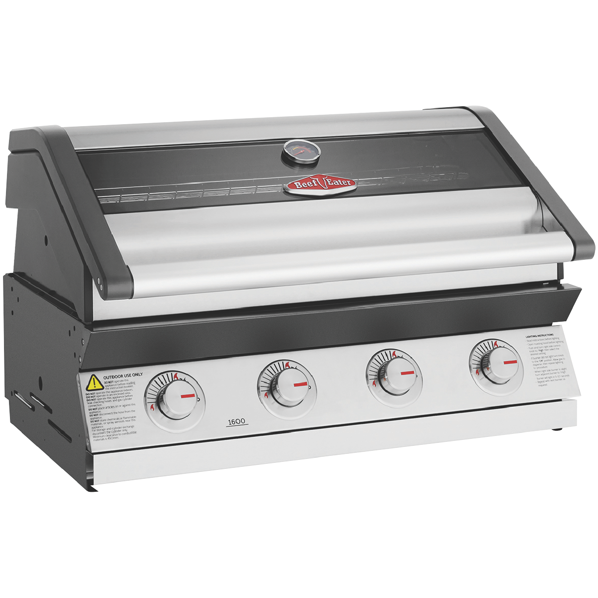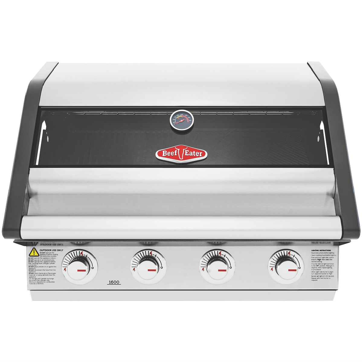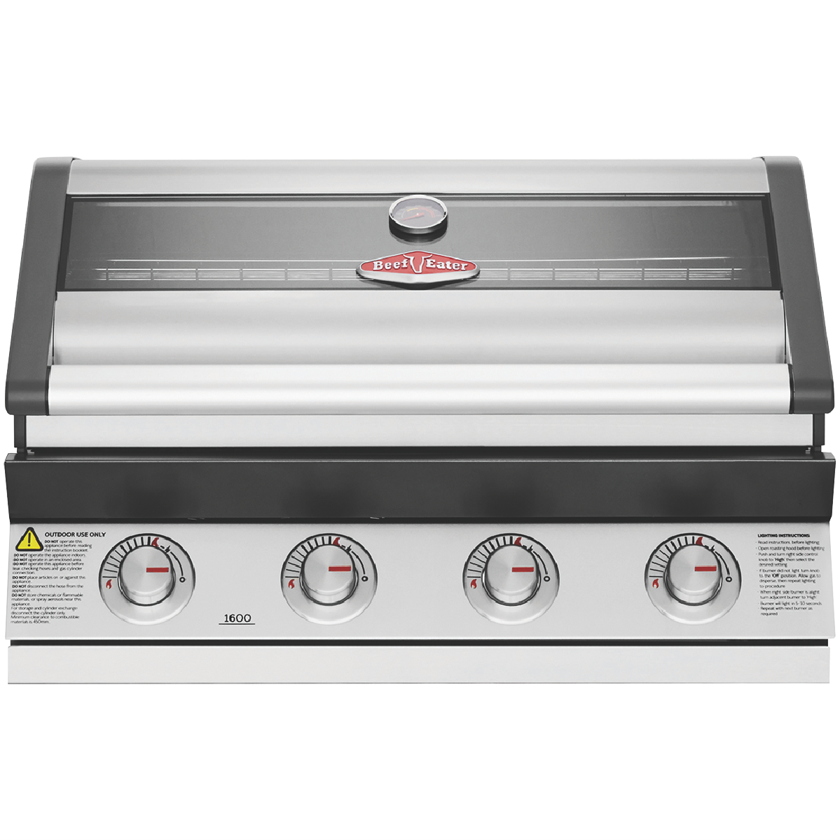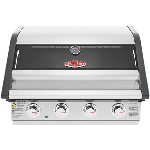 This Beefeater 1600 Series Stainless Steel 4 Burner Built In BBQ with Cast Iron Burners & Grills BBG1640SA is one of the most durable flexible and efficient cooking systems available. Cast iron heats quickly maintains consistency and lasts a very long time. With 15MJ of power in each burner turning the heat up or down is precise and gives choice in what and how you cook it. Stainless steel vaporisers efficiently disperse the flames across the grill and plate surfaces whilst reducing flare ups. Cook up a feast for many for years to come on this spacious and durable cooktop. Made from cast iron the cooking surface doesn't chip and is rust resistant holding its warmth evenly for the best cooking experience. Keep an eye on what s cooking without lifting the lid using the built in temperature gauge and full width glass viewing window to check how those sausages or brisket are doing. The chrome wire elevated cooking rack keeps food warm or can be used as another cooking area. Start cooking quickly and easily with the quartz ignition system for first time every time sparking up. Built to withstand high heat over time the burner box is built of high grade enamel. Fully seam welded throughout moisture and grease don't get into the gaps creating rust. Designed for an easy cleanup the hotplate has raised sides preventing grease and oil over spilling drawing it instead to the plate opening and into the front access catchment tray.