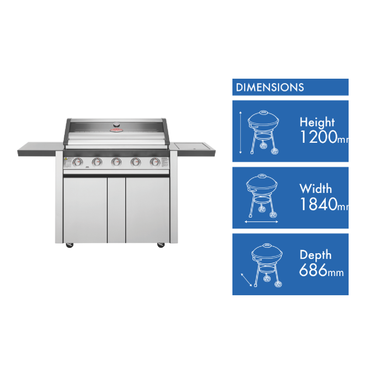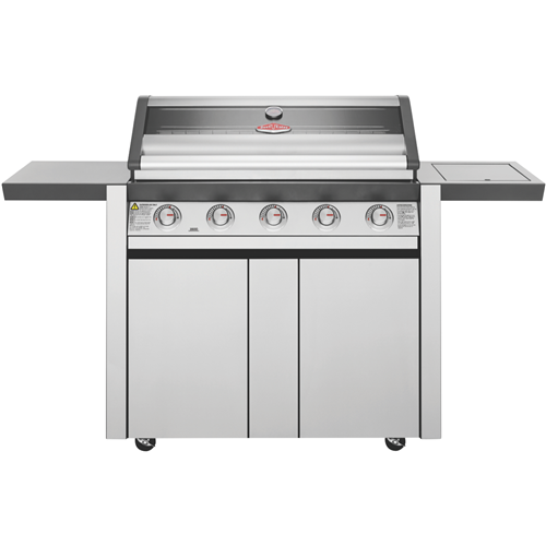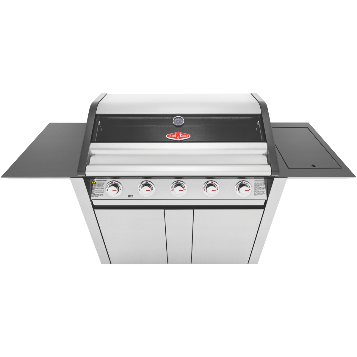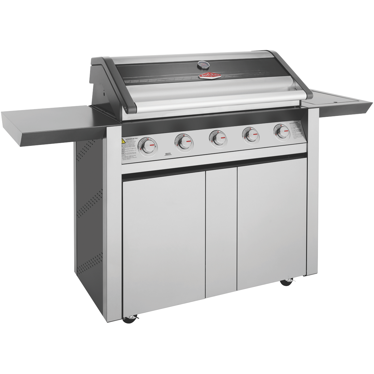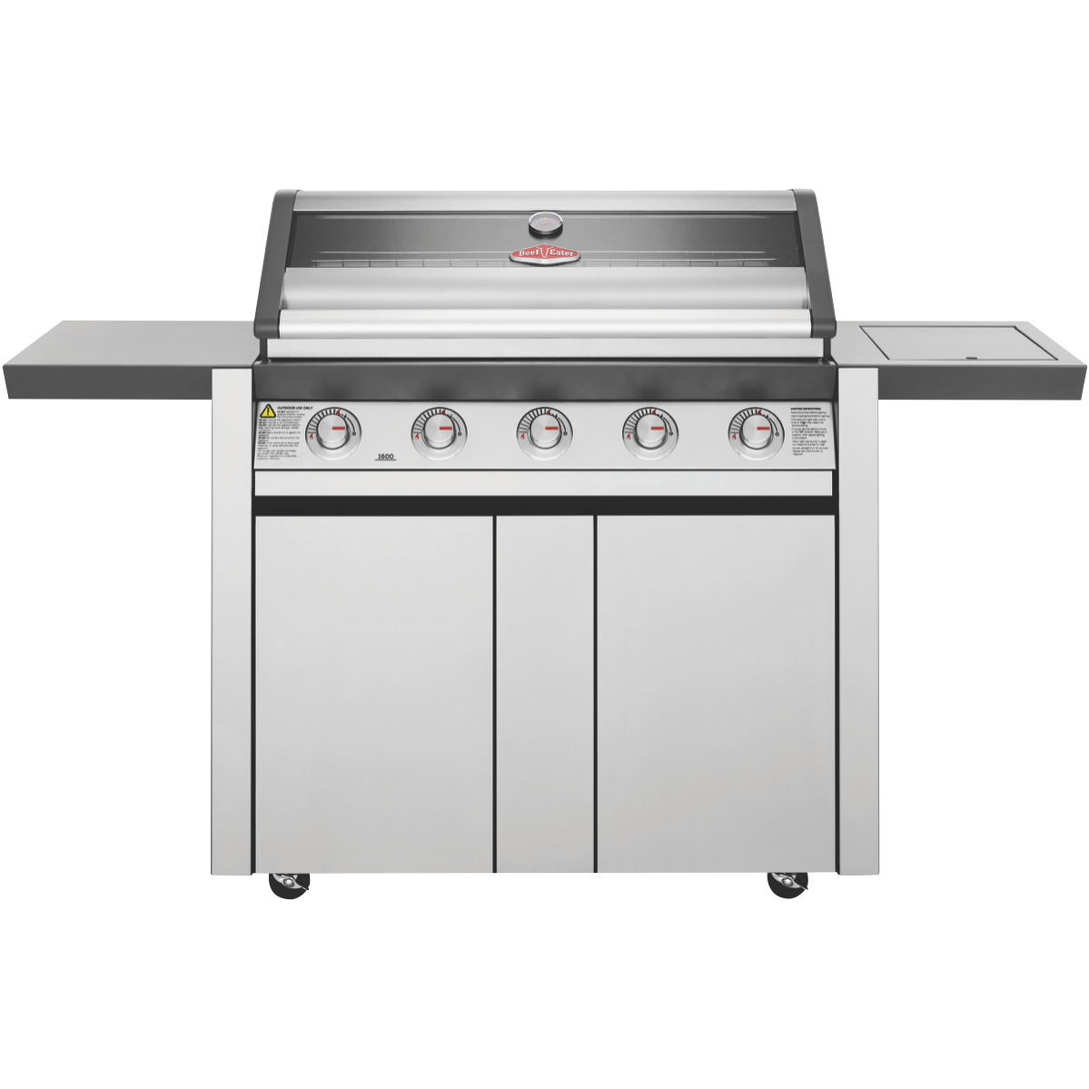The BeefEater 1600 Series Stainless Steel 5 Burner BBQ & Trolley with Side Burner Cast Iron Burners & Grills BMG1651SA is one of the most durable flexible and efficient cooking systems available. The cast iron heats quickly maintains consistency and lasts a very long time. With 15 megajoules of power in each burner you can always turn the power up or down for precise cooking speeds. Stainless steel vaporisers efficiently disperse the flames across the grill and plate surfaces whilst reducing flare ups. Cook up a feast for many for years to come on the spacious durable cooktop. The cast iron cooking surface doesn't chip and is rust resistant yet strongly holds its warmth for the best cooking experience. Keep an eye on what s cooking without lifting the lid and maintain heat using the built in temperature gauge and peer through the full width glass viewing window to check how the sausages or brisket are doing. Start cooking quickly and easily with the quartz one start ignition that works first time every time. Built to withstand high heat over time the burner box is built of high grade enamel. Fully seam welded throughout moisture and grease can't get into the gaps to create rust. Designed for an easy clean-up the hotplate has raised sides preventing grease & oil over spilling drawing it instead to the plate opening and into the front access catchment tray. Turn the hotplate burners up for searing and the grill burners down for slow cooks. Get a practical BBQ trolley with ample storage for gas cylinders and barbeque accessories along with spacious side shelves. The bump stop trolley feature prevents pushing the BBQ directly against the wall providing extra ventilation and preventing damage when rolled back.