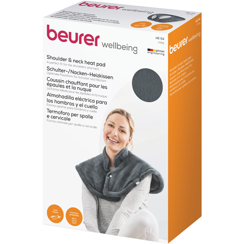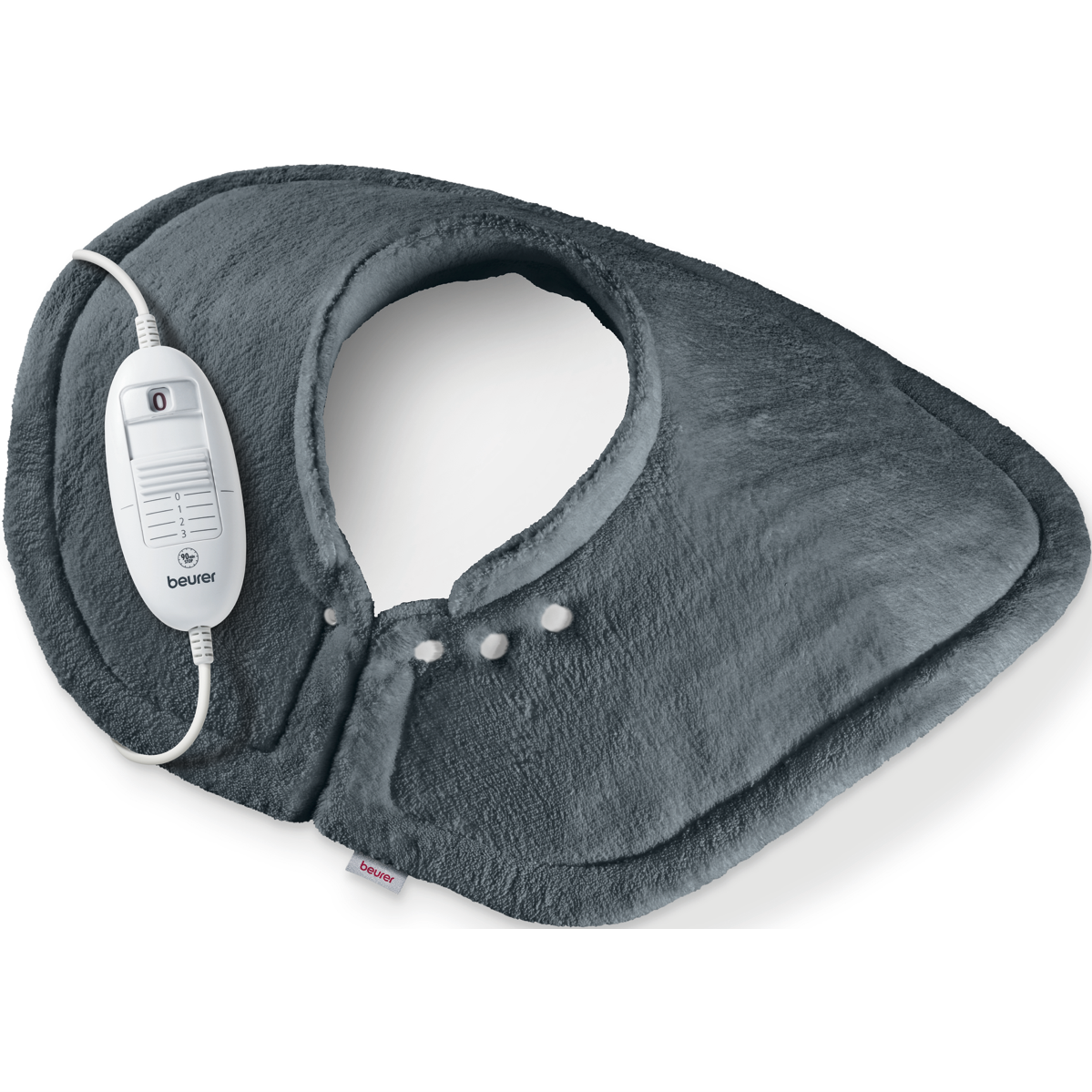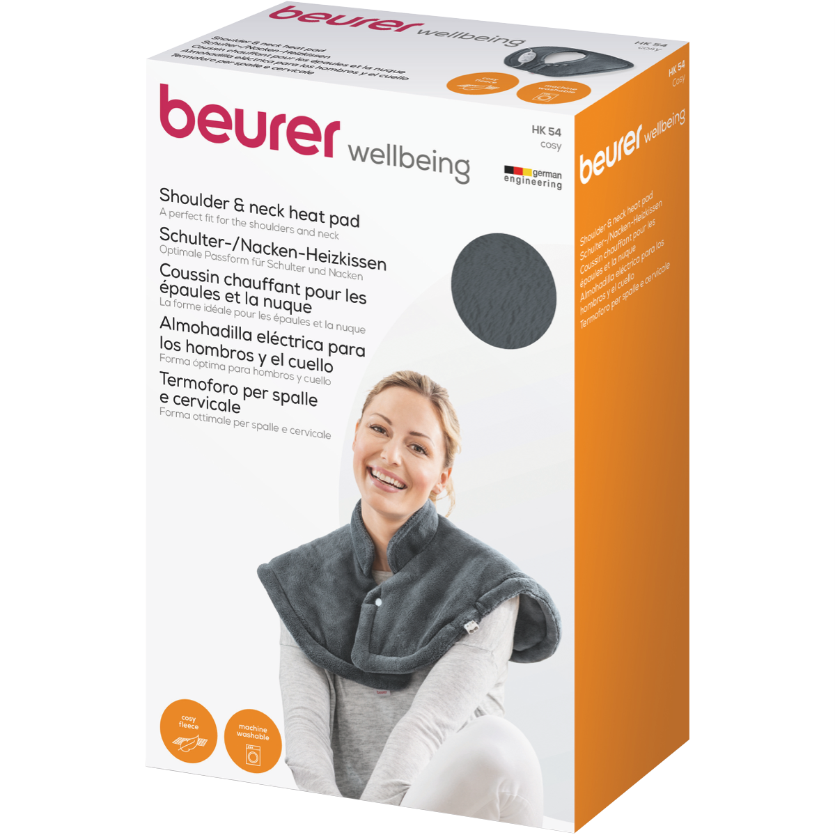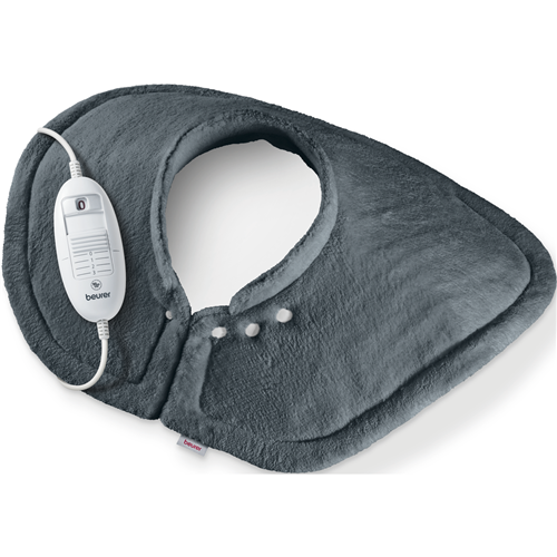 Soothe and relax sore muscles with the comfort of the Beurer Cosy Shoulder and Neck Heat Pad. This grey fleece heat pad envelops your neck and shoulders in plush warmth thanks to its extra soft and breathable fabric. The easy magnetic closure and adjustable press studs allow you to customize the fit for optimal comfort. With rapid heat up and 3 illuminated temperature settings you can find your ideal soothing heat level. The auto shut off kicks in after 90 minutes for added safety and peace of mind. The Beurer Safety System ensures safe use while the detachable design allows for easy washing to keep your heat pad fresh. Give your neck and shoulders the TLC they deserve and enhance your relaxation with this skin-friendly heat pad. Beurer stands behind this product with a 3 year warranty. The manufacturer's part number for this product is HK54. Try the Beurer Cosy Shoulder and Neck Heat Pad today for blissful heat therapy.