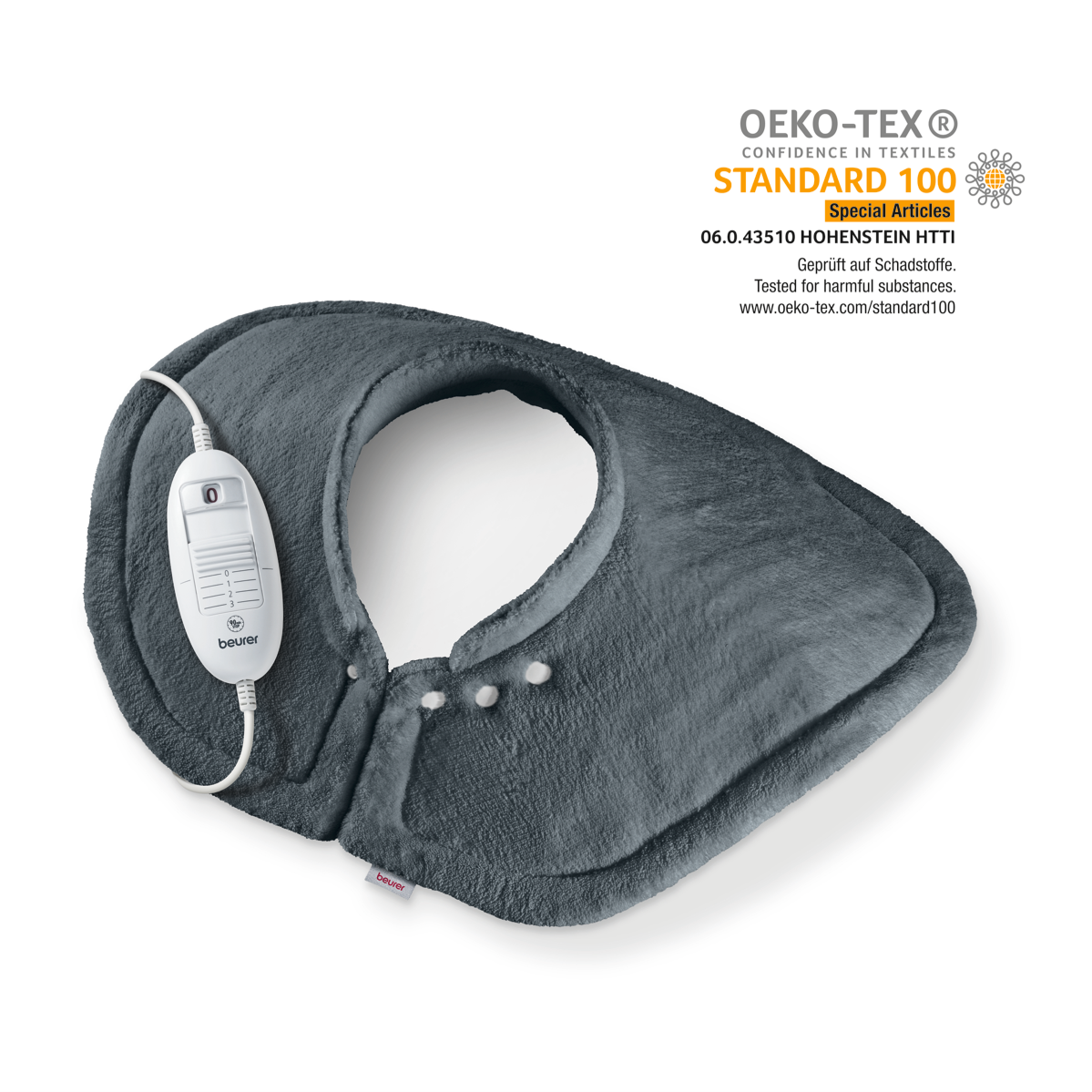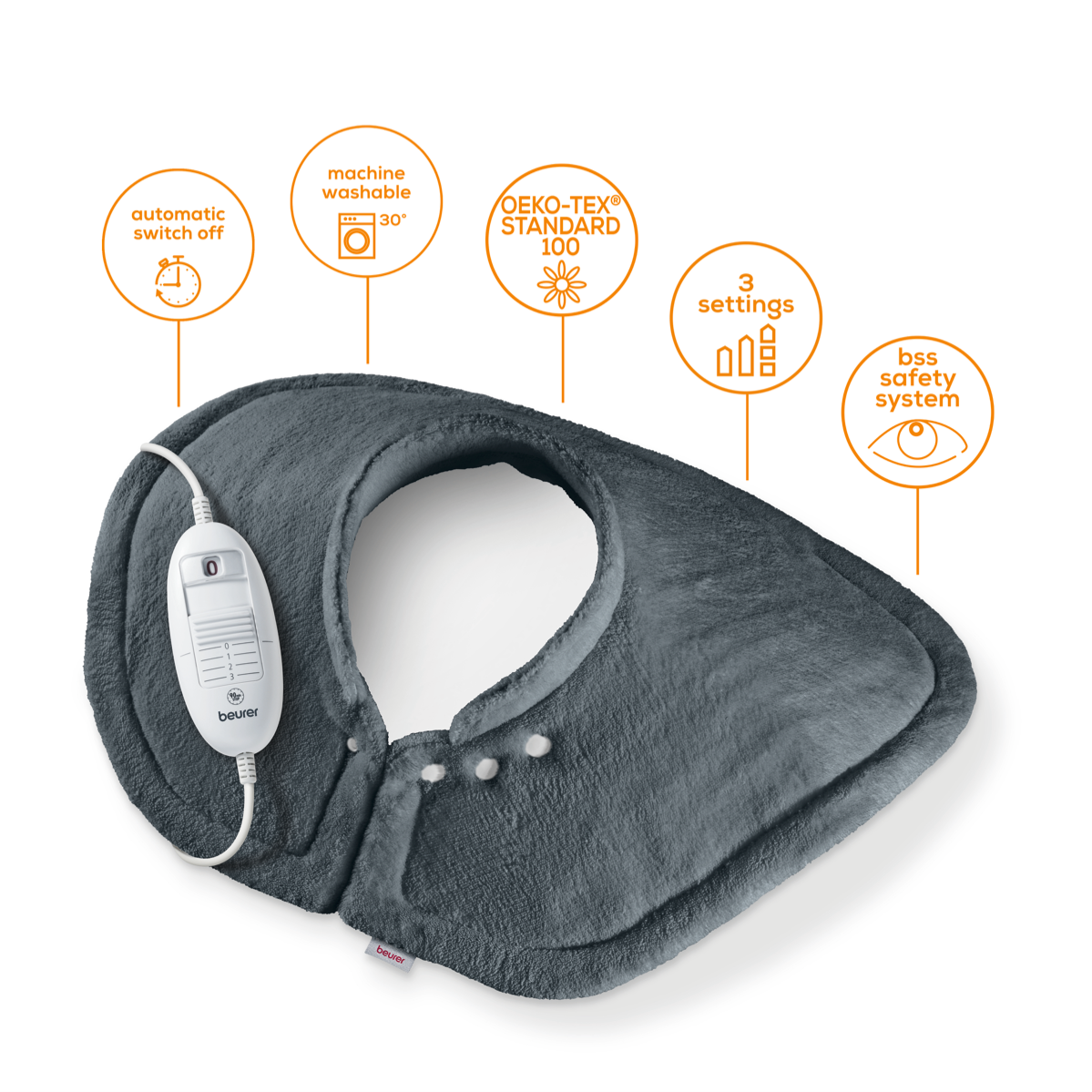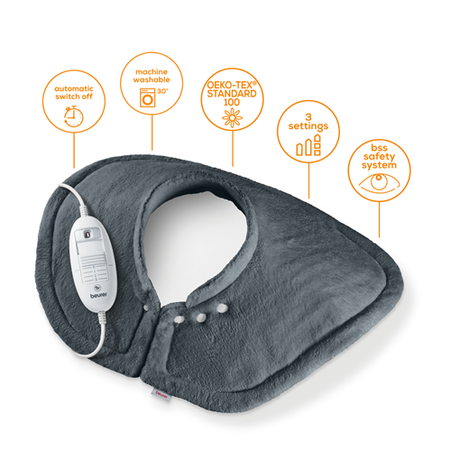 Additional Features Breathable, cosy and skin-friendly, Extra plush, super soft, washable fleece, Cosy wearing comfort - with easy magnetic closure, Individually adjustable by press studs, Electronic temperature control, Rapid heat up, BSS (Beurer Safety System), Detachable