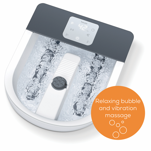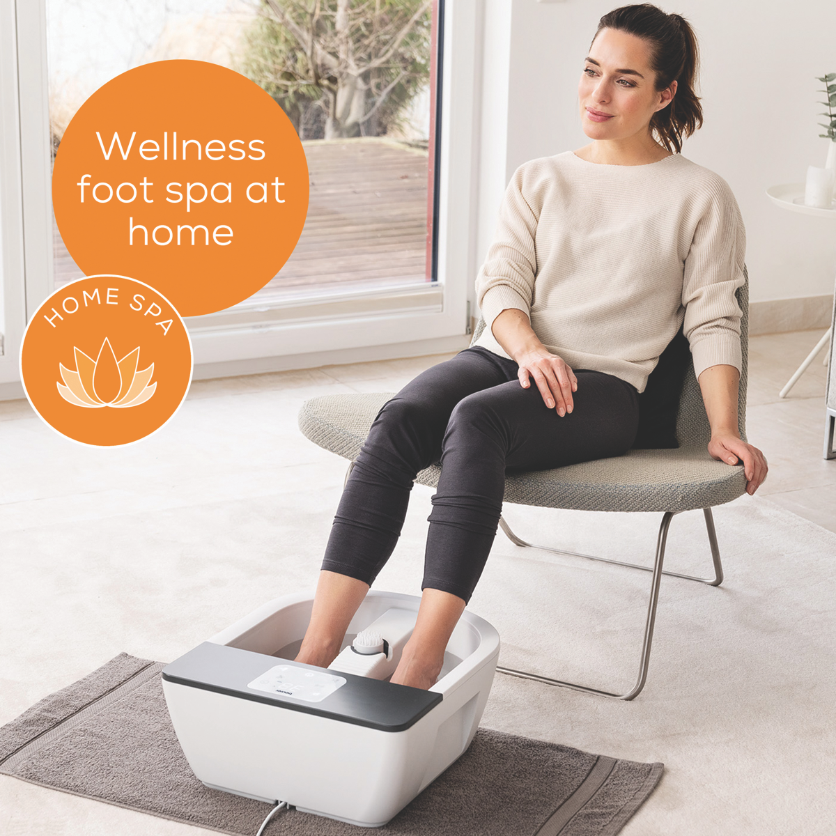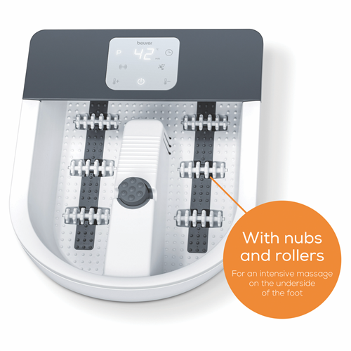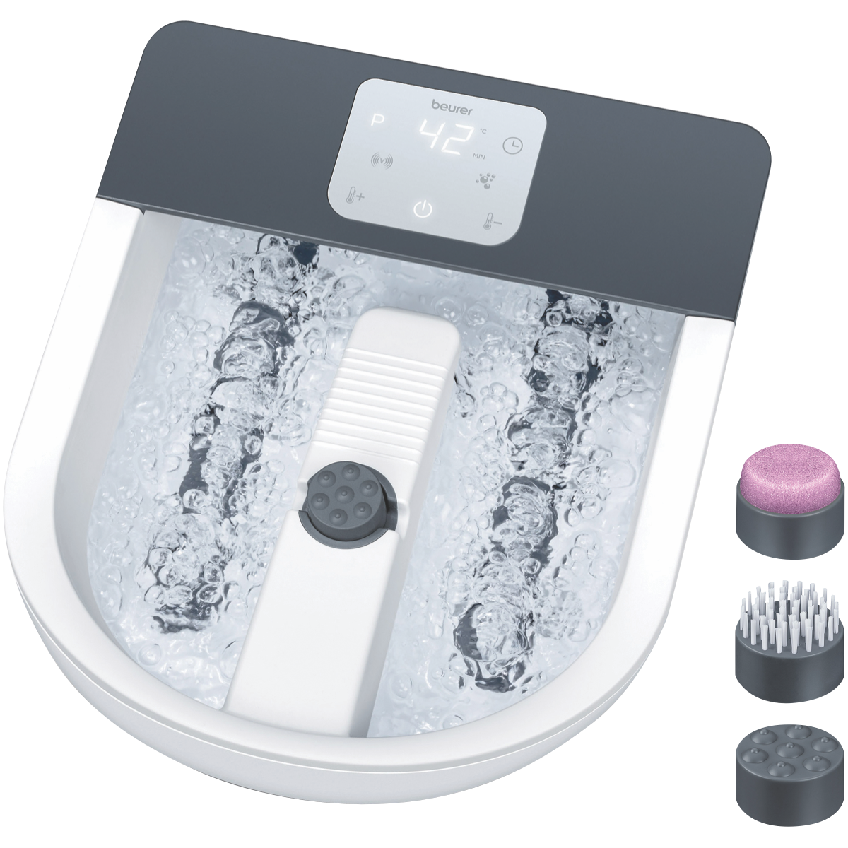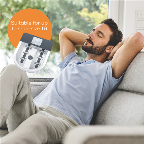 Relax your tired feet after a long day with the Beurer Deluxe Foot Spa. This foot spa pampers your feet with its preset massage programs and manual massage settings while its three temperature zones and eight-stage heating system allow you to customize the perfect temperature up to 48°C. Extra-wide rollers gently massage your feet while the nubs provide reflexology-like pressure to specific points on your feet to help relieve tension. The non-slip rubber feet keep the foot spa securely in place and the cord winder keeps the cord neatly organized when not in use. With a capacity suitable for feet up to shoe size 16 this foot spa will envelop even the biggest feet in soothing warmth and relaxation. The touch screen and double-walled insulation make this foot spa easy and enjoyable to use. It also includes three pedicure attachments for achieving smooth beautiful feet. Bring the luxury of an at-home foot spa to your life with the Beurer Deluxe Foot Spa FB60. Backed by a 3 year manufacturer's warranty.