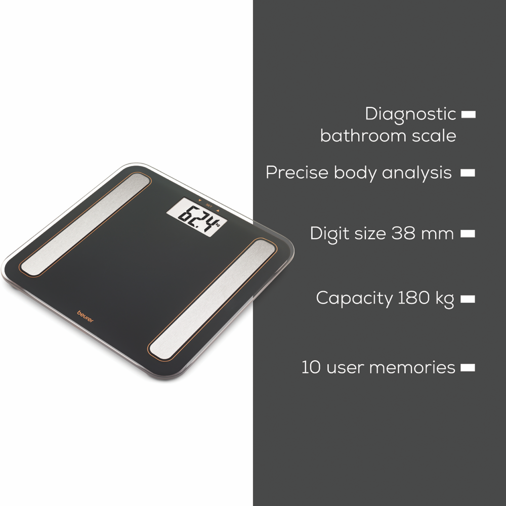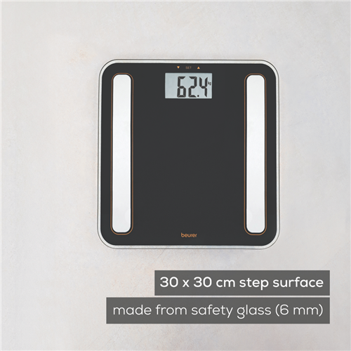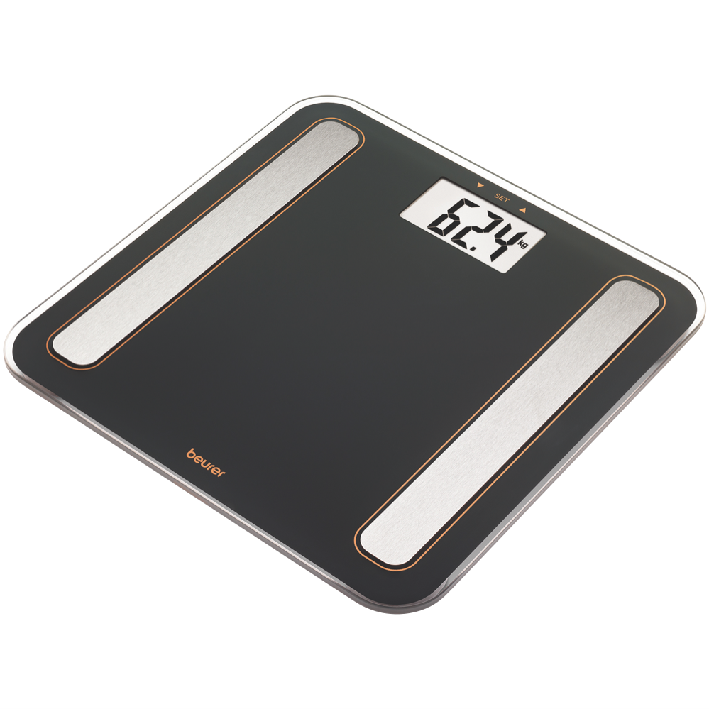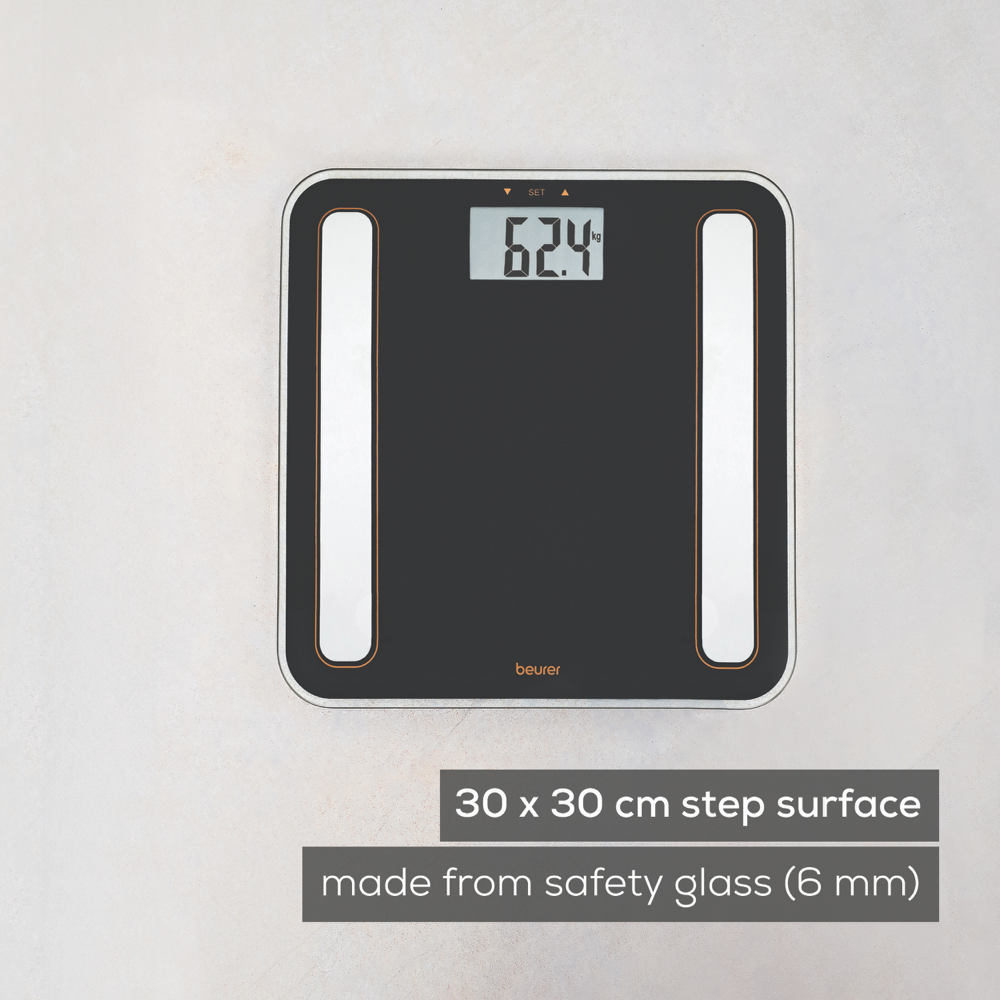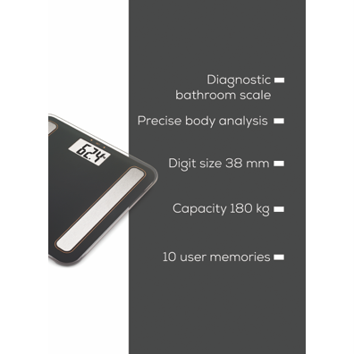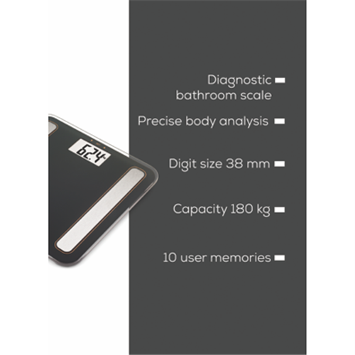 Digital Glass Body Fat Scale measures Body Weight/ Body Fat/ Body Water/ Muscle Ratio/ Bone Mass and Calorie Consumption (BMR) /BMI. Brushed stainless steel electrodes on a sleek platform made of safety glass 180 kg capacity 5 personal activity level 8 user memory profiles the ability to change measurements between kg/lb/st and an overload indicator. 5 year warranty with German Design and Engineering.