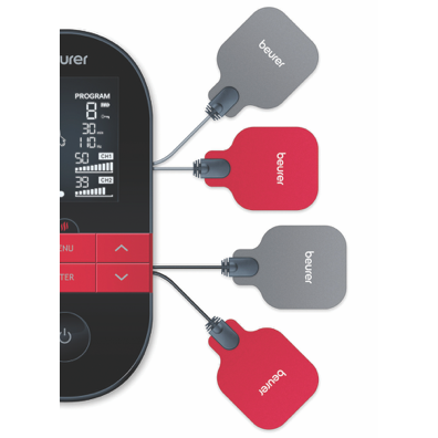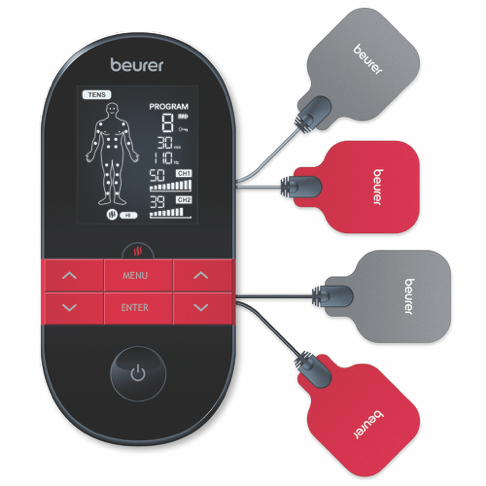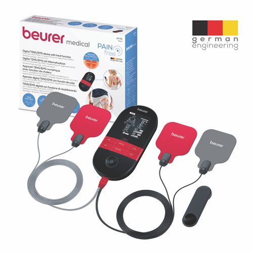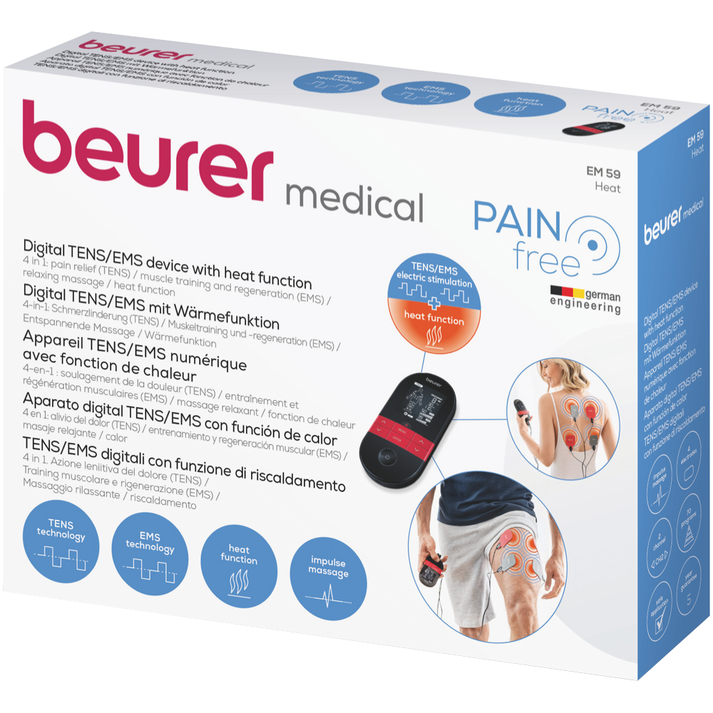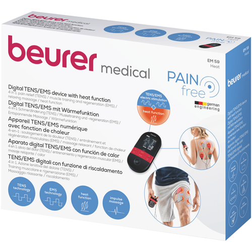 The Beurer EM59 is a digital TENS/EMS device with a heat function offering pain therapy muscle stimulation massage and heat treatment. It features 2 separately adjustable channels 64 pre-programmed applications and 6 customisable programs. The device has 2 heat levels (low at 41°C and high at 43°C) and allows for 3 usage options: TENS/EMS + heat TENS only or heat only.