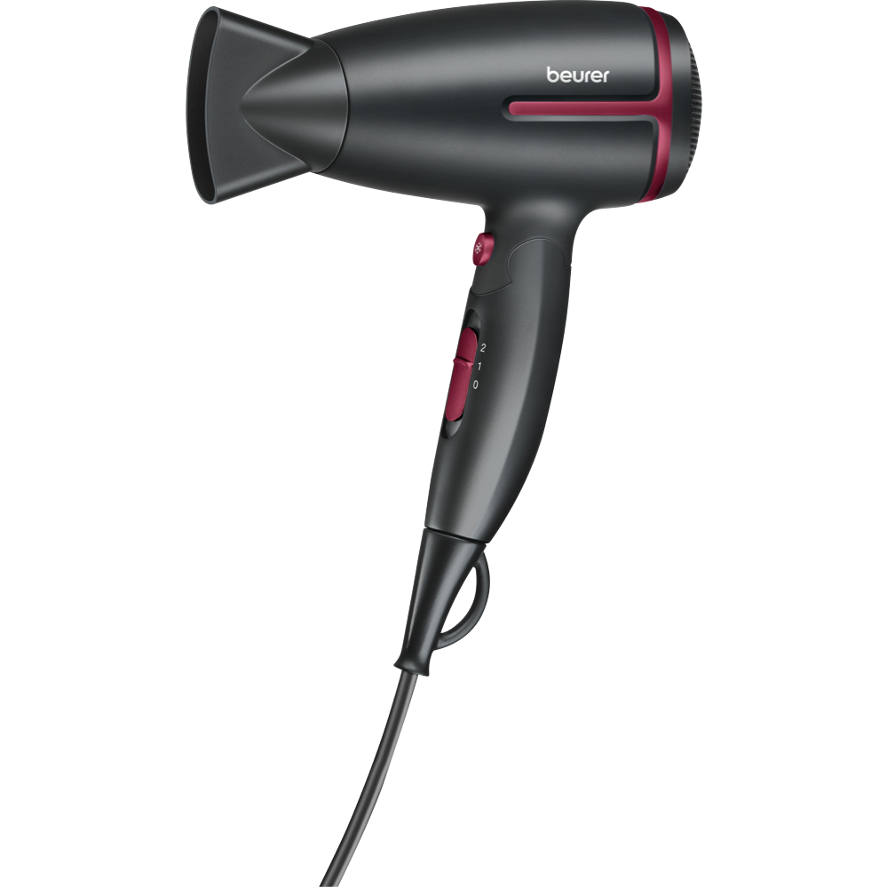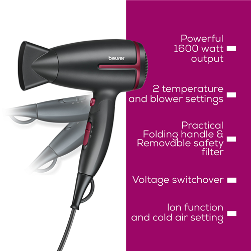 Looking for a hair dryer that fits your busy lifestyle and keeps your hair looking great wherever you go? This Limited Edition Travel Hair Dryer in sleek black offers two heat settings and a folding handle making it easy to pack and comfortable to use. With worldwide voltage you can style your hair confidently no matter where your travels take you. The ion function helps prevent static leaving your hair shiny and smooth while the adjustable styling nozzle lets you personalise your look. If the motor overheats the automatic switch-off keeps things safe. You ll also find a handy hanging loop for storage and a removable filter for easy cleaning. Measuring 259 millimetres high 80 wide and 158 deep and weighing just 580 grams this dryer is lightweight and compact. Enjoy peace of mind with a three-year warranty. Model HC25RC. Try it out and see how effortless styling can be on the go!