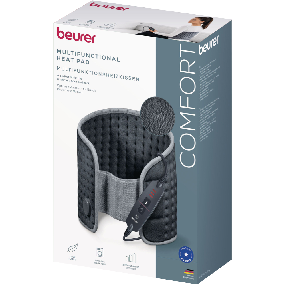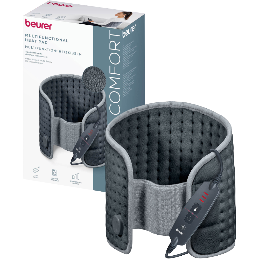 The Beurer HK60 Super Cosy Abdominal and Back Heating Pad delivers soothing warmth designed to target the abdominal and back body zones. The silky soft and breathable surface along with the wide elastic body band make the HK60 comfortable to wear. Simple fastening with a hook-and-loop fastener and the ergonomic shape makes the HK60 ideal for the abdomen and lower back. Three temperature settings provide relaxing warmth that can help with tension. The fluffy fibre makes the material particularly pleasant and skin-friendly.