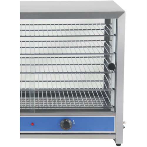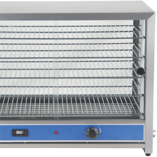 Display and serve hot pies anywhere with ease. Sturdy Stainless Steel #430 construction and crumb trays fixed rack levels and metal lower element. It holds a perfect temperature with a European thermostat plus thermometer and temperature display. This means your pies are served just right. It has heat resistant ABS control dials and handles glass sliding doors with tempered safety glass and non-slip rubber feet. It is easy to clean simply slide out the racks and remove the crumb tray with removable glass sliding doors and a fixed rear glass panel.