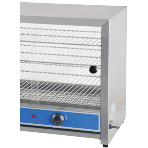 Display and serve hot pies anywhere with ease. Sturdy Stainless Steel #430 construction and crumb trays fixed rack levels and metal lower element. It holds a perfect temperature with a European thermostat plus thermometer and temperature display. This means your pies are served just right. It has heat resistant ABS control dials and handles glass sliding doors with tempered safety glass and non-slip rubber feet. It is easy to clean simply slide out the racks and remove the crumb tray with removable glass sliding doors and a fixed rear glass panel.