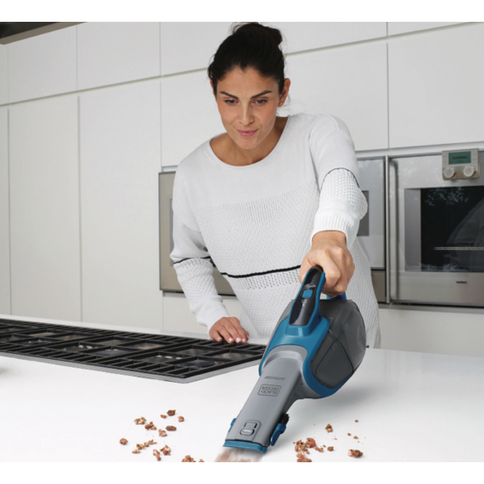 Tackle dirt and debris with the power and convenience of the Black & Decker 21.6Wh Lithium-ion Dustbuster Cyclone. This deep ocean blue handheld vacuum packs a punch with 25 air watts of suction power ideal for quick cleanups on carpets floors and tricky corners. Its cyclonic action spins dust away from the filter to maintain strong suction. The wide mouth scoops up large debris with ease. With a bagless design the removable washable filters and dirt bowl ensure lasting performance. Lithium-ion battery technology provides 15 minutes of cordless runtime and charges up in just 5 hours. The flip out brush onboard crevice tool and jack plug charger provide added functionality. Vivid imagery helps customers visualize using this Dustbuster in their lives. The manufacturer's part number for this product is DVJ320J-XE. For convenient cordless cleaning check out the Dustbuster today.