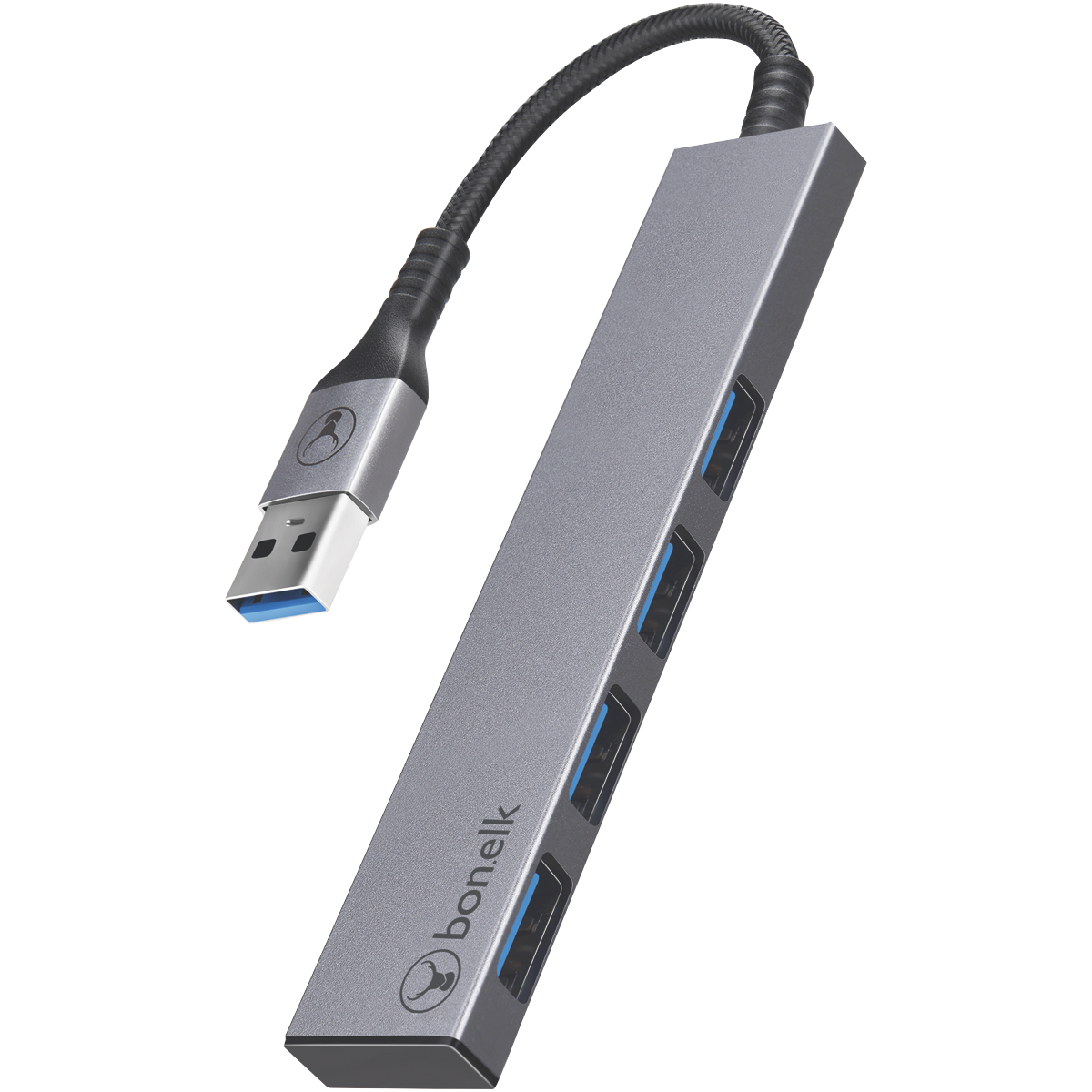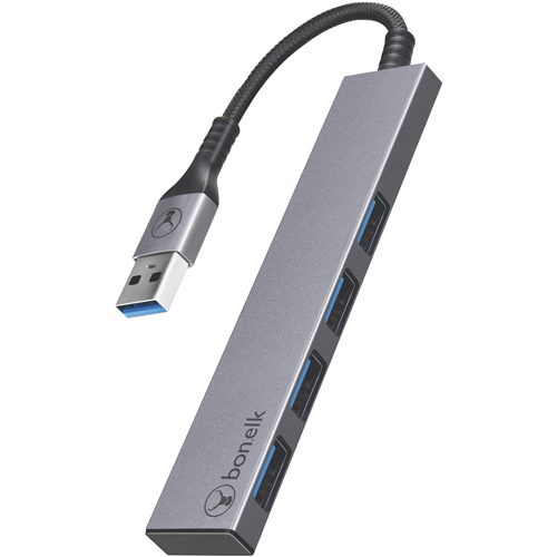 The Bonelk Long-Life USB-A to 4 Port USB 3.0 Hub in Space Grey adds convenient high-speed connectivity to your desktop or laptop computer. This durable hub features four USB 3.0 ports to provide data transfer speeds up to 5Gbps perfect for connecting peripherals like external hard drives flash drives keyboards mice and more. With its compact and lightweight design you can easily toss it in your bag to expand your connectivity options on the go. The durable space grey housing complements your modern devices while 1-year warranty provides peace of mind. Boost your productivity with the versatile connectivity of the Bonelk USB hub. The manufacturer's part number for this product is ELK-80024-R. Check out this hub to expand your USB ports today.