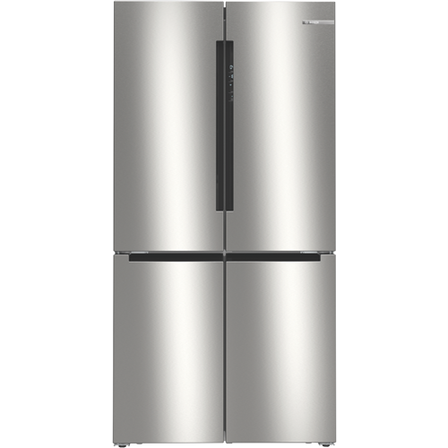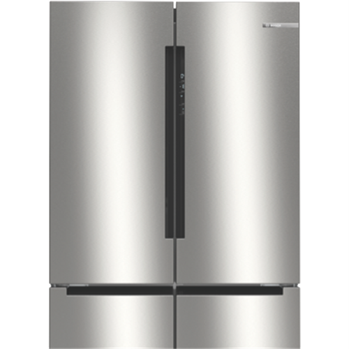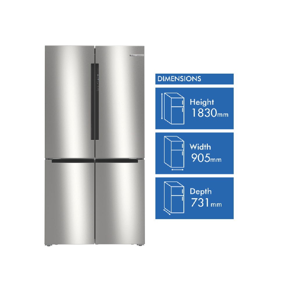 This Bosch 605L Quad Door Refrigerator gives you plenty of space for all your fresh and frozen foods with a generous 405L fridge capacity and 200L freezer space. The brushed steel finish adds a touch of style to your kitchen while the VitaFresh Plus system helps keep your produce fresher for longer. With Total No Frost technology you'll never have to defrost again and the metal backwall with Multi Airflow ensures even cooling throughout. Control everything through the Home Connect app while features like LED lighting child lock and SuperCooling function make this fridge both practical and convenient. This energy efficient 4.5 star rated refrigerator comes with a 2 year warranty. Model number: KFN96APEAA.
