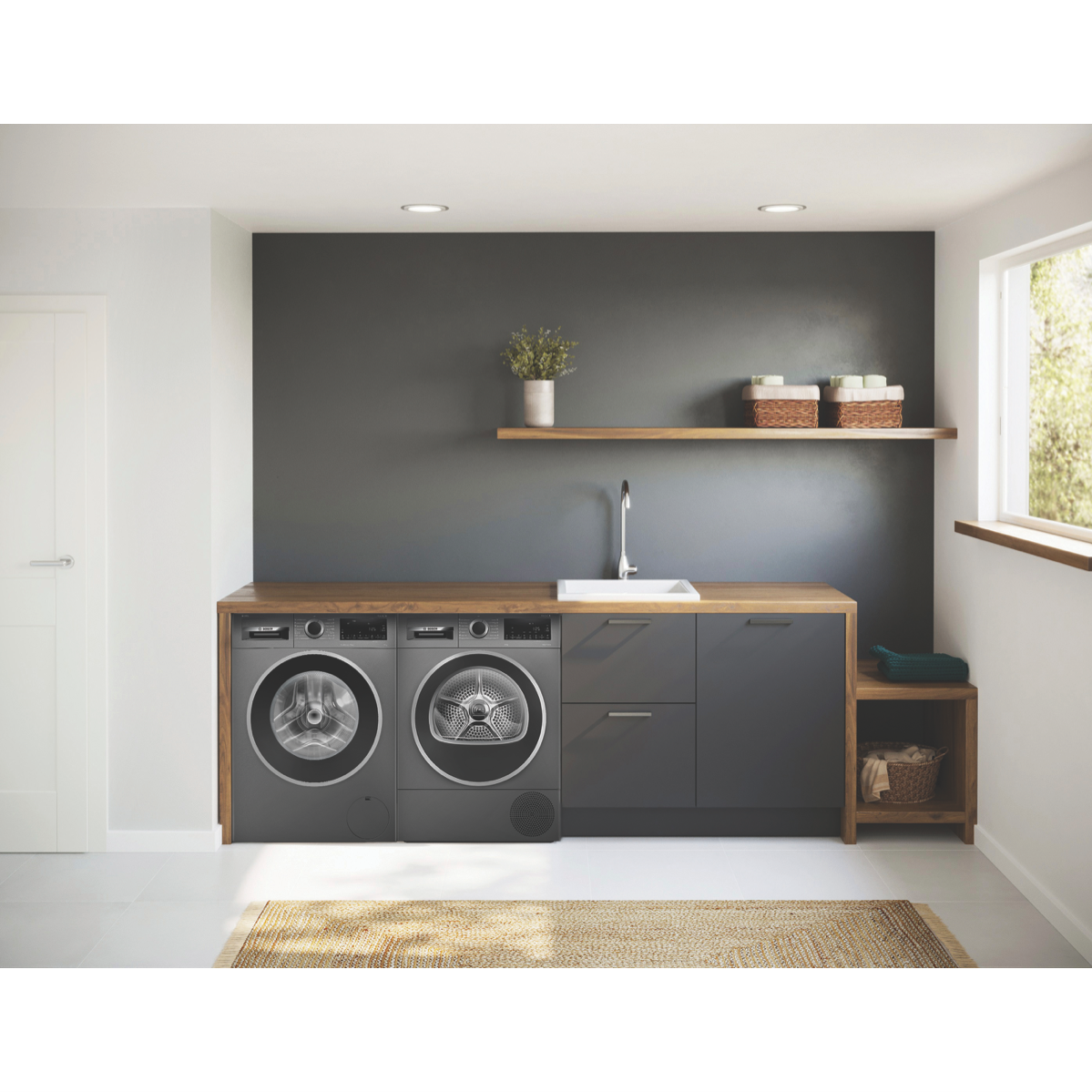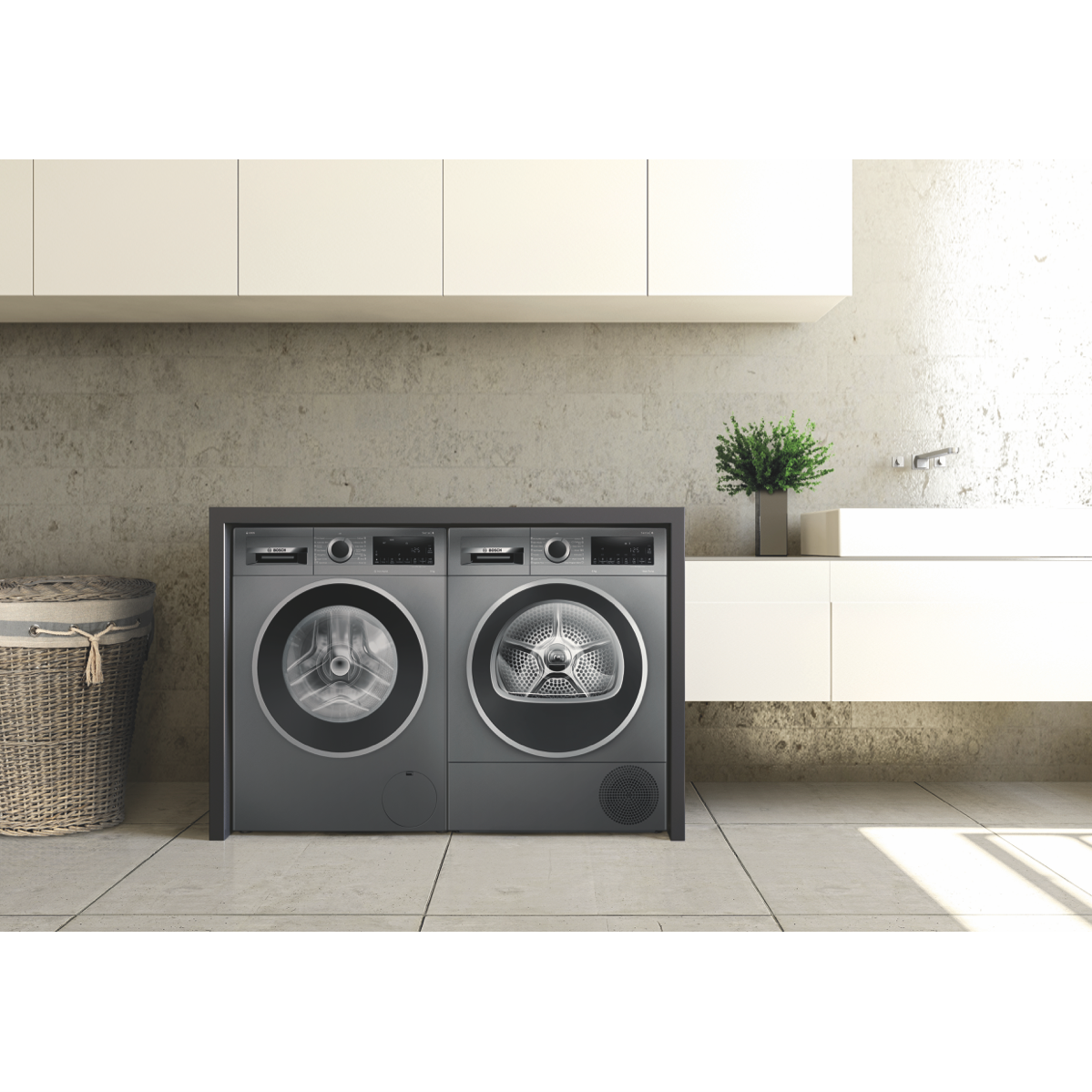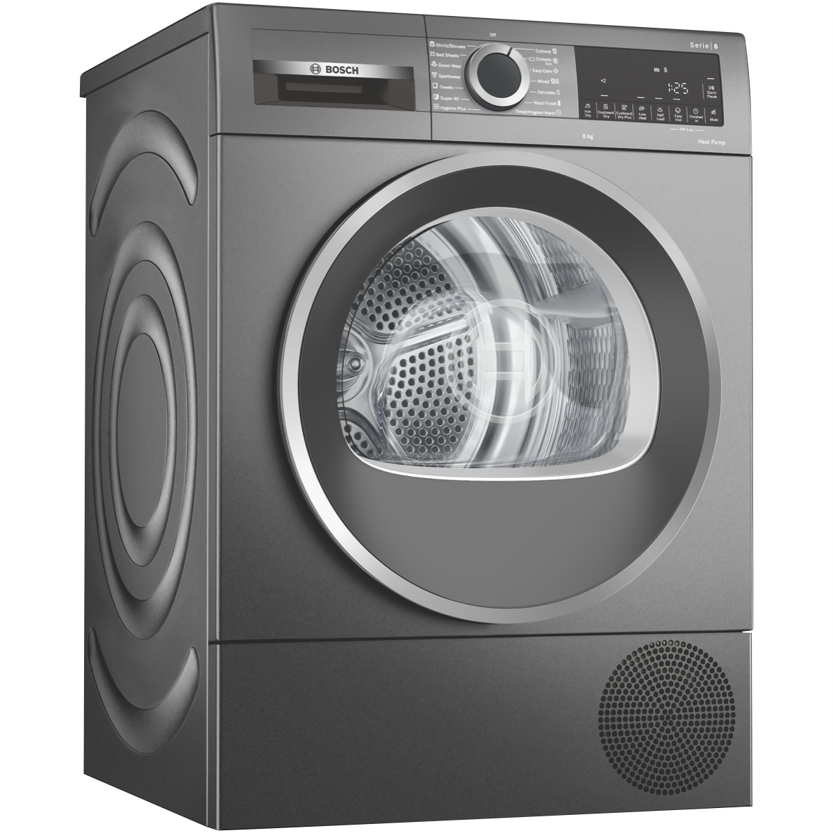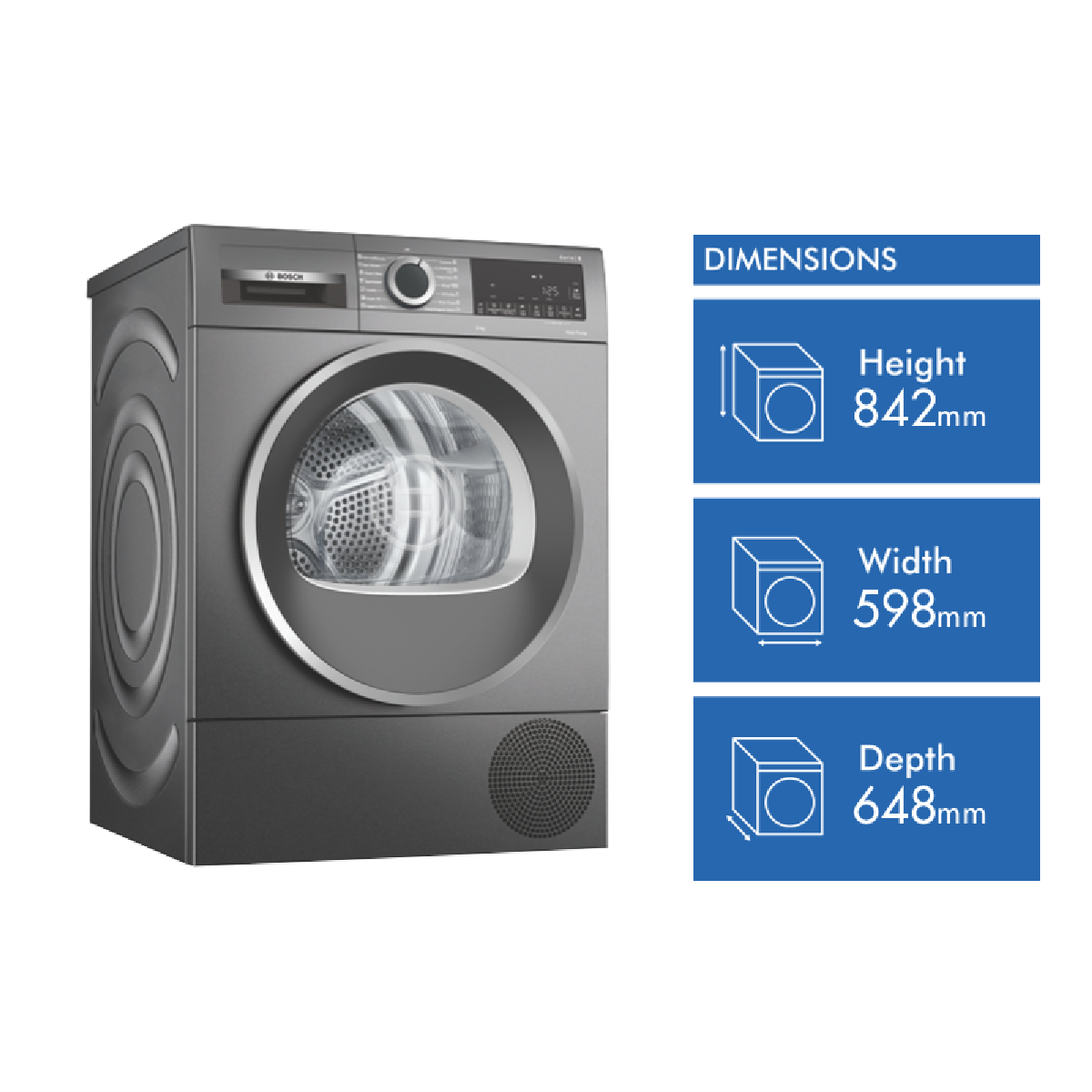 Discover the Bosch 8kg Heat Pump Dryer a high-efficiency clothes dryer that offers exceptional drying performance while being gentle on your fabrics. This advanced dryer features a spacious 8kg capacity making it ideal for larger households or those with extensive laundry needs. With its innovative heat pump technology this Bosch dryer achieves an impressive 9-star energy rating ensuring energy savings and reduced environmental impact. The 12 drying programs including Cotton Easy Care Bed Linen Shirts/Blouses Cotton Eco Down Wear Delicates Towels Hygiene Plus Mixed Super 40' Sportswear Easy Care and Wool provide versatile options for all your drying requirements. The dryer's intelligent sensors automatically detect when your load is dry preventing over-drying and protecting your clothes. The Self Cleaning Condenser and Anti-crease feature further enhance convenience and garment care. Enjoy the convenience of the Half Load Option and the specialized Down Drying program. With a sleek Graphite finish and compact dimensions of 598mm width 857mm height and 648mm depth this dryer seamlessly integrates into your laundry space. The manufacturer's part number for this product is WQG235DRAU. Experience the efficiency and performance of the Bosch 8kg Heat Pump Dryer and elevate your laundry routine today.