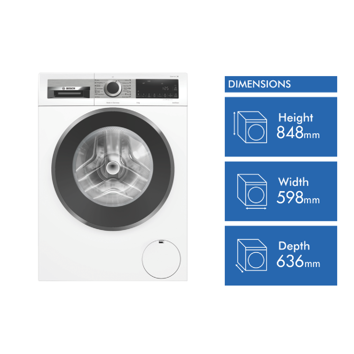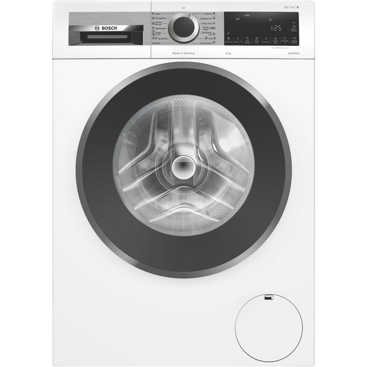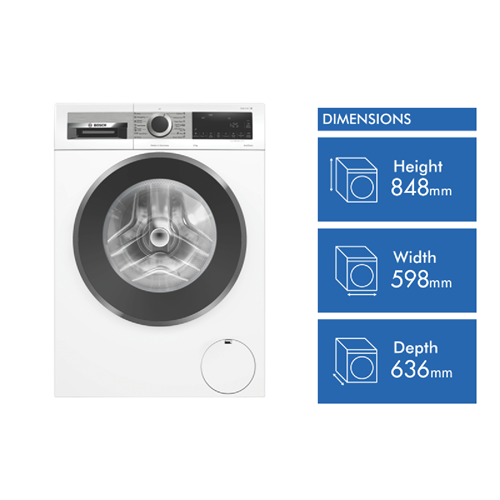 Bring sleek design and intelligent washing technology into your home with the Bosch Series 8 9kg Front Load Washer. This white freestanding washing machine not only looks great but also delivers powerful cleaning performance. With a generous 9kg load capacity you can wash more in one go saving you time. The EcoSilence drive motor is whisper-quiet yet highly efficient. Vibration is significantly reduced thanks to the AntiVibration panels and stable design. The ActiveWater system automatically adjusts water usage based on the size of each load helping you conserve water. An impressive 1400rpm max spin speed removes more moisture from clothes to cut down drying time. The AntiStain and super quick 15 minute cycles target tough stains. The self-cleaning detergent drawer prevents residue buildup. The intuitive LED display reload function and delay start provide added convenience. For peace of mind AquaStop flood protection stops water flow if a leak occurs. With a 5 star energy rating and 4.5 star water rating this Bosch washer helps reduce your utility bills. Bring home the Bosch Series 8 Front Load Washer today for an effortless laundry experience. The manufacturer's part number for this product is WGG24402AU.
