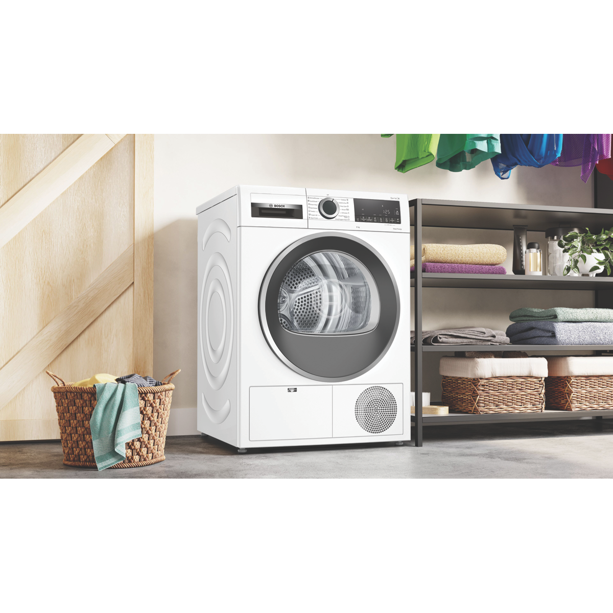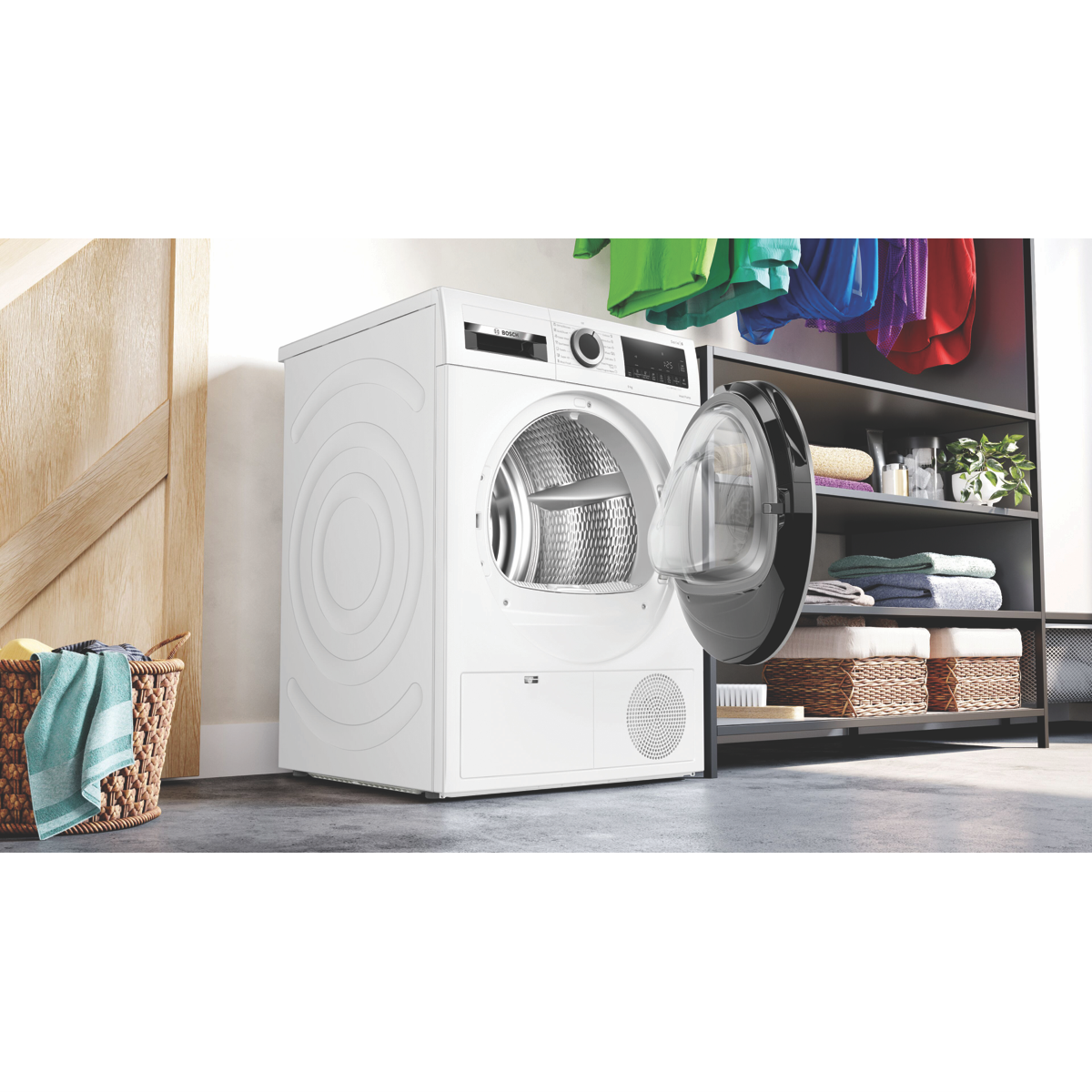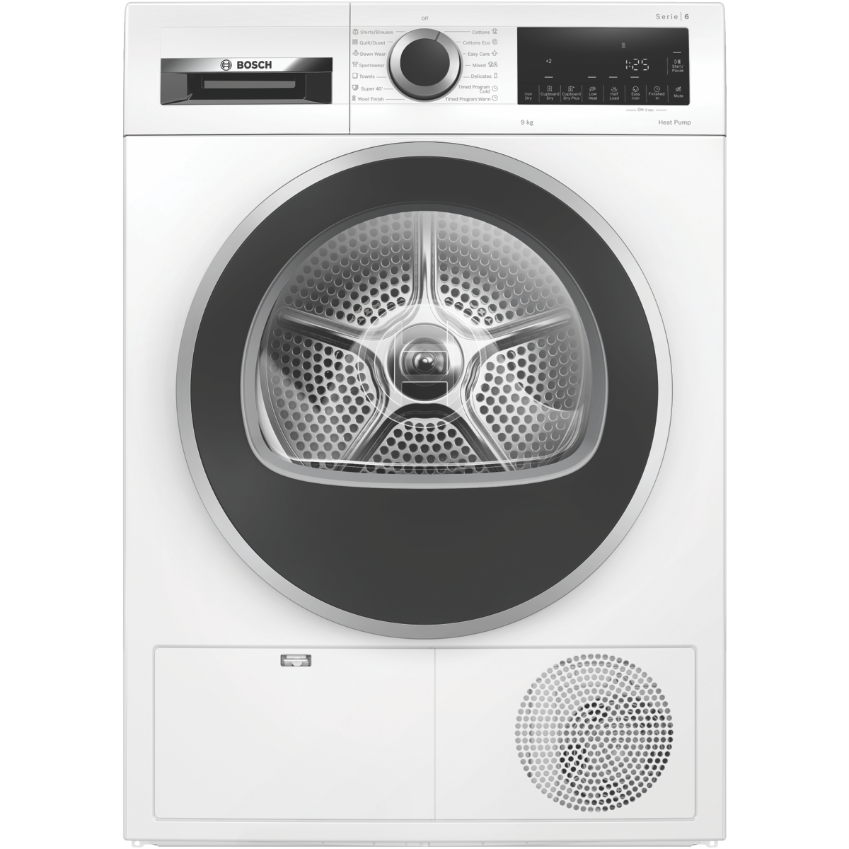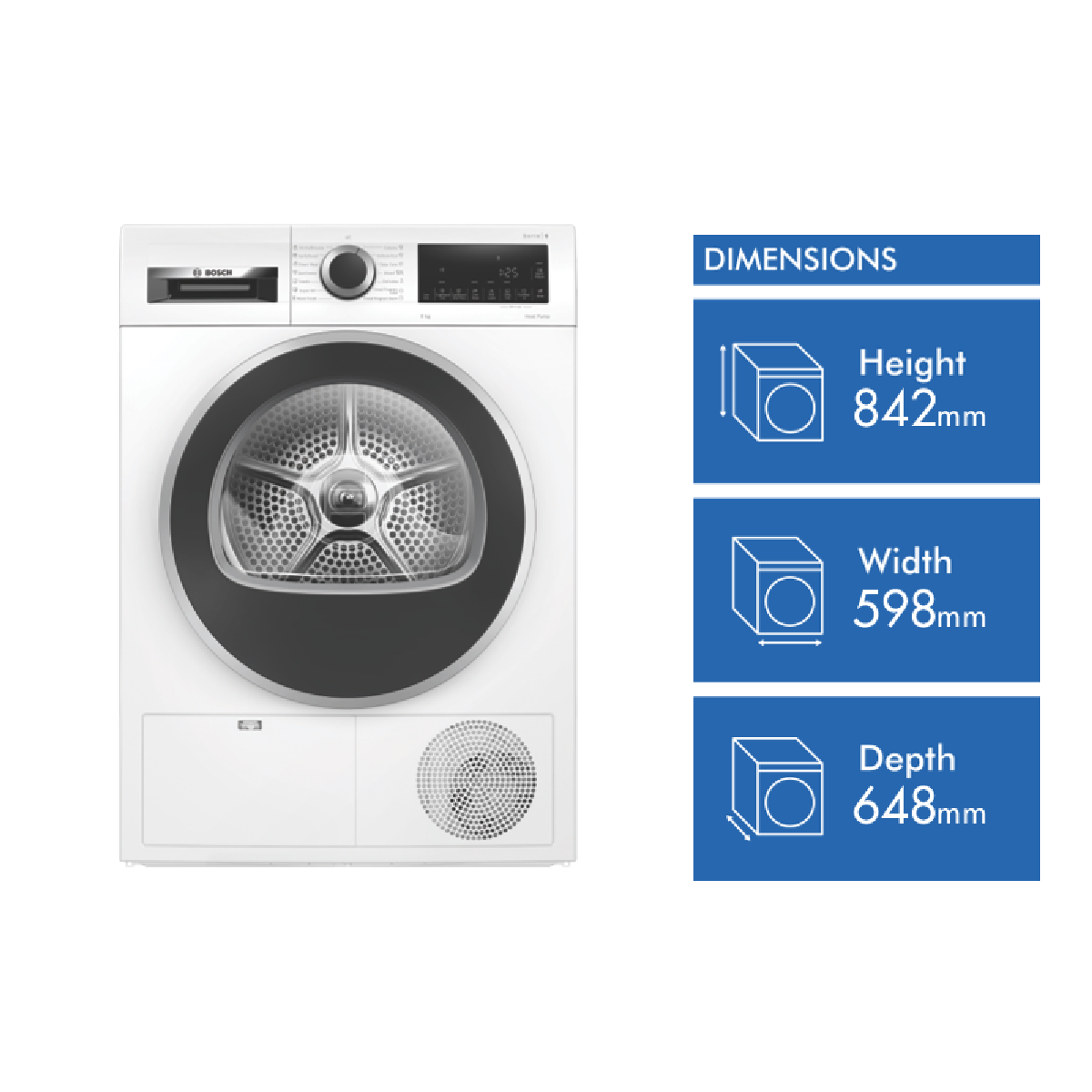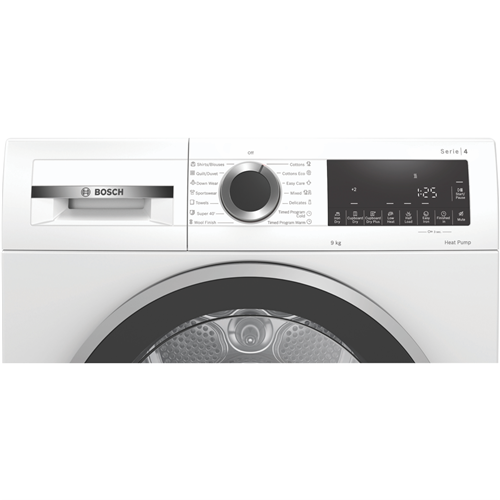 Step into the future of laundry with the Bosch 9kg Heat Pump Dryer. This innovative clothes dryer combines superior drying performance with energy efficiency drying up to 9kg of laundry while achieving an impressive 7 star energy rating. The advanced heat pump technology gently dries clothes at lower temperatures protecting fabrics while reducing energy consumption. 14 specialized drying programs cater to everything from cottons and shirts to sportswear and delicates while options like the super 40 minute mixed load program provide extra convenience. With a sleek white finish anti-vibration design for quiet operation and a large internal drum this dryer makes doing laundry simple. The intuitive control panel allows you to select timed drying auto dry or choose from various dryness levels. Drying sensor technology prevents over-drying to care for your clothes.Backed by Bosch s reputation for quality and a 2 year warranty this dryer provides the ultimate laundry solution. The manufacturer's part number for this product is WQG24200AU. Check out this innovative Bosch dryer today to discover the possibilities.