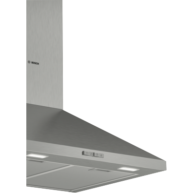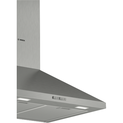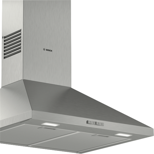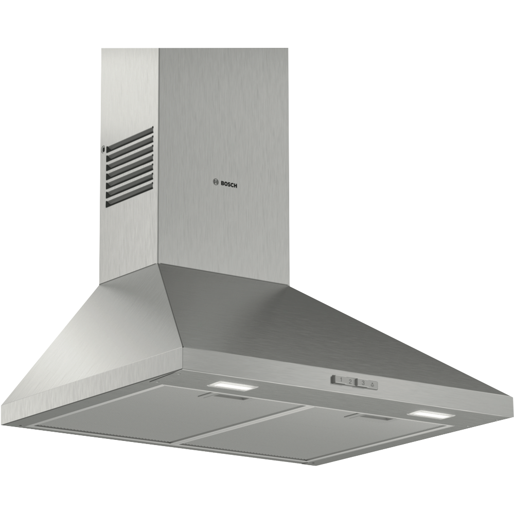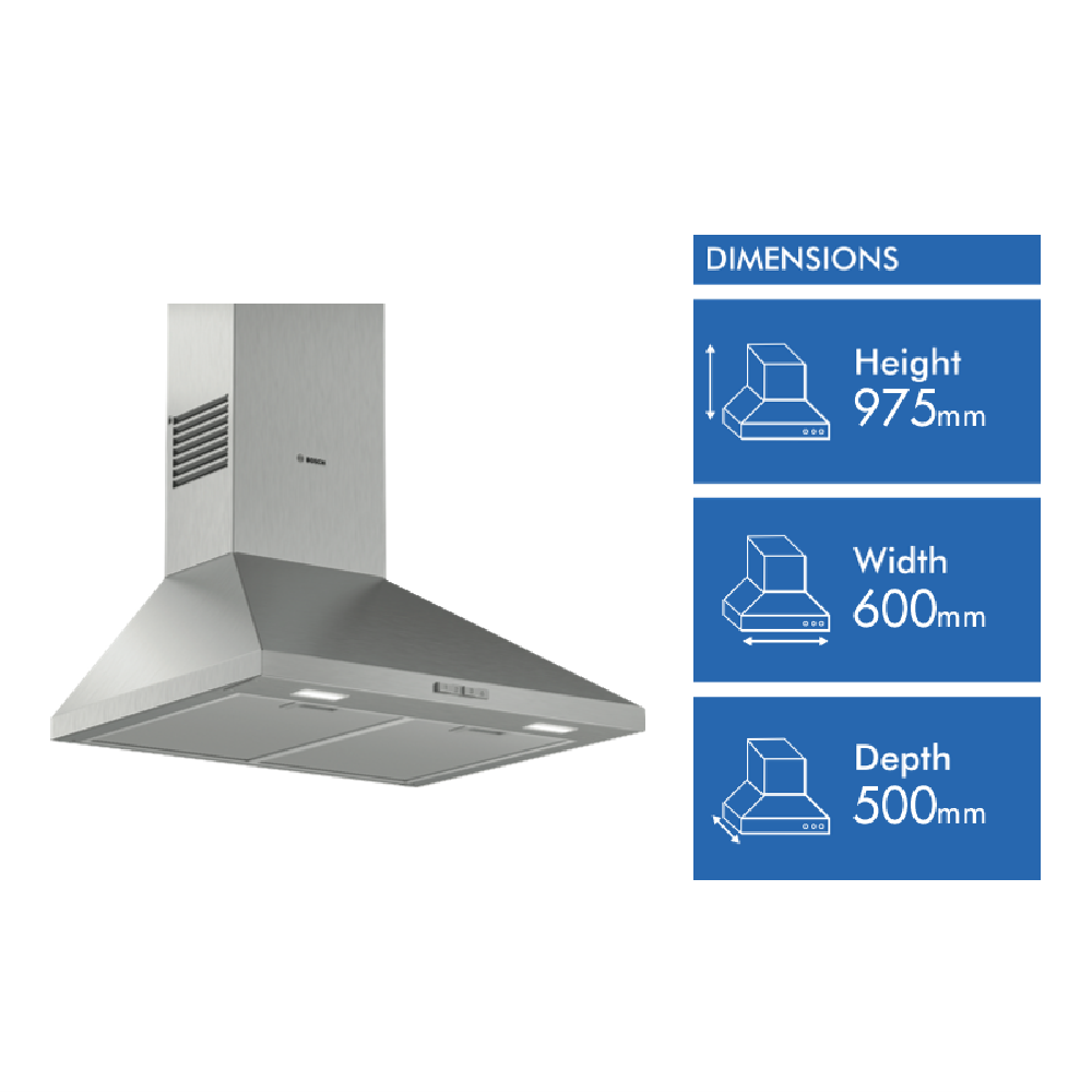 Bring sleek modern style to your kitchen with the Bosch 60cm Wall Canopy Rangehood. With its pyramid design and stainless steel finish this rangehood makes a striking statement. But it's more than just stylish - the Bosch rangehood is engineered for powerful performance. Twin motors generate an extraction capacity of 570 cubic metres per hour to thoroughly eliminate cooking odours smoke and vapours. The three fan speeds and push button controls let you adjust the airflow to suit your needs. Dual LED lights illuminate your cooktop brilliantly. Filters are easy to remove and pop in the dishwasher for simple cleaning. At 600mm wide this rangehood fits neatly above 60cm cooktops or stoves. With a height of 975mm and depth of 500mm the canopy has ample coverage to capture steam and aromas. Bosch includes their two year warranty for added peace of mind. The manufacturer's part number for this product is DWP66BC50A. Bring home the Bosch Wall Canopy Rangehood for a fusion of form and function in your kitchen today.