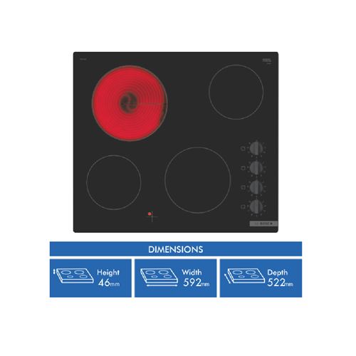 Step up your cooking game with the sleek 60cm Bosch Ceramic Cooktop. This electric cooktop boasts 4 cooking zones with 9 adjustable power levels providing exceptional flexibility and control for all your culinary creations. The intuitive sword knobs and residual heat indicators allow for safe precise cooking every time. With a width of 592mm height of 46mm and depth of 522mm this cooktop delivers ample room to cook for the whole family. The durable ceramic glass surface not only looks fantastic but makes cleaning a breeze. Enjoy peace of mind with Bosch's 2 year warranty. Sear sauté and simmer away on this versatile cooktop that makes cooking a pleasure. The manufacturer's part number for this product is PKE611CA2A. Discover how this cooktop can make your kitchen complete.