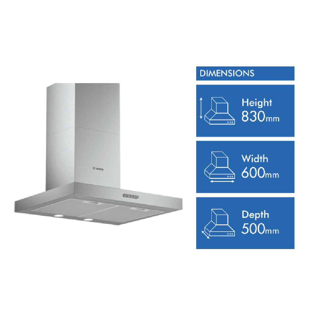 Make a statement in your kitchen with the Bosch Series 2 60cm stainless steel wall canopy rangehood. With an integrated motor and sleek stainless steel finish this rangehood makes an elegant addition to your cooking space while powerfully extracting odours and grease. The three fan speeds and push button controls allow you to adjust the airflow to suit whatever's cooking. The two 3W LED lights illuminate your cooktop brilliantly while the dishwasher safe metal grease filters trap vapours and are easy to clean. With a maximum air extraction rate of 580m3/hr according to EN 61591 this ducted rangehood clears the air efficiently. The noise levels range from a quiet 48dB to 69dB at maximum fan speed. Installation is flexible with both ducted and recirculated modes available. Covered by a 2 year manufacturer's warranty the Bosch 60cm canopy rangehood combines attractive style with powerful performance. This wall mount rangehood has a product width of 598mm height of 450-830mm and depth of 500mm. The manufacturer's part number for this product is DWB65BC50A.