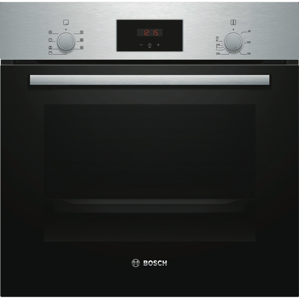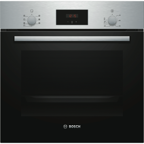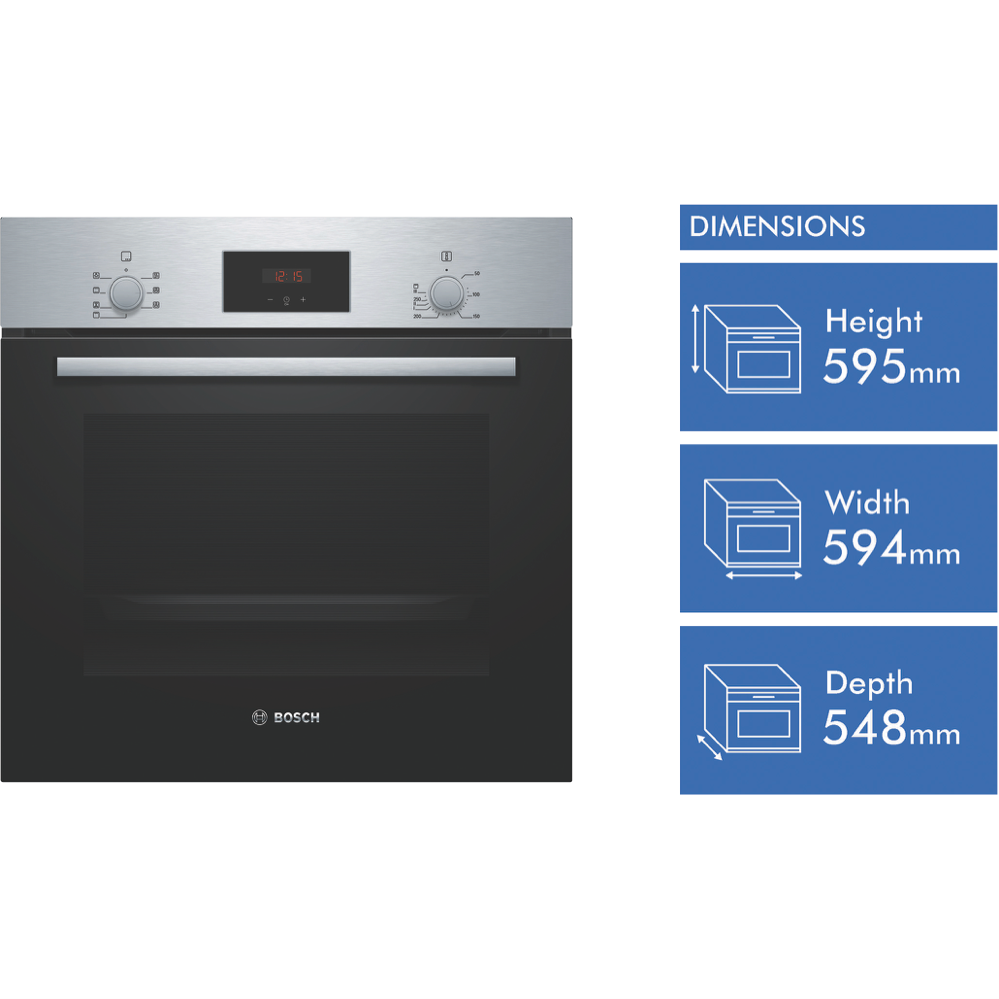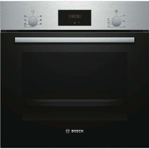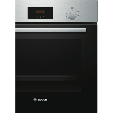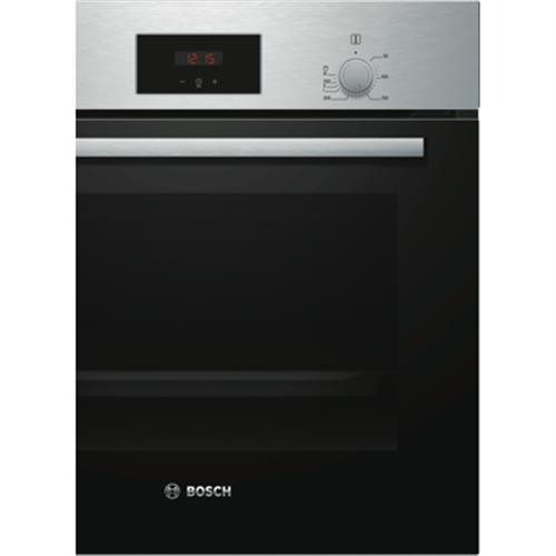 The Bosch 60cm EcoClean Direct Oven is a sleek benchtop electric oven that will revolutionize your cooking experience with its innovative features and stylish stainless steel design. This Series 2 oven comes equipped with five functions including 3D and gentle hot air grill top and bottom heating allowing you to cook everything from crispy pizzas to juicy roasts with ease. The generous 66 liter capacity provides ample room for baking multiple dishes at once while the triple-glazed door seals in heat and ensures energy efficiency. With rapid heating and cool touch doors you can get meals on the table fast without burning your fingers. The EcoClean technology's pyrolytic cleaning function breaks down food residue at high temperatures reducing the need for scrubbing. Pop-out controls drop down door and removable racks make cleaning even simpler. With intuitive control knobs a built-in timer and halogen lighting this Bosch oven provides a user-friendly cooking experience. Your inner chef will be inspired by the versatility of this multi-functional electric oven. Upgrade your kitchen with the Bosch 60cm EcoClean Direct Oven today. The manufacturer's part number for this product is HBF133BS0A.