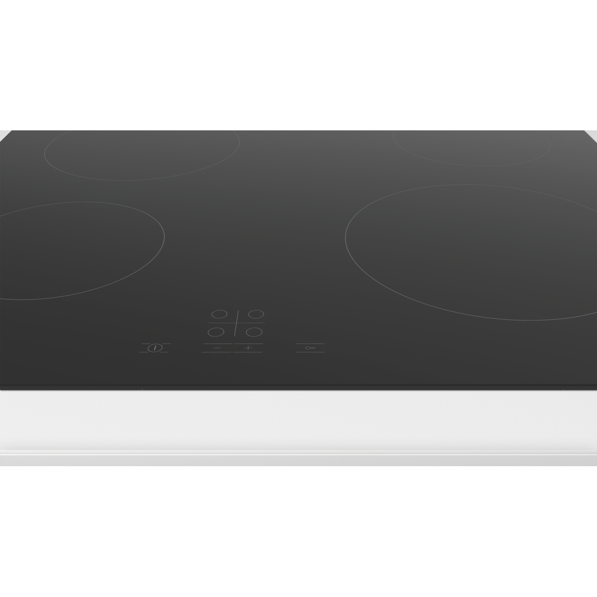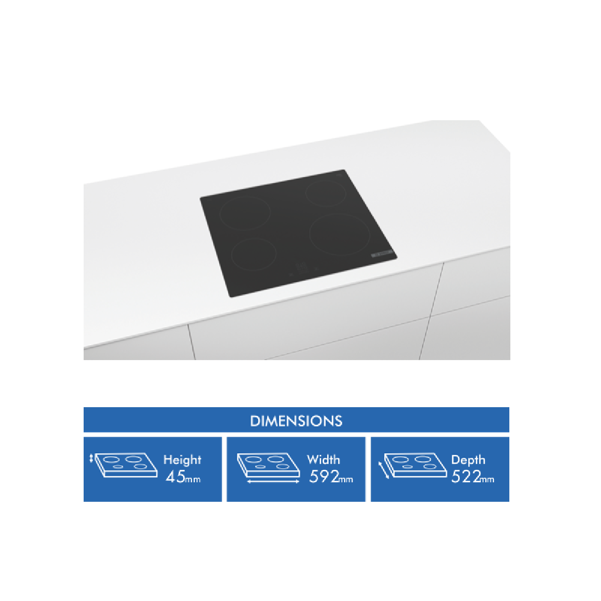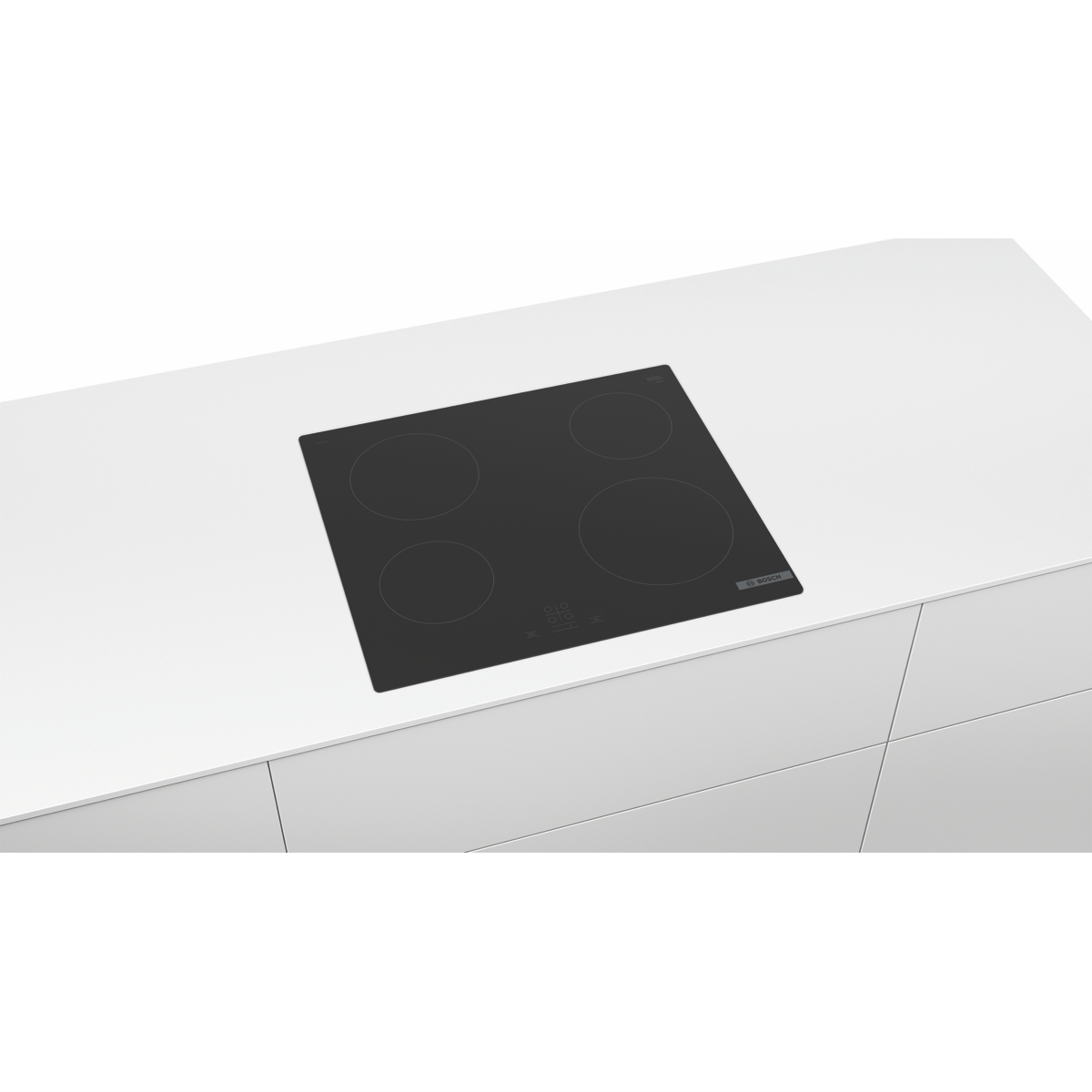 Introducing the Bosch 60cm Electric Ceramic Cooktop designed to make cooking easier and more enjoyable. With four cooking zones 17 power levels and touch controls you'll have precision control to get the perfect results every time. The sleek black frameless design and digital 2-stage residual heat indicators add style and safety to your kitchen. Child locks provide peace of mind while the automatic safety switch off gives you one less thing to worry about. With a width of 592mm height of 45mm and depth of 522mm it will fit most 60cm spaces and the 16mm minimum worktop thickness makes installation straightforward. Connected load is 6.6KW. The manufacturer's part number for this product is PKE611BA2A. Bring home the Bosch Ceramic Cooktop today for an exceptional cooking experience.