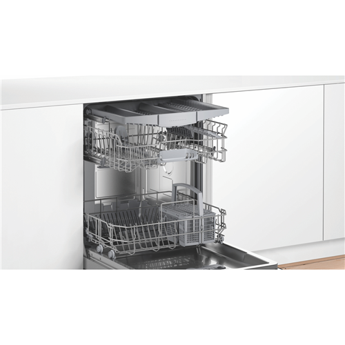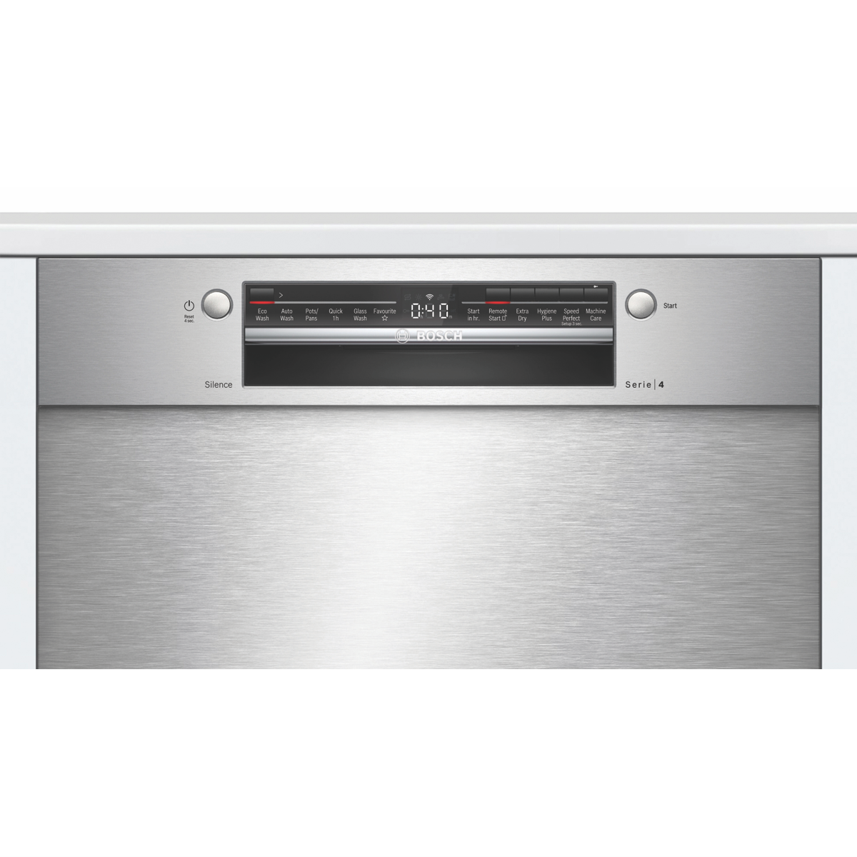 Discover flexible loading solutions and convenient remote operation via an app with this Wi-Fi connected Bosch Series 4 60cm Under Bench Dishwasher Stainless Steel SMU4HVS01A. A 14-place setting holds plenty of plates bowls cups and serving dishes in various sizes thanks to the upper RackmatickPlus basket that can be height adjusted in three ways to make it fit and VarioFlex red touchpoints that easily let you know which plate racks in the upper or lower baskets can be folded to accommodate them. Plus it has a dedicated upper cutlery space for knives soup ladles and other long utensils. This Bosch dishwasher utilises 13.5 litres per wash on the Eco program with a cold-water connection. It has a 4 Star Energy Rating and a 4 Star WELS Water Rating WELS Licence Number D02594. Select the Glass wash program for a lower temperature clean of your favourite crystal glassware or fine china or the sensor-controlled Auto Wash program which automatically selects the settings based on the level of soiling. Reduce wash time with the SpeedPerfect option select Extra Dry for additional drying or HygienePlus for an increased final rinse temperature for a perfectly sanitised result. With the Bosch Home Connect app on your smartphone review the Easy Start best program recommendations based on your input on the type of dishes and cleaning preference option selected view the estimated water and energy consumption of each program or adjust a wash option even after the program has started.