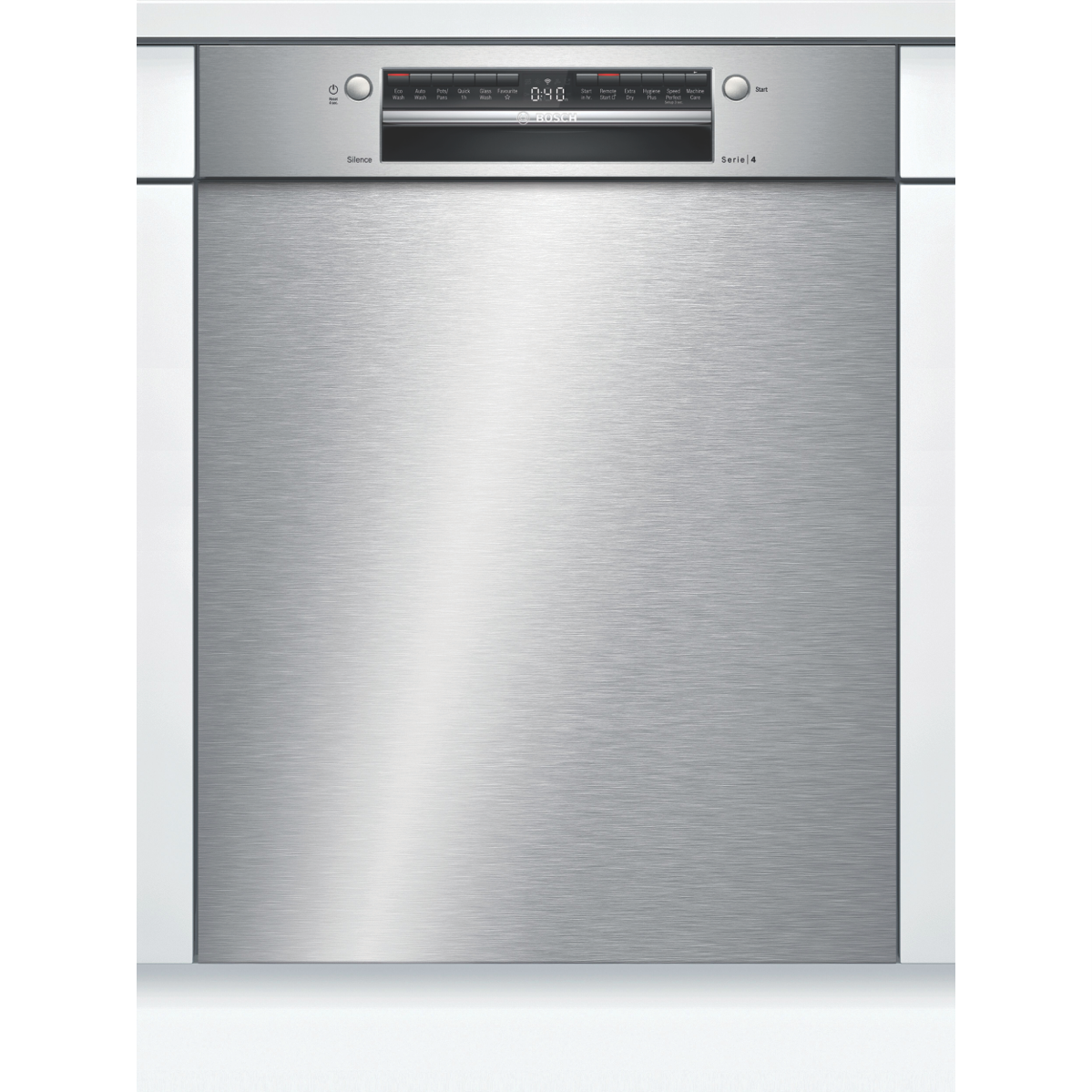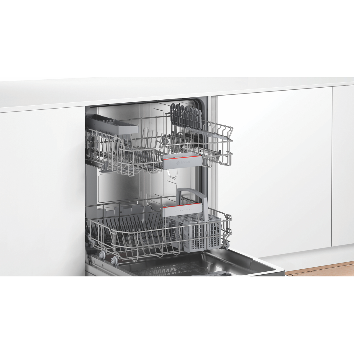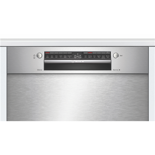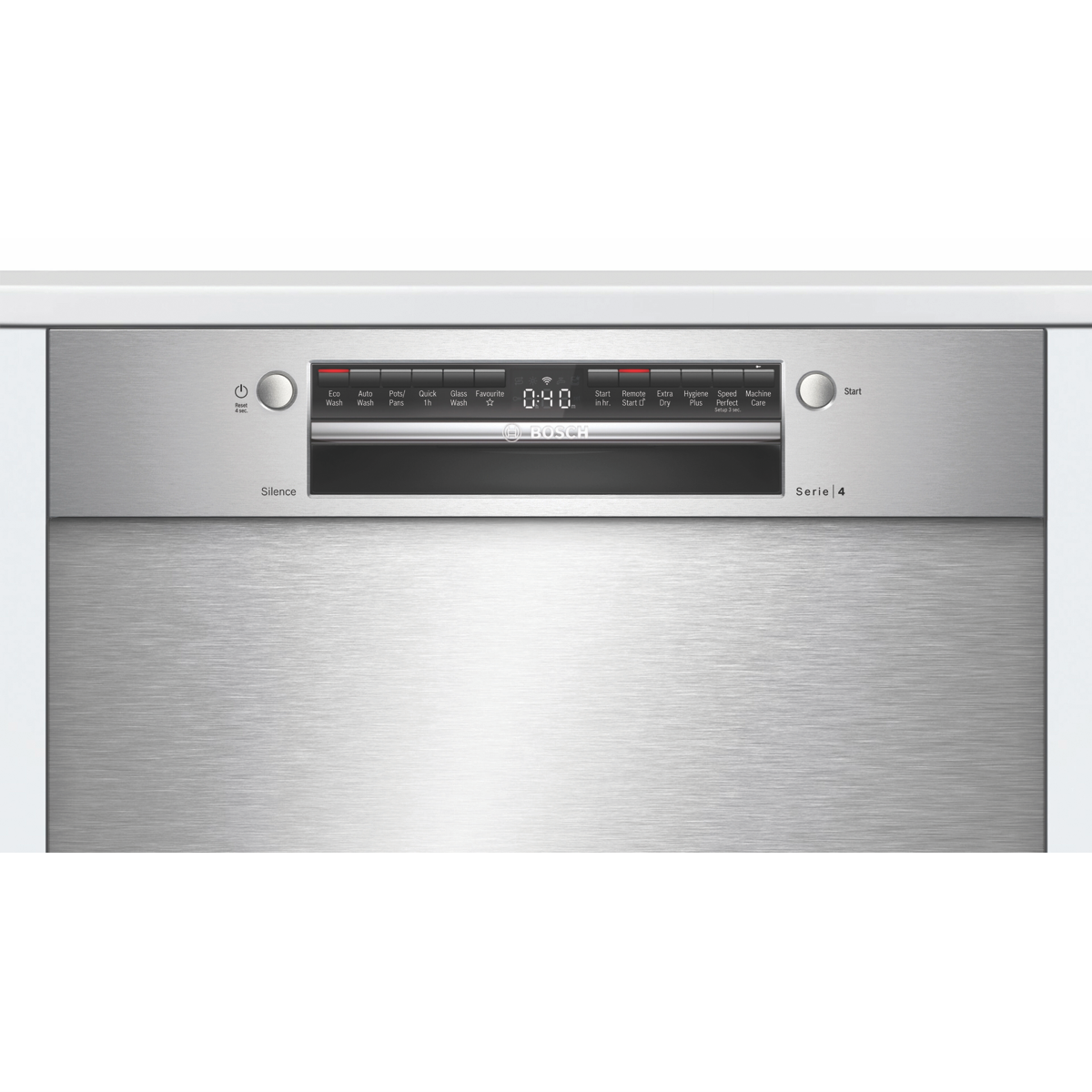 Discover flexible loading solutions and convenient remote operation via an app with this Wi-Fi connected Bosch Series 4 60cm Under Bench Dishwasher Stainless Steel SMU4HTS01A. A 14-place setting holds plenty of plates bowls cups and serving dishes in various sizes thanks to the upper RackmatickPlus basket that can be height adjusted in three ways to make it fit and VarioFlex red touchpoints that easily let you know which plate racks in the upper or lower baskets can be folded to accommodate them. This Bosch dishwasher utilises 13.5 litres per wash on the Eco program with a cold-water connection. It has a 4 Star Energy Rating and a 4 Star WELS Water Rating WELS Licence Number D02579. Select the Glass wash program for a lower temperature clean of your favourite crystal glassware or fine china or the sensor-controlled Auto Wash program which automatically selects the settings based on the level of soiling. Reduce wash time with the SpeedPerfect option select Extra Dry for additional drying or HygienePlus for an increased final rinse temperature for a perfectly sanitised result. With the Bosch Home Connect app on your smartphone review the Easy Start best program recommendations based on your input on the type of dishes and cleaning preference option selected view the estimated water and energy consumption of each program or adjust a wash option even after the program has started.