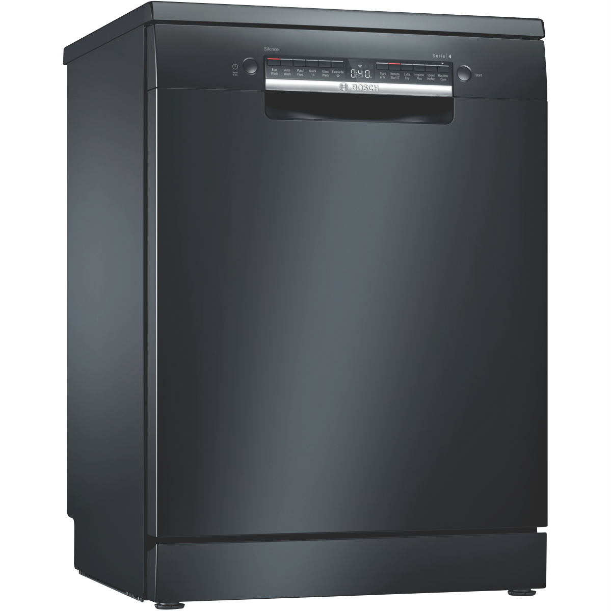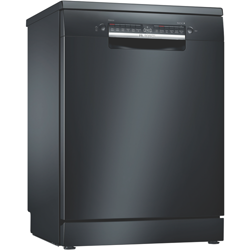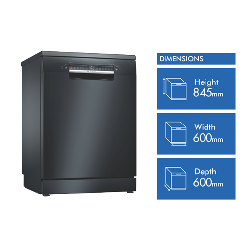 Discover plenty of loading flexibility excellent cleaning results with efficient use of resources and incredible convenience to your everyday with the management of settings via an app with this Bosch Series 4 60cm Freestanding Dishwasher Black Inox SMS4HVB01A with Wi-Fi connectivity. A 14-place setting holds plenty of plates bowls cups and serving dishes in various sizes thanks to the upper RackmatickPlus basket that can be height adjusted in three ways to make it fit and VarioFlex red touchpoints that easily let you know which plate racks in the upper or lower baskets can be folded to accommodate them. This Bosch dishwasher utilises 13.5 litres per wash on the Eco program with a cold-water connection. It has a 4 Star Energy Rating and a 4 Star WELS Water Rating WELS Licence Number D02592. Select one of six programs like 'Glass Wash' for a lower temperature clean of your favourite crystal glassware or fine china or the sensor-controlled 'Auto Wash' program which automatically selects the settings based on the level of soiling. Reduce wash time with the SpeedPerfect option select Extra Dry for additional drying or HygienePlus for an increased final rinse temperature for an extended time. With the Bosch Home Connect app on your smartphone review the Easy Start best program recommendations based on your input on the type of dishes and cleaning preference option selected view the estimated water and energy consumption of each program or adjust a wash option even after the program has started.
