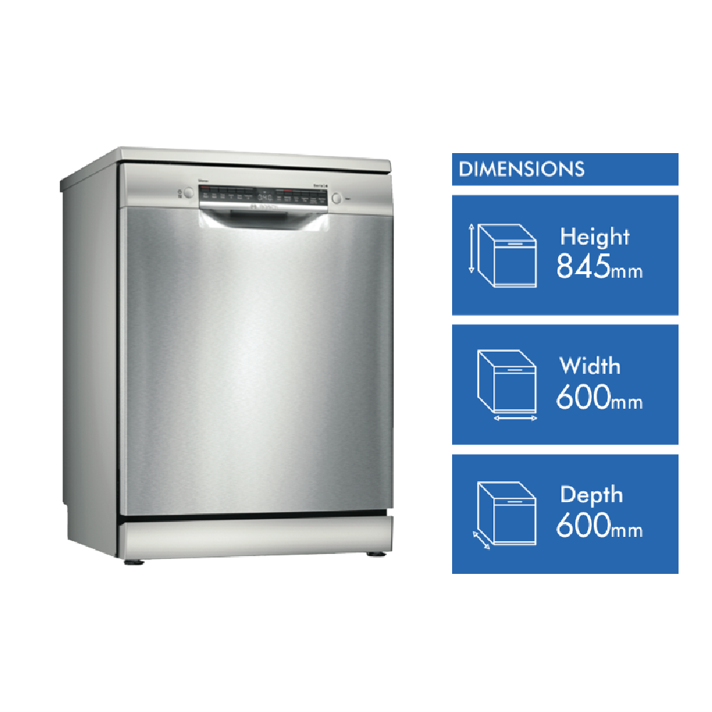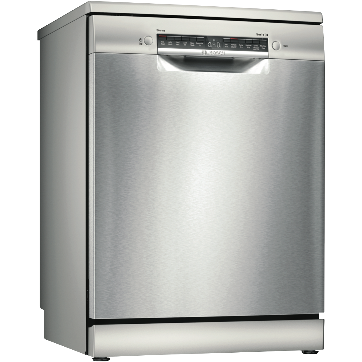 Discover plenty of loading flexibility excellent cleaning results with efficient use of resources plus Wi-Fi connectivity for management of settings via an app for convenience like never before with the Bosch Series 4 60cm Freestanding Dishwasher Stainless Steel SMS4HVI01A. A 14-place setting holds plenty of plates bowls cups and serving dishes in various sizes thanks to the upper RackmatickPlus basket that can be height adjusted in three ways to make it fit and VarioFlex red touchpoints that easily let you know which plate racks in the upper or lower baskets can be folded to accommodate them. This Bosch dishwasher utilises 13.5 litres per wash on the Eco program with a cold-water connection. It has a 4 Star Energy Rating and a 4 Star WELS Water Rating WELS Licence Number D02593. Select the Glass wash program for a lower temperature clean of your favourite crystal glassware or fine china or the sensor-controlled Auto Wash program which automatically selects the settings based on the level of soiling. Reduce wash time with the SpeedPerfect option select Extra Dry for additional drying or HygienePlus for an increased final rinse temperature for an extended time. With the Bosch Home Connect app on your smartphone review the Easy Start best program recommendations based on your input on the type of dishes and cleaning preference option selected view the estimated water and energy consumption of each program or adjust a wash option even after the program has started - speed up program time by up to 50% or activate silence mode.