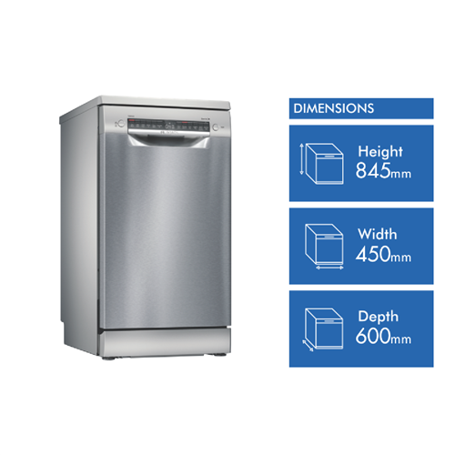 This Wi-Fi connected Bosch 45cm Freestanding Dishwasher SPS6IKI01A offers an expert clean for various dishes pots and glassware with dedicated wash programs and five spray levels for maximum water contact and optimal results all while allowing for easy management of settings via an app. Select one of six programs like 'Eco Wash' for a lower temperature wash of lightly soiled dishes 'Auto Wash' to have settings automatically set based on the level of soiling or 'Pots & Pans' for an intensive wash at a higher temperature. Plus select the Extra Dry option for an extended drying time reduce wash time with SpeedPerfect or select HygienePlus for an increased final rinse temperature to have grubby items perfectly sanitised. It has a 3 Star Energy Rating and a 3.5 Star WELS Water Rating WELS Licence Number D02569. The settings of this Bosch dishwasher can be controlled via the Bosch Home Connect app on your smartphone - review the Easy Start best program recommendations based on your input on the type of dishes and cleaning preference option selected view the estimated water and energy consumption of each program or adjust a wash option even after the program has started - like speed up program time by up to 50%. Other convenience features include a Rack Stopper to prevent derailing of the bottom basket and a dedicated cutlery rack in the upper basket to safely place knives.