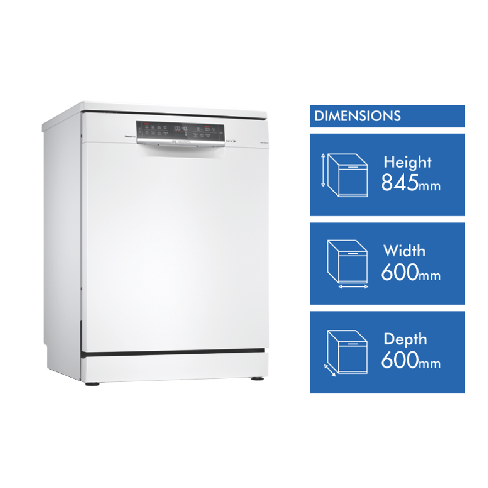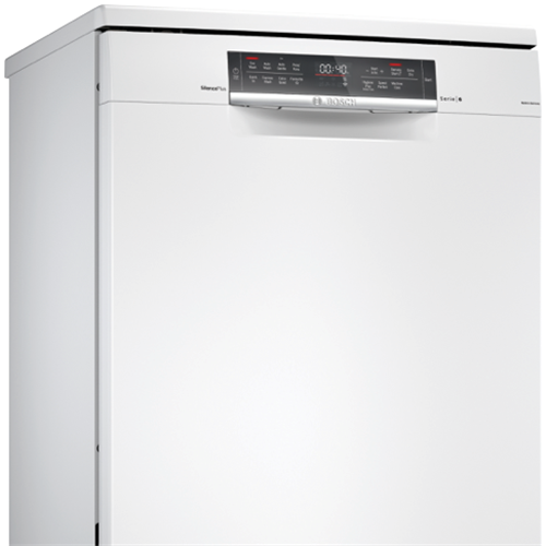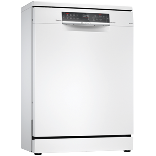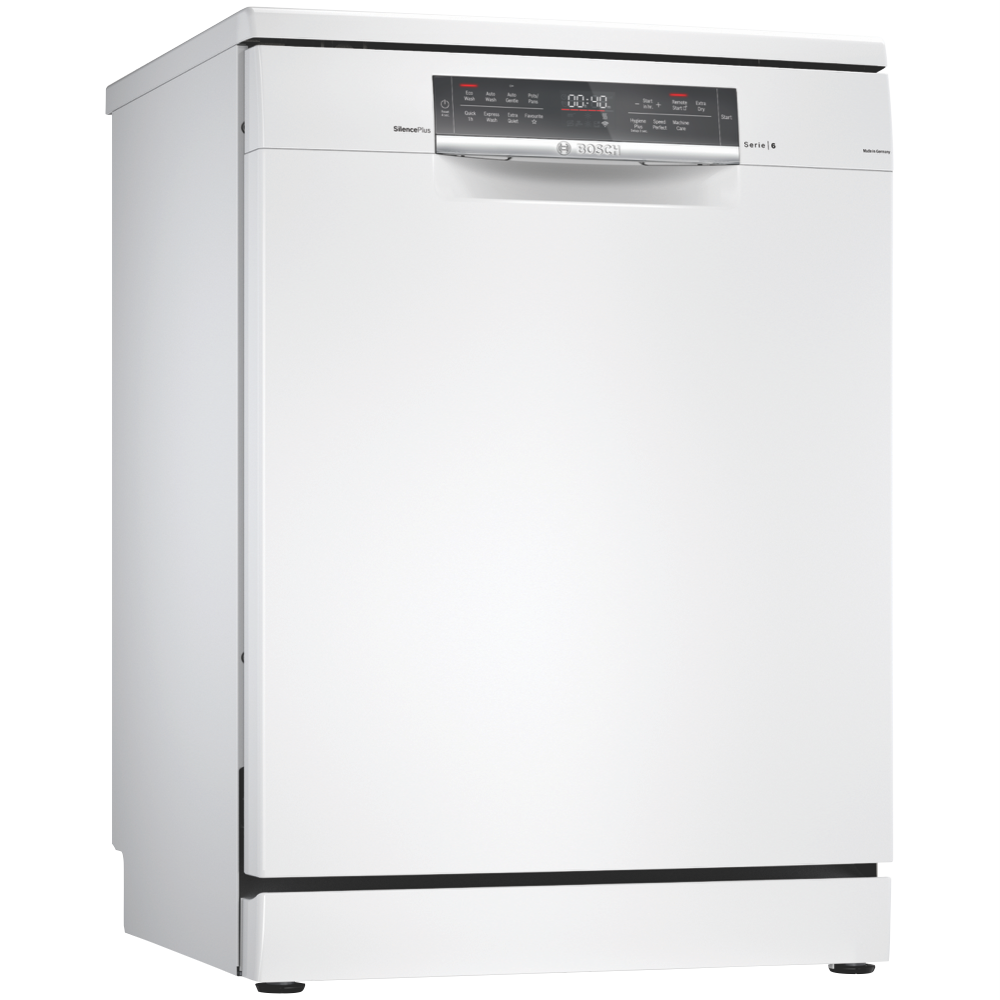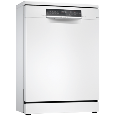 This Wi-Fi connected Bosch Series 6 60cm Freestanding Dishwasher White SMS6HCW01A offers excellent cleaning results and efficiency in the kitchen with its easy stacking capability and intelligent use of resources while remote operation brings a whole new level of convenience to your every day. Wash a large load of dishes glasses and cutlery with its 15-place setting and have them fit your way with its adjustable racking system and VarioFlex red touchpoints that easily let you know which plate racks can be folded to accommodate various items while an extra loading level up top makes room for utensils and additional cutlery. This Bosch dishwasher utilises just 11 litres per wash on the Eco program with a cold-water connection. It has a 4 Star Energy Rating and a 5.5 Star WELS Water Rating WELS Licence Number D02571. Choose from eight programs including an intensive Pots & Pans clean a sensor-controlled Auto Wash an Express wash for lightly soiled items plus options including SpeedPerfect to reduce cycle time Extra Dry for additional drying or HygienePlus for an increased final rinse temperature for an extended time. With the Bosch Home Connect app on your smartphone review the Easy Start best program recommendations based on your input on the type of dishes and cleaning preference option selected view the estimated water and energy consumption of each program or adjust a wash option even after the program has started.