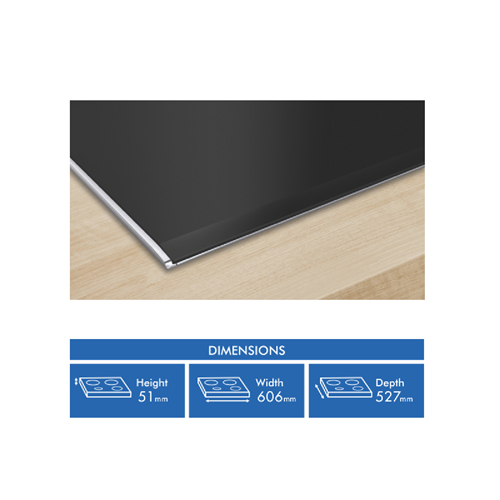 Enhance your cooking experience with this sleek and impressive Bosch 60cm induction cooktop. Its four cooking zones allow you to prepare multiple dishes at once while the Pause function lets you conveniently halt cooking when needed. With 17 power levels you can fine-tune heat to suit different recipes or ingredients. The cooktop also features Automatic Pan Recognition to detect pans and adjust heat accordingly as well as a Power Boost function for intense heat when searing or boiling. A digital 2-stage residual heat indicator keeps you safe even after cooking by showing which areas are still hot. With additional highlights like DirectSelect buttons Favourite Button PowerTransfer and Automatic Zone Selection this induction cooktop takes convenience to the next level. At 527mm deep and 606mm wide its space-saving design allows flexible installation. With a stylish black finish and modern touch controls this Bosch cooktop will complement any contemporary kitchen. Covered by a 2 year warranty for peace of mind. Part number PXX695HC1E.