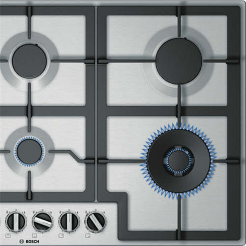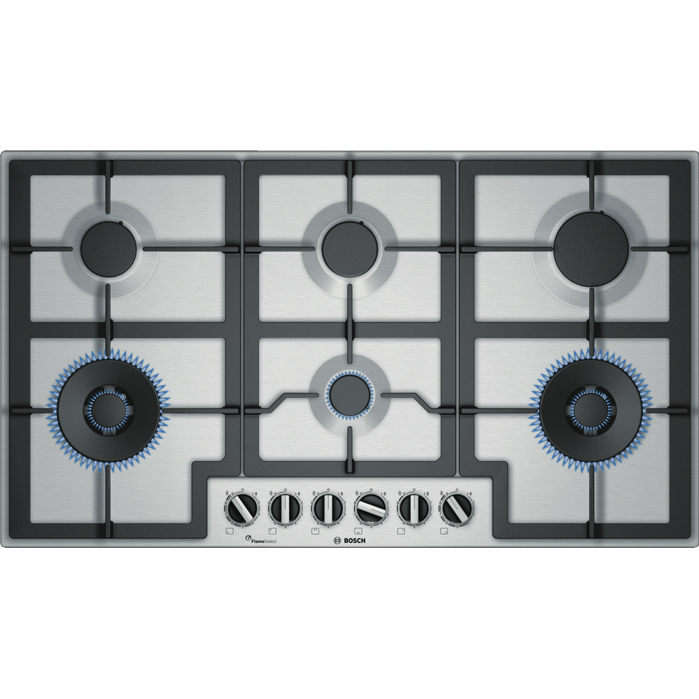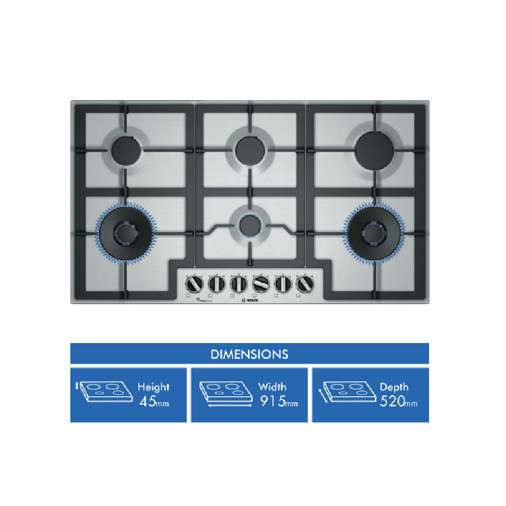 Experience the joy of effortless cooking with the Bosch 90cm Gas Cooktop. This sleek black cooktop featuring stainless steel accents brings professional-grade power to your kitchen. Six burners including a dual flame wok burner provide precise heat control so you can simmer sauces or sear steaks with ease. The one-hand electronic ignition and flame failure safety device offer reliable and safe operation every time. Cook like a pro with the cast iron trivets and enamel coating that are built to last. Use the FlameSelect feature to fine-tune heat in nine incremental steps. Whip up everything from weekday dinners to weekend feasts for the whole family on this spacious 90cm cooktop. With the included cross support for espresso and WOK attachment ring specialty coffee and stir fry dishes are a breeze. Bring restaurant quality cooking home with the Bosch Gas Cooktop. Its durable components and 2 year warranty give you peace of mind. The manufacturer's part number for this product is PCT9A5B90A. Discover how this cooktop can make meal prep faster and more enjoyable.