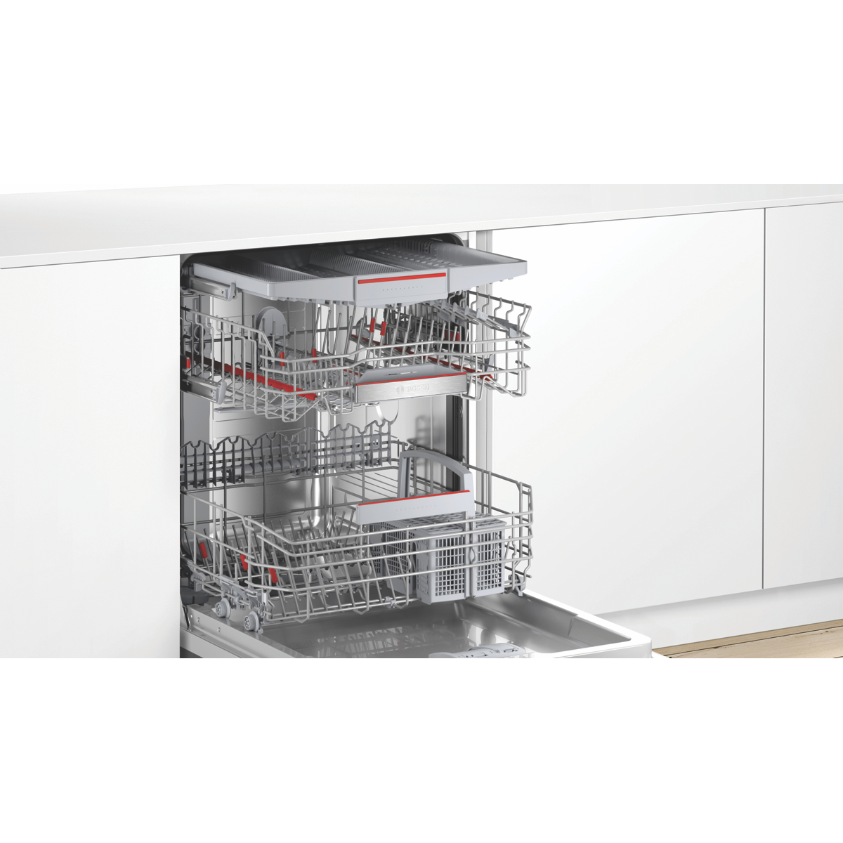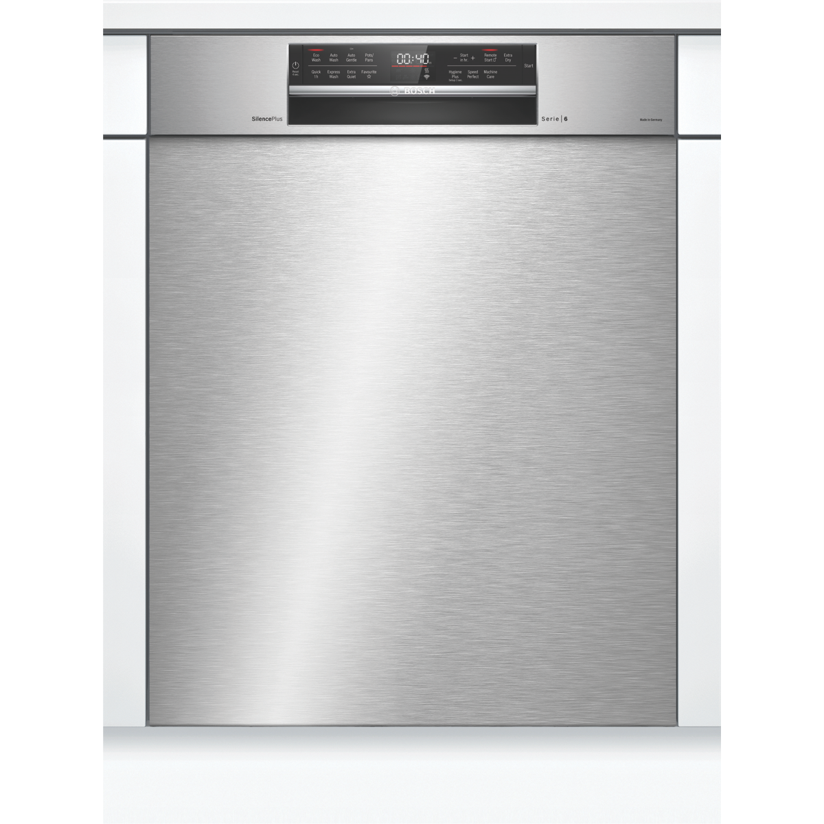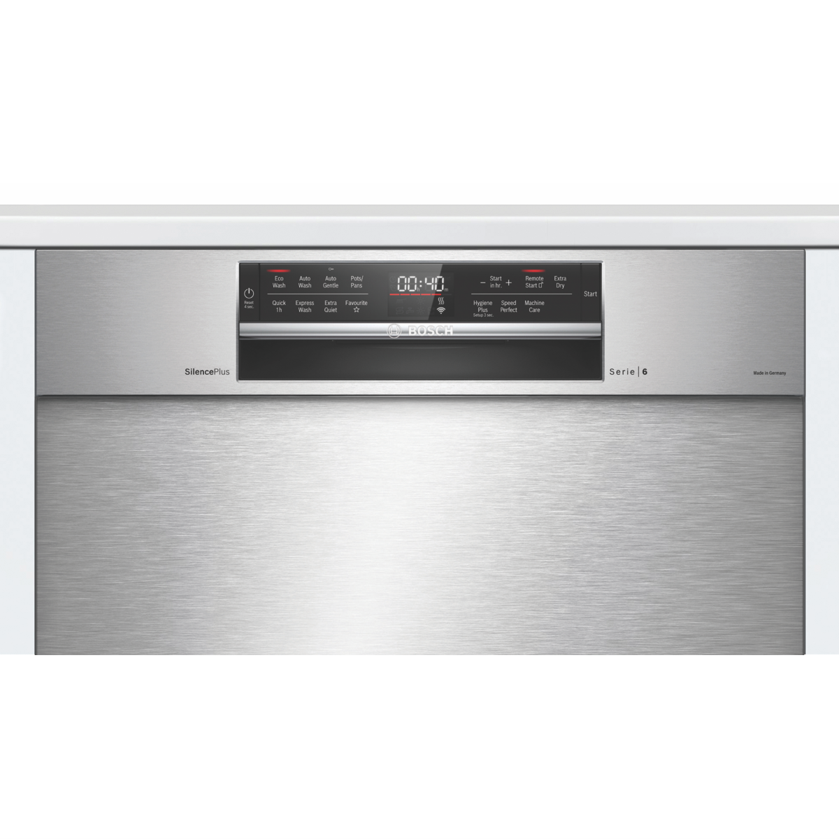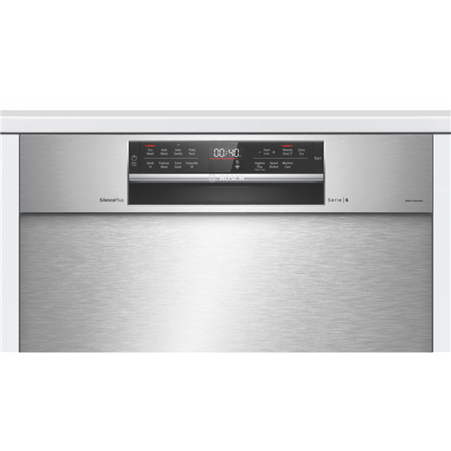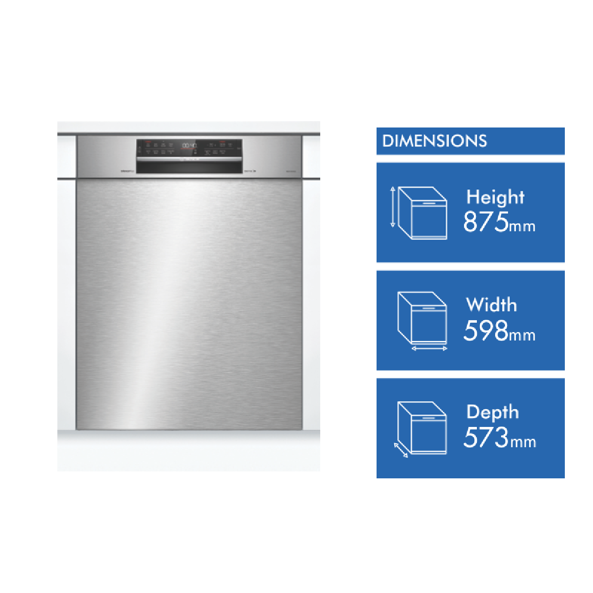 This German made Bosch Series 6 60cm Under Bench Dishwasher Stainless Steel SMU6HCS01A leaves your dinnerware and glassware sparkling clean using minimal resources while remote operation via Wi-Fi connectivity brings a whole new level of convenience to your everyday. Wash a large load of dishes glasses and cutlery with its 15-place setting and have them fit your way with its adjustable racking system and VarioFlex red touchpoints to help you adjust folding racks to accommodate various size dishes while an extra level up the top provides additional room for knives and serving utensils. This Bosch dishwasher utilises just 11 litres per wash on the Eco program with a cold-water connection. It has a 4 Star Energy Rating and a 5.5 Star WELS Water Rating WELS Licence Number D02572. Choose from eight programs including an intensive Pots & Pans clean a sensor-controlled Auto Wash an Express wash for lightly soiled items plus options including SpeedPerfect to reduce cycle time Extra Dry for additional drying or HygienePlus for an increased final rinse temperature for an extended time. With the Bosch Home Connect app on your smartphone review the Easy Start best program recommendations based on your input on the type of dishes and cleaning preference option selected view the estimated water and energy consumption of each program or adjust a wash option even after the program has started.