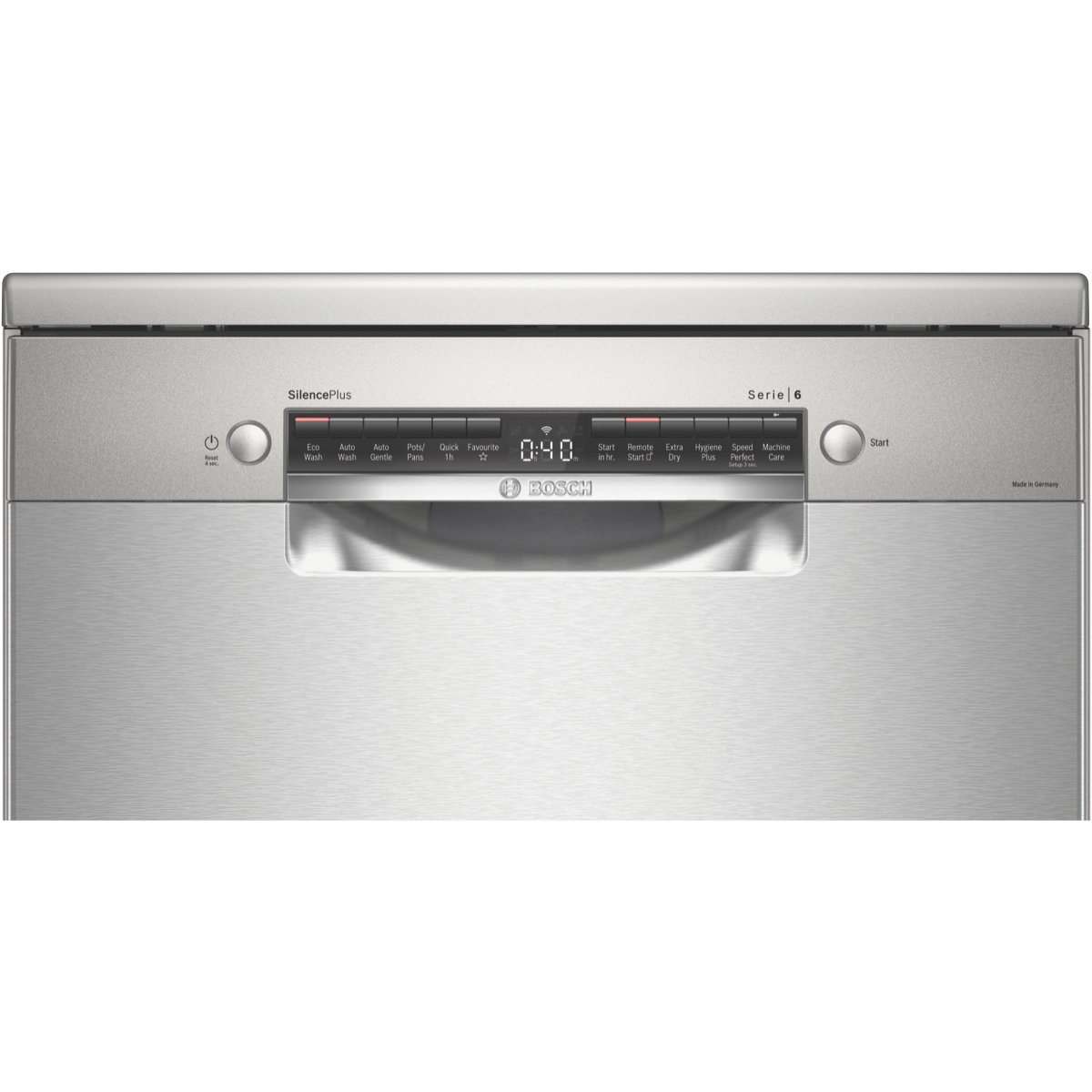 Bring the power of Bosch engineering into your kitchen with this sleek freestanding stainless steel dishwasher. With 14 place settings and 6 wash programs including Eco Wash this energy-efficient dishwasher makes quick work of post-dinner cleanup. The adjustable RackMatic system fits your plates and pans perfectly while the near-silent 44 decibel operation lets you run a cycle any time. Home Connect allows you to control and monitor your dishwasher remotely. With a 4 star energy rating and 5 star WELS water rating this dishwasher saves resources and money. The AquaStop Plus system prevents leaks and the self-cleaning filter needs less maintenance. Make your kitchen complete with this durable high-quality Bosch dishwasher. The manufacturer's part number for this product is SMS6HAI02A.