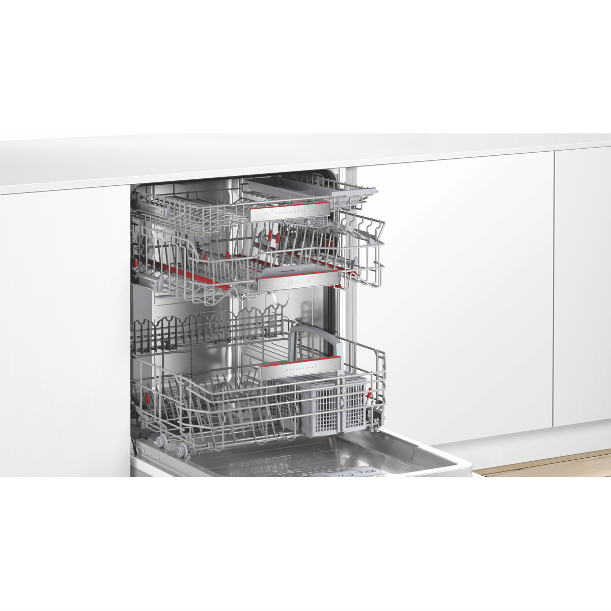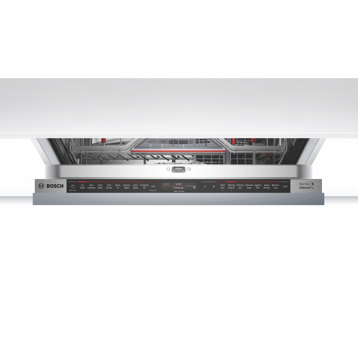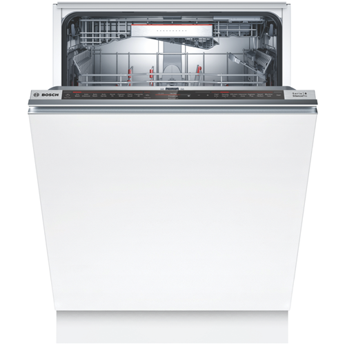 The feature packed Wi-Fi connected Bosch Series 8 Fully Integrated Dishwasher SBV8EDX01A offers total stacking flexibility expertly cleans and dries large loads using minimal resources and allows for remote operation to bring a whole new level of convenience to your every day. Wash an x-large load of dishes glasses cups and cutlery with its 15-place setting and have them fit your way with its adjustable racking system and VarioFlex red touchpoints to adjust folding racks to accommodate dishes of various sizes while an Extra Space third rack makes room for oddly shaped utensils and breakfast bowls so you can wash more at once. This Bosch dishwasher utilises just 11.5 litres per wash on the Eco program with a cold-water connection. It has a 4 Star Energy Rating and a 5 Star WELS Water Rating WELS Licence Number D02598. Eight programs have every cleaning requirement covered from automatic sensor-controlled cycles to shortened wash programs while available options such as SpeedPerfect will reduce cycle time and Efficient Dry will see the door automatically open at cycle completion for improved drying and energy efficiency. With the Bosch Home Connect app on your smartphone review the Easy Start best program recommendations based on your input on the type of dishes and cleaning preference option selected view the estimated water and energy consumption of each program or adjust a wash option even after the program has started.