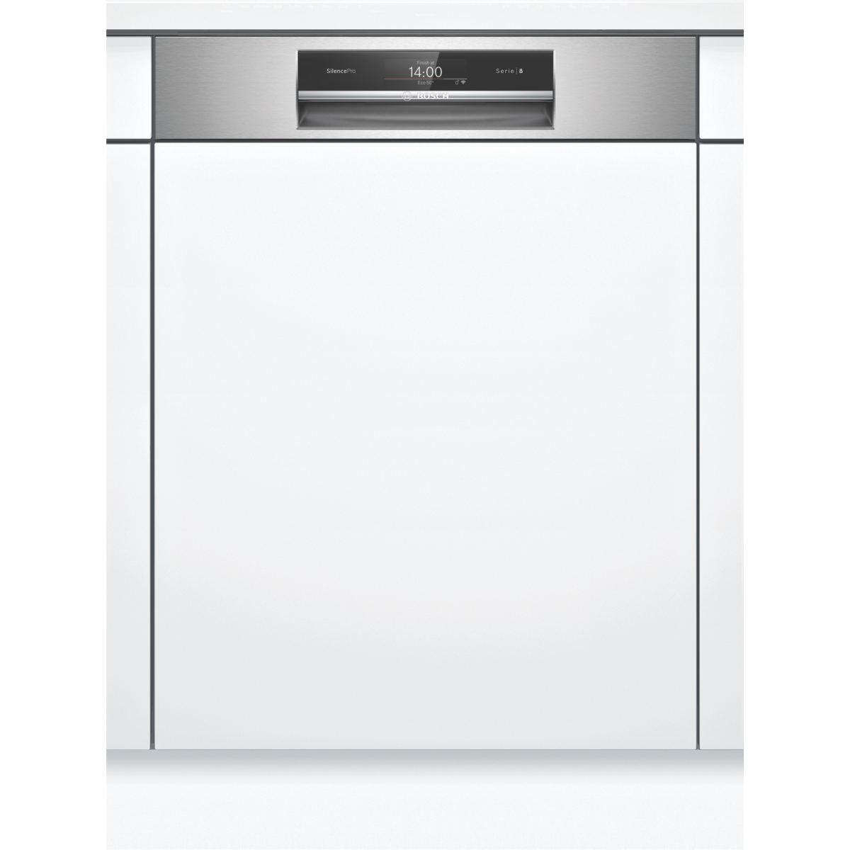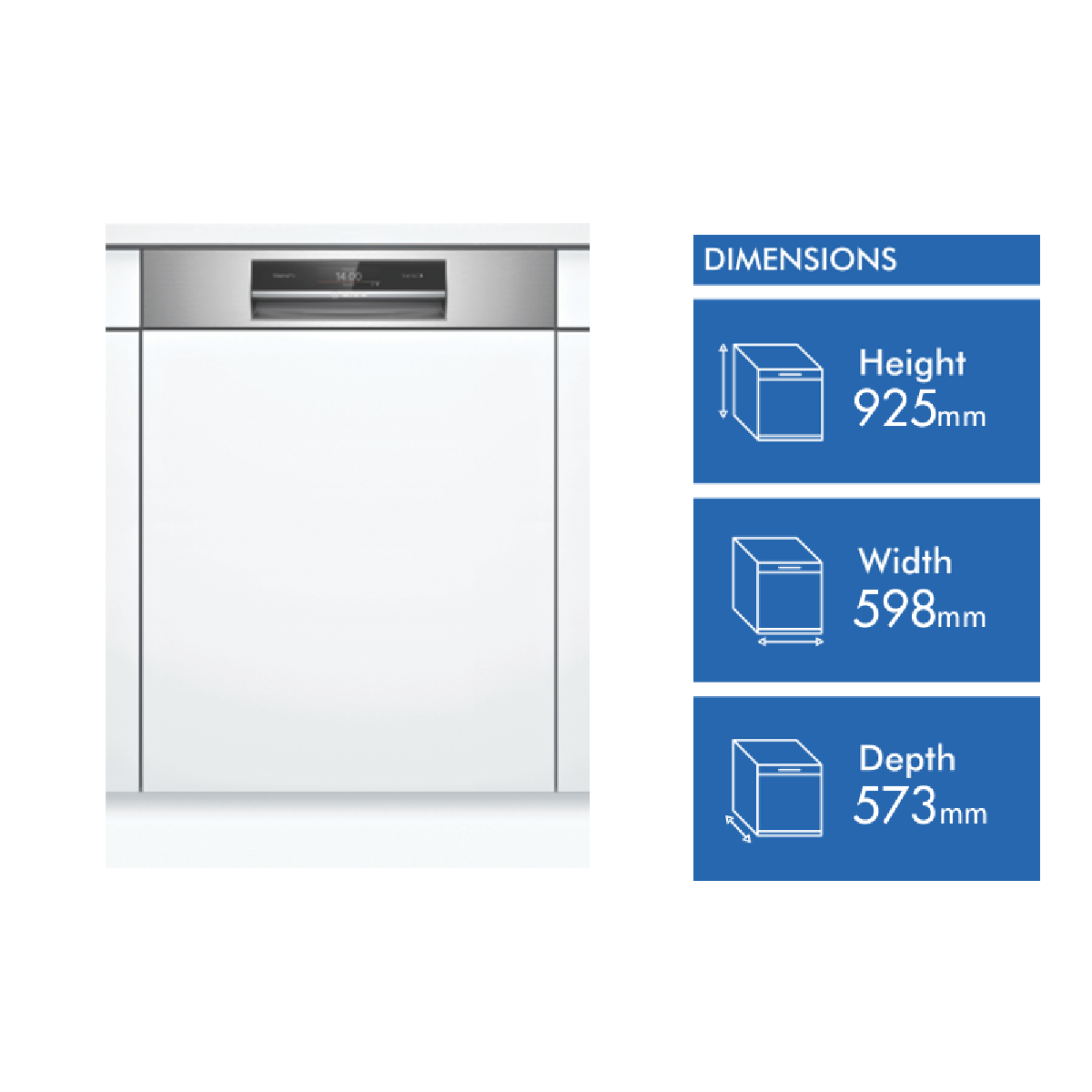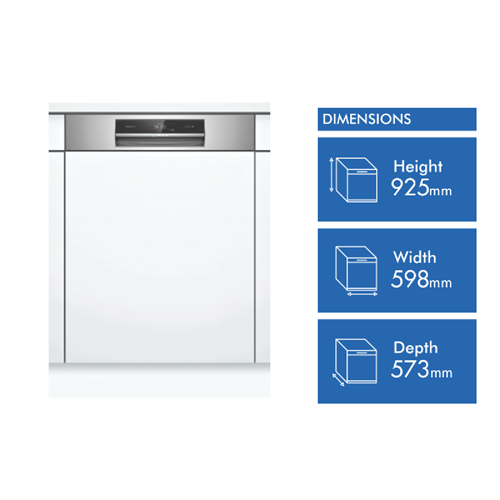 This feature packed Wi-Fi connected Bosch Series 8 Semi Integrated Dishwasher SBI8EDS01A offers total stacking flexibility expertly cleans and dries large loads using minimal resources and allows for remote operation via an app to bring a whole new level of convenience to your every day. A 14-place setting holds plenty of plates bowls cups and serving dishes in various sizes thanks to the upper RackmatickPlus basket that can be height adjusted in three ways to make it fit and VarioFlex red touchpoints that easily let you know which plate racks in the upper or lower baskets can be folded to accommodate them. Plus an Extra Space third rack makes room for oddly-shaped utensils and breakfast bowls so you can wash more at once. This Bosch dishwasher utilises just 11.5 litres per wash on the Eco program with a cold-water connection. It has a 4 Star Energy Rating and a 5 Star WELS Water Rating WELS Licence Number D02597. Eight programs have every cleaning requirement covered from automatic sensor-controlled cycles to shortened wash programs while available options such as SpeedPerfect will reduce cycle time and Efficient Dry will see the door automatically open at cycle completion for improved drying and energy efficiency. With the Bosch Home Connect app on your smartphone review the Easy Start best program recommendations based on your input on the type of dishes and cleaning preference option selected view the estimated water and energy consumption of each program or adjust a wash option even after the program has started.