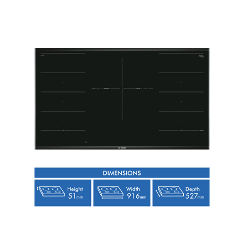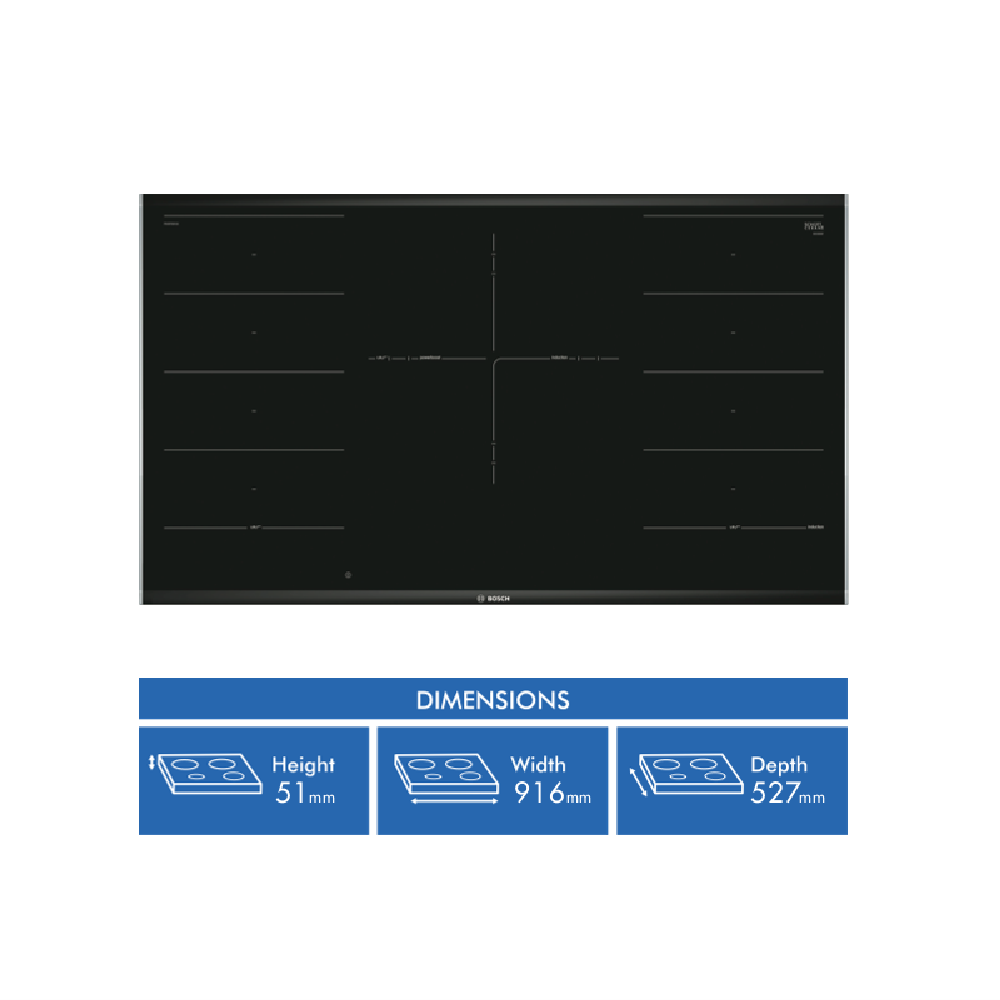 Take your kitchen to the next level with the Bosch 90cm Induction Cooktop. This sleek black cooktop features stainless steel side profiles and a beveled front to add a modern touch to your space. With 5 induction cooking zones 17 power levels and automatic pan recognition you'll have precise control to achieve perfect results every time. The intuitive touch controls power boost function and built-in timer make cooking simple and efficient. Safety features like the child lock residual heat indicators and automatic switch off give you peace of mind. With a width of 916mm height of 51mm and depth of 527mm this cooktop provides ample room for pots and pans of all sizes. Bring innovative induction technology into your home with the Bosch 90cm Induction Cooktop. With a 2 year manufacturer's warranty and installation by a licensed electrician you can count on this cooktop to deliver exceptional performance and convenience for years to come. The manufacturer's part number for this product is PXV975DV1E.