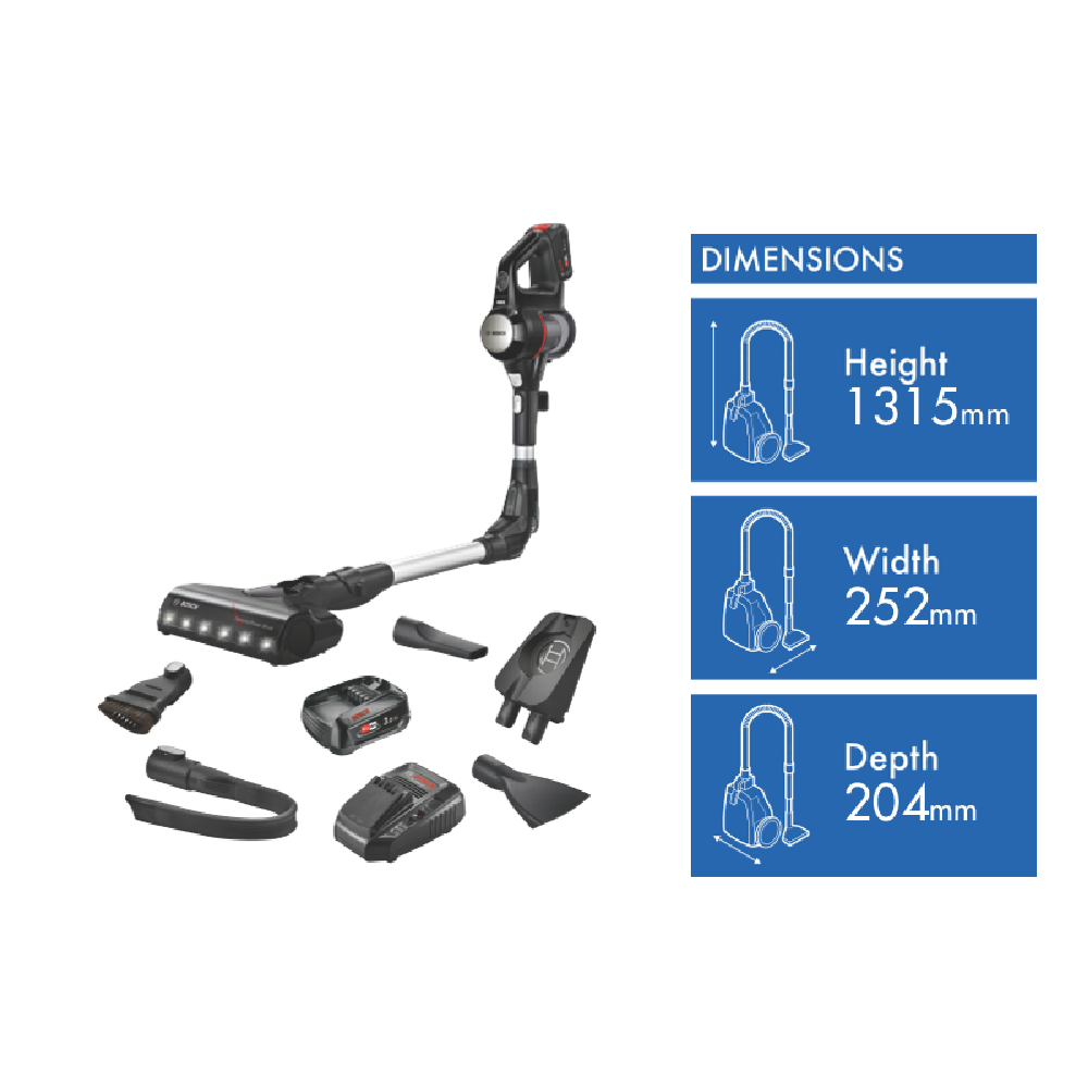 The new Unlimited 7 features an innovative 90° bendable tube for easy and ergonomic cleaning under furniture. Other convenient functions include the LED floor lights the Nozzle Foot Release for an effortless switch to overhead cleaning and the Easy Parking Clip. Enjoy more versatility! The convenient Flex Tube makes it possible to reach places under low furniture effortlessly the Easy Parking Clip lets you securely hold the vacuum in place during breaks and the Quick Stand allows flexible cleaning with the handheld while the nozzle and tube stand by themselves. With the Nozzle Foot Release you can detach the nozzle from the tube without bending over to easily switch to spot cleaning with the practical tube. This makes the Unlimited 7 perfect for cleaning all types of floors and surfaces as well as hard-to-reach areas. With the powerful and enduring 3.0 Ah Power For All battery from Bosch even demanding cleaning tasks can be mastered effortlessly. The lithium-ion battery is rechargeable exchangeable and protected against overheating overcharging self-discharge and memory effect. In addition the battery offers up to 40 minutes runtime(7) for each battery ensuring powerful performance and long runtimes. Enjoy optimal cleaning results on all floors and surfaces and even in the darkest places. With the powerful motorized brush you can achieve dust pickup of up to 99.9%(4). Thanks to the powerful built-in LED lights you can spot and remove dirt and dust even in hard-to-see places like behind furniture or in dark corners. So you can feel comfortable in a clean home in no time. Save time and energy thanks to the Quick Stand function. Switch easily and effortlessly from floor cleaning with the vacuum cleaner to mid-level cleaning with the handheld vacuum cleaner. While cleaning with the handheld the nozzle and tube simply stand by themselves. You don't have to put the vacuum cleaner on the floor or return it to the docking station. Afterwards you simply put the handheld back into the tube and continue cleaning the floor. Different vacuuming tasks require different modes. The vacuum cleaner provides a control interface with 3 power modes for every challenge. Turbo boosts performance for difficult tasks by providing as much performance as a corded vacuum cleaner.(2) The intelligent Auto mode adjusts performance and runtime depending on the floor and surface whether carpet or hard floor. And Eco provides extra-long optimal runtime for everyday cleaning tasks. Disclaimers: (4)Dust pickup measured in Turbo mode on hard floors with crevices. Tested according to EN 60312-1:2017.(3)Terms of guarantee on https://www.bosch-home.com.au/metapages/warranty(4)Dust pickup measured in Turbo mode on hard floors with crevices. Tested according to EN 60312-1:2017.(5)Compared to our previous Unlimited Serie 6 BCS61113AU. Tested according to EN 60312-1:2017.(7)Compared to the 2.5Ah 18V Power For All battery in Eco mode without electrical nozzle from our previous Unlimited Serie 6 BCS6111AU. Tested according to EN IEC 62885-4:2020.(8)Measured in Eco mode internally based on standard EN 60312-1:2017 section 5.1 5.3.(0)Tested according to EN 60312-1:2017.