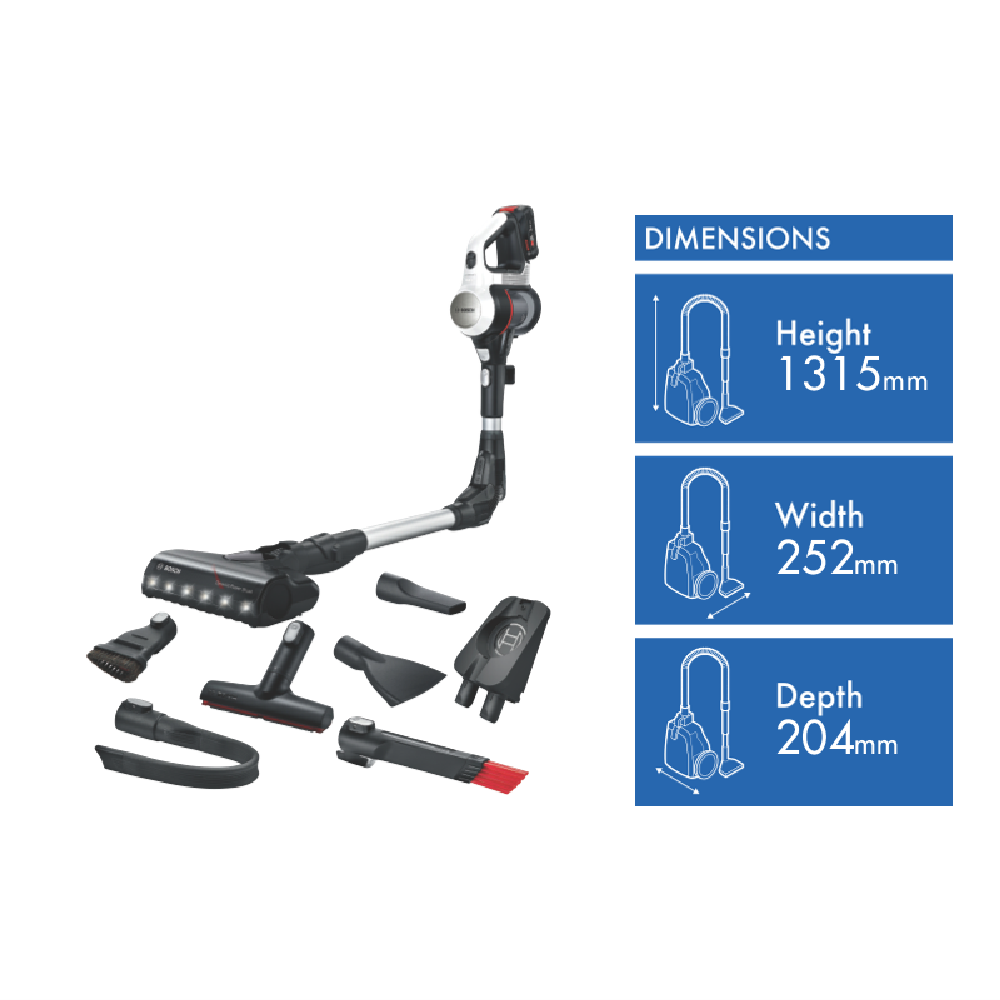 The new Unlimited 7 features an innovative 90° bendable tube for easy and ergonomic cleaning under furniture. Other convenient functions include the LED floor lights the Nozzle Foot Release for an effortless switch to overhead cleaning and the Easy Parking Clip. njoy more versatility! The convenient Flex Tube makes it possible to reach places under low furniture effortlessly the Easy Parking Clip lets you securely hold the vacuum in place during breaks and the Quick Stand allows flexible cleaning with the handheld while the nozzle and tube stand by themselves. With the Nozzle Foot Release you can detach the nozzle from the tube without bending over to easily switch to spot cleaning with the practical tube. This makes the Unlimited 7 perfect for cleaning all types of floors and surfaces as well as hard-to-reach areas.With the powerful and enduring 3.0 Ah Power For All battery from Bosch even demanding cleaning tasks can be mastered effortlessly. The lithium-ion battery is rechargeable exchangeable and protected against overheating overcharging self-discharge and memory effect. In addition the battery offers up to 33% more runtime(7) ensuring powerful performance and long runtimes.Enjoy optimal cleaning results on all floors and surfaces and even in the darkest places. With the powerful motorized brush you can achieve dust pickup of up to 99.9% . Thanks to the powerful built-in LED lights you can spot and remove dirt and dust even in hard-to-see places like behind furniture or in dark corners. So you can feel comfortable in a clean home in no time. Save time and energy thanks to the Quick Stand function. Switch easily and effortlessly from floor cleaning with the vacuum cleaner to mid-level cleaning with the handheld vacuum cleaner. While cleaning with the handheld the nozzle and tube simply stand by themselves. You don't have to put the vacuum cleaner on the floor or return it to the docking station. Afterwards you simply put the handheld back into the tube and continue cleaning the floor. Different vacuuming tasks require different modes. The vacuum cleaner provides a control interface with 3 power modes for every challenge. Turbo boosts performance for difficult tasks by providing as much performance as a corded vacuum cleaner.² The intelligent Auto mode adjusts performance and runtime depending on the floor and surface whether carpet or hard floor. And Eco provides extra-long optimal runtime for everyday cleaning tasks. Disclaimers: Dust pickup measured in Turbo mode on hard floors with crevices. Tested according to EN 60312-1:2017.(3)Terms of guarantee on https://www.bosch-home.com.au/metapages/warranty(4)Dust pickup measured in Turbo mode on hard floors with crevices. Tested according to EN 60312-1:2017.(5)Compared to our previous Unlimited Serie 6 BCS61113AU. Tested according to EN 60312-1:2017.(7)Compared to the 2.5Ah 18V Power For All battery in Eco mode without electrical nozzle from our previous Unlimited Serie 6 BCS6111AU. Tested according to EN IEC 62885-4:2020.(8)Measured in Eco mode internally based on standard EN 60312-1:2017 section 5.1 5.3.(0)Tested according to EN 60312-1:2017.