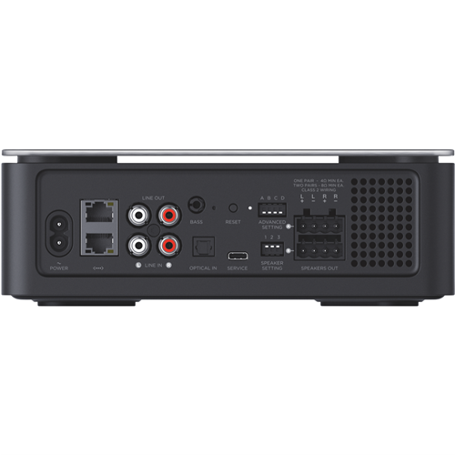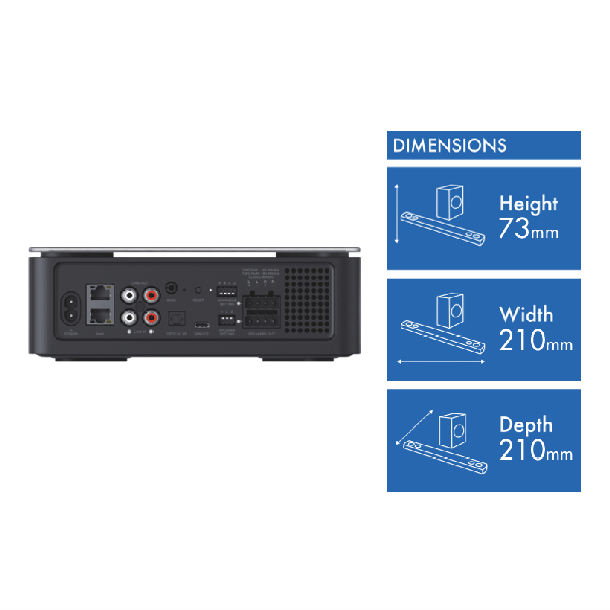 Connections Power, Ethernet, analogue, optical, USB (service only), Outputs: Ethernet, analogue, bass, two sets of speakers