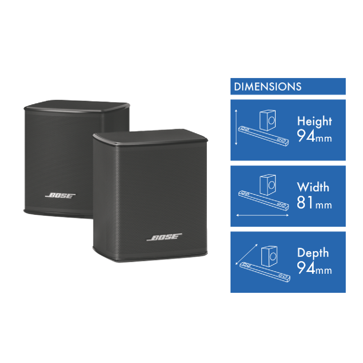 Experience the impact of explosions crashes and loud sound effects around you with the Bose Surround Speakers 809281-5110. Optimised to exclusively pair with the both Bose Soundbar 500 and Bose Soundbar 700 the Surround Speakers provide sweeping and atmospheric sound to your favourite music movies sports and TV shows. Set-up is simple with the speakers wirelessly connecting the Bose Soundbar 500 or 700 via the included wireless receivers. Standing just below 10cm the Bose Surround Speakers compliment your existing home entertainment setup with consistent high quality audio.