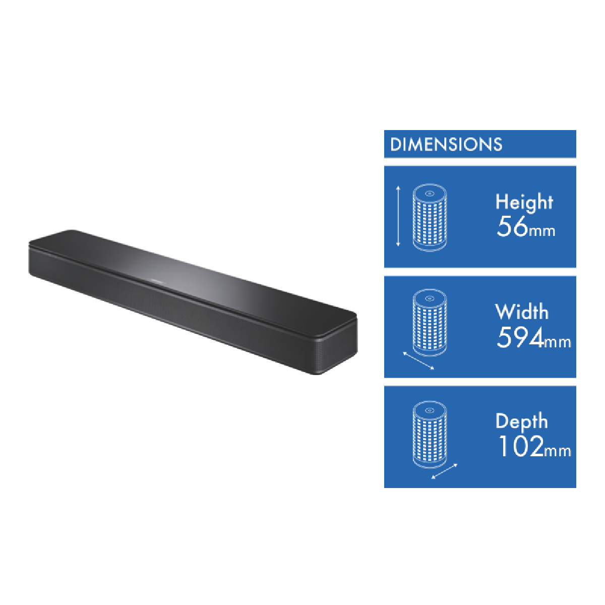 Your one stop TV audio solution is here with the Bose TV Speaker 838309-5110. With its small 5cm compact design the speaker provides a large variety of high-end performance features; two full-ranged speakers produce a wide range of spatial sound alongside the centre tweeter which filters speech for overall clearer dialogue. Also you can further enhance vocal quality via the Dialogue mode feature. Set-up is easy with one power cable and one optical cable to connect within minutes you have access to amazing audio from your favourite movies sports and TV shows. Connect wirelessly to your smart device via Bluetooth to play the best playlists music and podcasts. To take the next step to increase the quality of home entertainment soundscape connect either the compatible Bose Bass Module 500 or Bose Bass Module 700 devices.