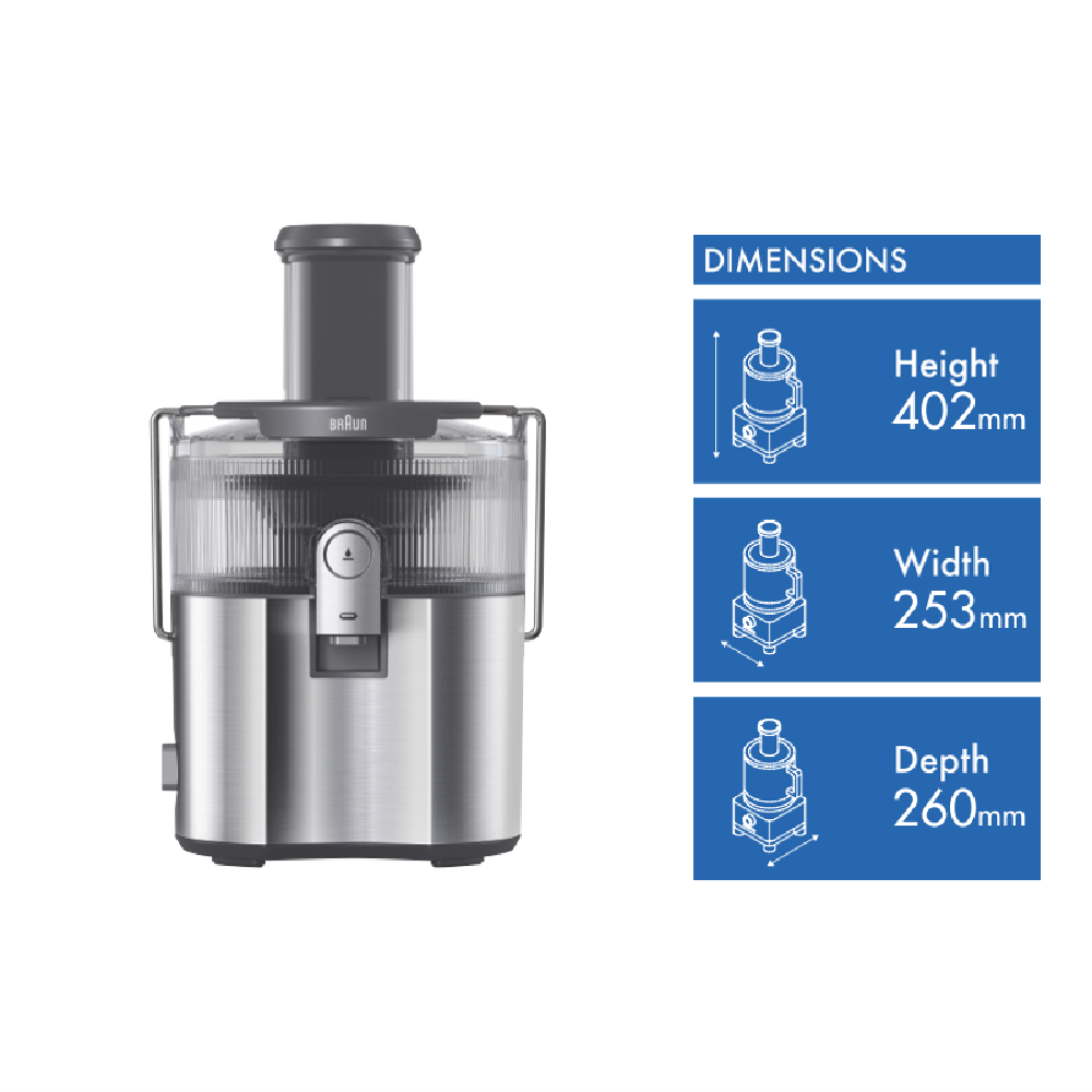 Looking to make healthy juices at home without the hassle? This stainless steel juicer lets you turn whole fruits and veggies into fresh drinks in no time thanks to its XL filling chute and powerful 1000 watt motor. You can choose from pulse low or high settings with simple push touch controls so you get just the right texture every time. ColdXtract and FastXtract technologies help you enjoy more nutrients and less waiting while the anti-drip system keeps your kitchen bench clean. The large 2 litre pulp container means you can juice up to 2.5 litres without stopping to empty it and the direct serve option makes pouring easy. Safety is covered with a lever that only lets the motor run when everything s locked in place and you ll find cleaning a breeze since the parts are dishwasher safe. The MultiJuice 7 Spin juicer comes with a foam separator jug and a handy cleaning brush with a spatula end so you re ready to go right out of the box. With dimensions of 402 millimetres high 253 millimetres wide and 260 millimetres deep and weighing just 4.4 kilograms it fits easily on your bench. Enjoy peace of mind with a two year warranty. Model SJ7000. Give your mornings a fresh start with homemade juice whenever you like.